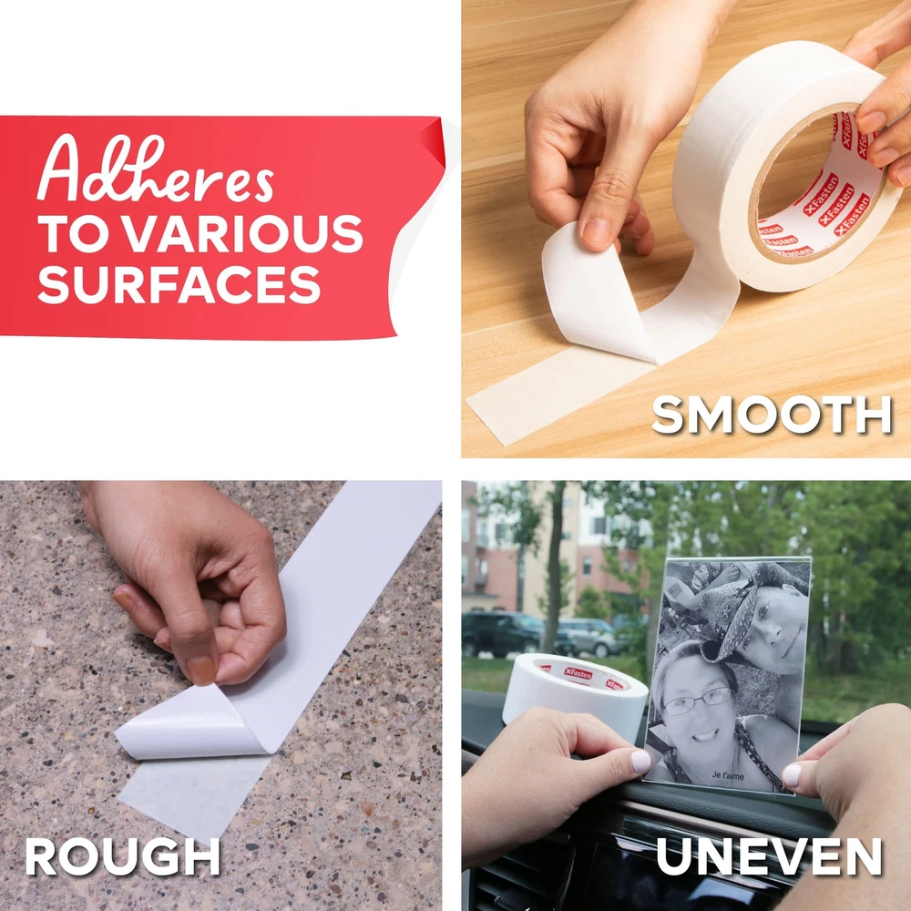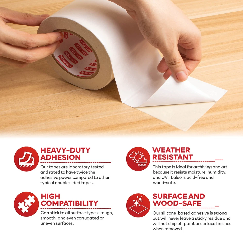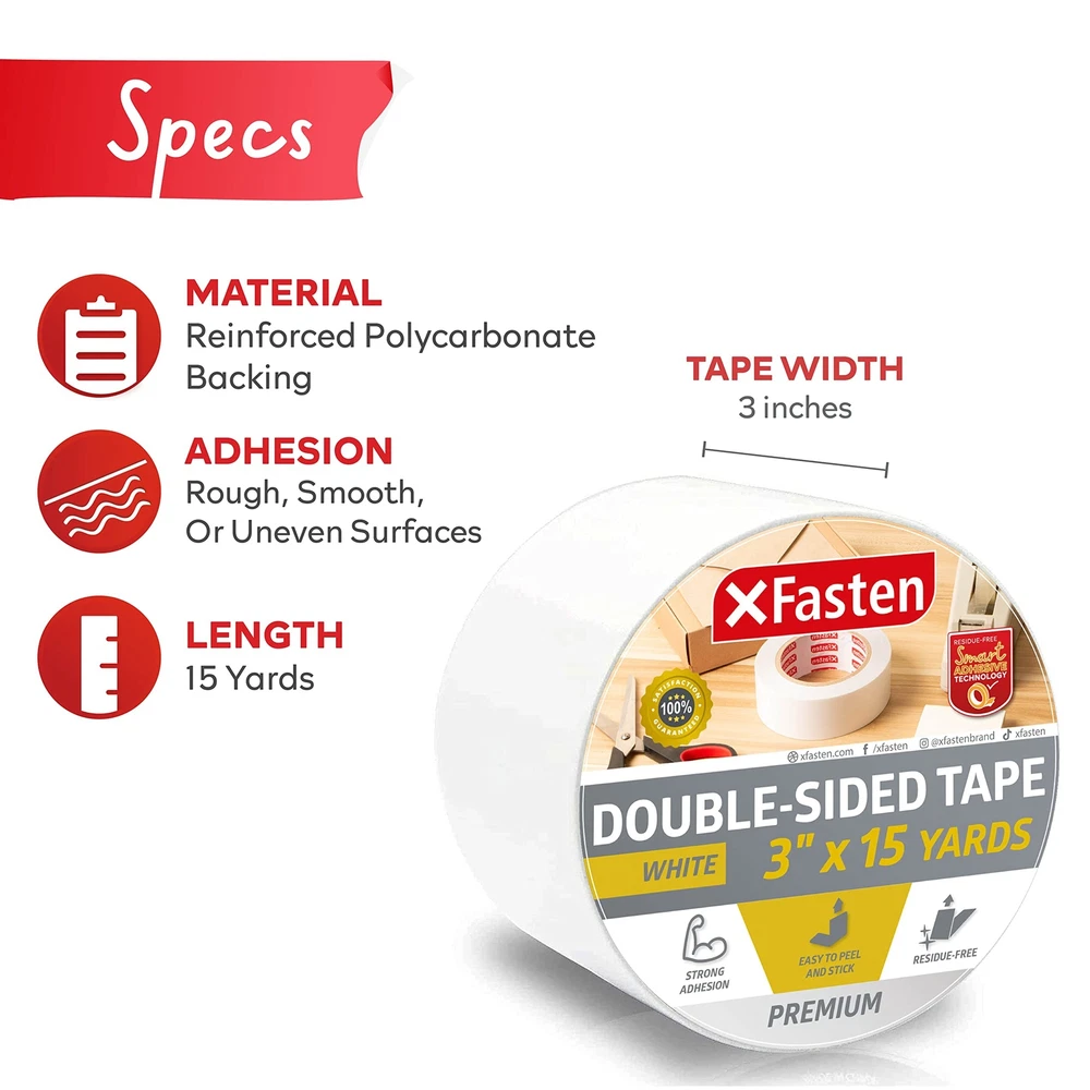 XFasten Double Sided Tape, Removable, 3-Inch by 15-Yards, Single Roll, Residu... Product Overview Size: 3-Inches x 15-Yards Read more The XFasten White Double-Sided Tape adheres to smooth, rough as well as uneven, and corrugated surfaces - perfect for other industrial hobby activities and purposes that require stable adhesion. It has the perfect balance of strength and gentleness to even the most delicate surfaces. The XFasten White Double-Sided is UV resistant, humidity, heat, moisture and extreme temperatures. All-rounder tape that is perfect for both indoor and outdoor applications. The XFasten White Double-Sided Tape is ideal for surface protection of leather seats, sofas, and furniture from pet scratches, sealing, light repairing, and other adhesion applications. The XFasten White Double-Sided Tape sports a durable nylon-cotton cloth inside layer sandwiched with a strong adhesive on both sides.Best of all, it doesn't leave any residues behind. Read more Versatility and Multi Purpose Be mindful of different surfaces - There are different double sided tape for different applications and surfaces, so make sure to check if your adhesive is compatible with the surface you will adhere to. The XFasten Double Sided Tape is compatible with most surface materials. Take your environment into consideration - Consider the type of environment where you will be using the double sided tape. You should know if the place has a low temperature or hot and wet conditions. Most of XFasten’s Double Sided Tapes are temperature- resistant. Ensure that the area is clean - Before installation, you have to make sure that the surface is free of lint, dirt, and dust because it can significantly lessen the bonding strength of the adhesive. Read more XFasten Double Sided Tape XFasten Double Sided Tape XFasten Double Sided Tape XFasten Double Sided Tape XFasten Double Sided Tape XFasten Double Sided Tape Size 2" x 30 Yards 1.5" x 15 Yards 1/2" x 20 Yards 1/4" x 20 Yards 2" x 15 Yards 3/4" x 15 Yards Usage Ideal for surface protection from pet scratches,sealing, repairing, and other mounting applications Ideal for surface protection from pet scratches,sealing, repairing, and other mounting applications Ideal for surface protection from pet scratches,sealing, repairing, and other mounting applications Ideal for surface protection from pet scratches,sealing, repairing, and other mounting applications Ideal for surface protection from pet scratches,sealing, repairing, and other mounting applications Ideal for surface protection from pet scratches,sealing, repairing, and other mounting applications Material Type Fabric Nylon-Cotton Reinforced Polycarbonate backing Reinforced Polycarbonate backing Double Sided Fabric Adhesive Strips Double Sided Fabric Adhesive Strips Residue-Free ✓ ✓ ✓ ✓ ✓ ✓ Double-Sided ✓ ✓ ✓ ✓ ✓ ✓ Color White White White White Cream White Cream White Quantity Single Pack Single Pack 6 pack 8 pack Single 3 pack Features Durable Double Sided Tape: Adheres to smooth, rough as well as uneven surfaces- perfect for CNC machine wood working, guitar making and other industrial hobby activities that require stable adhesion. With 3" width, it can accommodate more space allowing it to have a higher maximum weight bearing capacity. Adhesive is extremely strong but is still easy to remove, cut and peel by hand. Ideal for surface protection of leather seats, sofas and furniture from pet scratches, sealing, light repairing, and other adhesion applications. Will not leave a sticky residue when removed and will not chip-off surface paint finishing. Weather-resistant duct tape: resists moisture, humidity, UV, and extreme temperatures. Details Brand: XFasten Color: White Material: Poly-carbonate Film Tape Number of Items: 1 Size: 3-Inches x 15-Yards Compatible Material: Wood,furniture,industrial,leather Manufacturer: XFasten Item Weight: 1.3 pounds Package Dimensions: 4.61 x 4.61 x 3.03 inches Item model number: DST315 Is Discontinued By Manufacturer: No Material Type: Poly-carbonate Film Tape Manufacturer Part Number: DST315 Quality Products Have peace of mind knowing that your order will arrive original factory sealed packaging. That means that you'll have the full force of the manufacturer's warranty to protect your purchase. Fast and Free Shipping You're already purchasing the item. Why pay additional for shipping, especially slow shipping? We get your order shipped out and delivered to your doorstep as quickly as possible. Commitment We are committed to making sure that you leave this transaction satisfied. That means having access to real people that get your questions and concerns answered quickly. Give us a shot and we will make sure that you will look to us again!