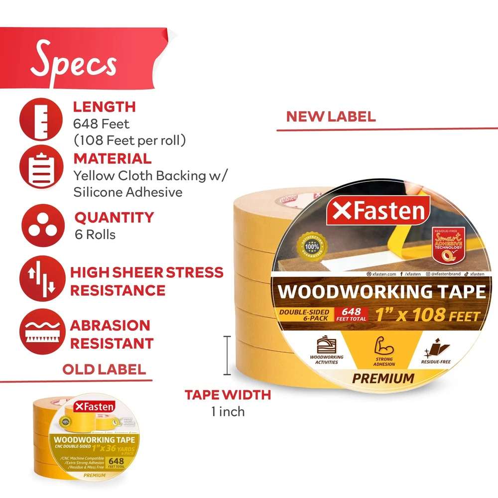 XFasten Double Sided Tape Woodworking Tape 1-Inch x 36-Yards, 6-Pack Double S... Product Overview Size: 1 Inch x 36 Yards (6 Pack) About The XFasten Woodworking Tape Why Choose The XFasten Woodworking Tape? Easy to Manage This two-faced tape for woodworking has an anti-curling backing that prevents it from curling and sticking into your hands upon installation. Industrial-Grade Adhesive Equipped with an industrial-grade adhesive with strong shear resistance. It does not leave off residue nor damage or chip off the wood surface. Optimal Thickness Perfect for woodworking activities such as splicing, machine cutting, CNC woodworking, and anchoring because of its optimal thickness. Excellent Adhesion Woodworkers trust this double-sided tape for CNC routers because of its solid tensile strength that can withstand high rotational speeds. Previous page Next page 1 Test Your Tape First 2 Set For 12 Hours 3 Use Heat Technique What's the difference between the XFasten Woodworking Tape and XFasten Double Sided Tape? The XFasten Woodworking Tape is more ideal for woodworking activities because of its specially calibrated adhesive. The double-sided tape is much more suitable for home and office uses. Can the XFasten Woodworking Tape adhere to painted wood? Yes. It adheres on all types of wood - be it treated, untreated, painted, stained, and sanded. Moreover, the XFasten Woodworking Tape adheres to both smooth and textured surfaces as long as the surface is dry and free of dust and dirt. Can you tear the XFasten Woodworking Tape by hand? Yes, it can be torn cleanly by bare hands. It's also easy to install and has an easy- release yellow adhesive liner. Can you use the XFasten Woodworking Tape on MDF Fiberboards? Yes. The XFasten Woodworking Tape is compatible to all wood types - including MDF fiberboards. The XFasten Woodworking Tape Collection Woodworking Tape Woodworking Tape Woodworking Tape Woodworking Tape Woodworking Tape Woodworking Tape Woodworking Tape Double Sided ✔ ✔ ✔ ✔ ✔ ✔ ✔ Adhesive Color White White White White White White White Material Type Silicone Adhesive Silicone Adhesive Silicone Adhesive Silicone Adhesive Silicone Adhesive Silicone Adhesive Silicone Adhesive Tape Width 1" 1/2" 1" 1" 2.5" 3" 4" CNC Compatibility ✔ ✔ ✔ ✔ ✔ ✔ ✔ Residue-Free ✔ ✔ ✔ ✔ ✔ ✔ ✔ Features INDUSTRIAL STRENGTH DOUBLE SIDED WOODWORKING TAPE. The 6-Pack XFasten Double sided Tape for Woodworking is a CNC machine tape thats designed to secure wood templates for high speed routers without damaging delicate wood surfaces upon removal. MADE BY WOODWORKERS, FOR WOODWORKERS. XFasten is the home of the original wood crafter double sided tape as we collaborated with woodworkers from Texas and social media platforms to create the best wood tape that contains just the right thickness. SUPER STRONG BUT RESIDUE-FREE AND WOODSAFE. The XFasten thin double stick tape for woodworking is rated to withstand high-speed rotations of even 20,000 rpm from CNC routers while still being removable, wood-safe, surface-safe, and residue-free. EASY-TO-PEEL AND STICK. Equipped with a quick-release adhesive liner, this scroll saw tape is designed for fast and quick operations- allowing you to quickly cut, peel off, and stick the CNC tape on wood templates without wasting any of your time. VERSATILE DOUBLE FACED TAPE FOR WOOD WORKING. Our Double sided Tape Woodworking can be used for delicate wood materials, high-speed CNC machine work, and for woodworking activities such as splicing, machine cutting, routing, and anchoring. ALL-AROUND REMOVABLE DOUBLE SIDED WOOD WORKING TAPE. The silicone adhesive on our Woodturners tape is compatible not only with wood but also with MDF surfaces, acrylic, glass, metal, brass, polycarbonate, and other common industrial materials. WE VALUE YOUR SAFETY. A Wood template tape should be firm even on high-torque machines so as to protect the user and their project. A woodworker double sided tape should also not damage the surface upon removal. The XFasten Double sided tape for woodturning is designed to do both, excellently! REMOVABLE, RESIDUE-FREE, AND SURFACE SAFE. Our Template Tape for Woodworking is strong but it will not damage the surface upon removal. The XFasten Double sided Tape is easy to install, stable once on the surface, but easy to peel off once done. TRUSTED YELLOW BACKING DOUBLE SIDED WOODWORKER'S TAPE. This Double Sided Tape for CNC routers comes in a 6-Pack set at 36 yards per roll, giving you a total of 216 yards. This pack can go a long way! NO MORE GLUE AND BLUE PAINTERS TAPE. Gone are the days when a woodworker had to resort to the messy solution of applying super glue on painters tape. The XFasten Double sided masking tape is designed to do just that, without the mess or the risk of residue. XFasten is the only brand that produces quality double face woodworker's tape for woodworkers! Details Package Dimensions : 6.02 x 5.94 x 5.67 inches; 3.84 Pounds Date First Available : February 23, 2022 Manufacturer : XFasten Best Sellers Rank: #2,180 in Industrial & Scientific (See Top 100 in Industrial & Scientific) #28 in Masking Tape #115 in Adhesive Tapes #968 in Hardware #28 in Masking Tape #115 in Adhesive Tapes #968 in Hardware Customer Reviews: 4.7 out of 5 stars 1,512 ratings Quality Products Have peace of mind knowing that your order will arrive original factory sealed packaging. That means that you'll have the full force of the manufacturer's warranty to protect your purchase. Fast and Free Shipping You're already purchasing the item. Why pay additional for shipping, especially slow shipping? We get your order shipped out and delivered to your doorstep as quickly as possible. Commitment We are committed to making sure that you leave this transaction satisfied. That means having access to real people that get your questions and concerns answered quickly. Give us a shot and we will make sure that you will look to us again!