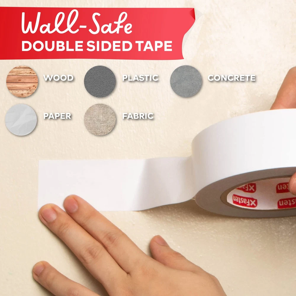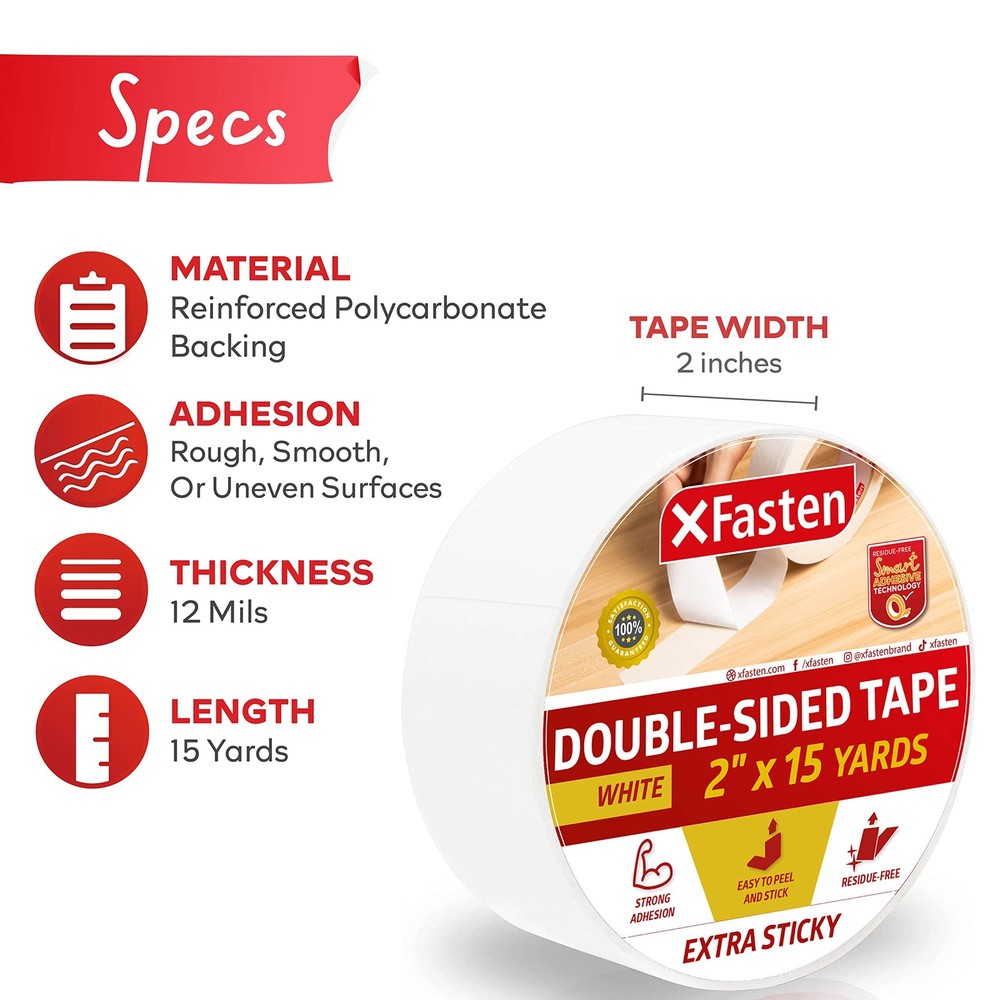 XFasten Extra Sticky Double-Sided Tape, White, 2-inch x 15-Yard, Extreme Bond... Product Overview Size: 2-Inches x 15-Yards (1-Pack) Read more The XFasten White Double-Sided Tape adheres to smooth, rough as well as uneven, and corrugated surfaces - perfect for other industrial hobby activities and purposes that require stable adhesion. It has the perfect balance of strength and gentleness to even the most delicate surfaces. The XFasten White Double-Sided is UV resistant, humidity, heat, moisture and extreme temperatures. All-rounder tape that is perfect for both indoor and outdoor applications. The XFasten White Double-Sided Tape is ideal for surface protection of leather seats, sofas, and furniture from pet scratches, sealing, light repairing, and other adhesion applications. The XFasten White Double-Sided Tape sports a durable nylon-cotton cloth inside layer sandwiched with a strong adhesive on both sides.Best of all, it doesn't leave any residues behind. Read more Versatility and Multi Purpose Be mindful of different surfaces - There are different double sided tape for different applications and surfaces, so make sure to check if your adhesive is compatible with the surface you will adhere to. The XFasten Double Sided Tape is compatible with most surface materials. Take your environment into consideration - Consider the type of environment where you will be using the double sided tape. You should know if the place has a low temperature or hot and wet conditions. Most of XFasten’s Double Sided Tapes are temperature- resistant. Ensure that the area is clean - Before installation, you have to make sure that the surface is free of lint, dirt, and dust because it can significantly lessen the bonding strength of the adhesive. Read more XFasten Double Sided Tape XFasten Double Sided Tape XFasten Double Sided Tape XFasten Double Sided Tape XFasten Double Sided Tape XFasten Double Sided Tape Size 2" x 30 Yards 1.5" x 15 Yards 1/2" x 20 Yards 1/4" x 20 Yards 2" x 15 Yards 3/4" x 15 Yards Usage Ideal for surface protection from pet scratches,sealing, repairing, and other mounting applications Ideal for surface protection from pet scratches,sealing, repairing, and other mounting applications Ideal for surface protection from pet scratches,sealing, repairing, and other mounting applications Ideal for surface protection from pet scratches,sealing, repairing, and other mounting applications Ideal for surface protection from pet scratches,sealing, repairing, and other mounting applications Ideal for surface protection from pet scratches,sealing, repairing, and other mounting applications Material Type Fabric Nylon-Cotton Reinforced Polycarbonate backing Reinforced Polycarbonate backing Double Sided Fabric Adhesive Strips Double Sided Fabric Adhesive Strips Residue-Free ✓ ✓ ✓ ✓ ✓ ✓ Double-Sided ✓ ✓ ✓ ✓ ✓ ✓ Color White White White White Cream White Cream White Quantity Single Pack Single Pack 6 pack 8 pack Single 3 pack Features Extra Sticky Double-Sided Tape that has twice the bonding power to the best-seller XFasten 2 Sided Sticky Tape and Carpet Tape. Perfect for heavy duty applications. High Tack Double sides mounting tape that is ideal for Woodworking, carpet, runners and rug placement, mounting decorations, and other applications that require extreme bonding. Double Sided Adhesive is thick and extremely strong but is still easy to remove, cut and peel by hand. Ideal for surface protection of leather seats, sofas and furniture from pet scratches, sealing, light repairing, and other adhesion applications. Will not leave a sticky residue when removed and will not chip-off surface paint finishing. Perfect for apartment renters, students, and school and office workers. Details Is Discontinued By Manufacturer : No Product Dimensions : 4.61 x 4.61 x 1.97 inches; 10.9 Ounces Date First Available : April 25, 2018 Manufacturer : XFasten Best Sellers Rank: #83,467 in Industrial & Scientific (See Top 100 in Industrial & Scientific) #335 in Mounting Tape #560 in Duct Tape #1,613 in Hardware Adhesives & Sealers #335 in Mounting Tape #560 in Duct Tape #1,613 in Hardware Adhesives & Sealers Customer Reviews: 4.1 out of 5 stars 434 ratings Quality Products Have peace of mind knowing that your order will arrive original factory sealed packaging. That means that you'll have the full force of the manufacturer's warranty to protect your purchase. Fast and Free Shipping You're already purchasing the item. Why pay additional for shipping, especially slow shipping? We get your order shipped out and delivered to your doorstep as quickly as possible. Commitment We are committed to making sure that you leave this transaction satisfied. That means having access to real people that get your questions and concerns answered quickly. Give us a shot and we will make sure that you will look to us again!