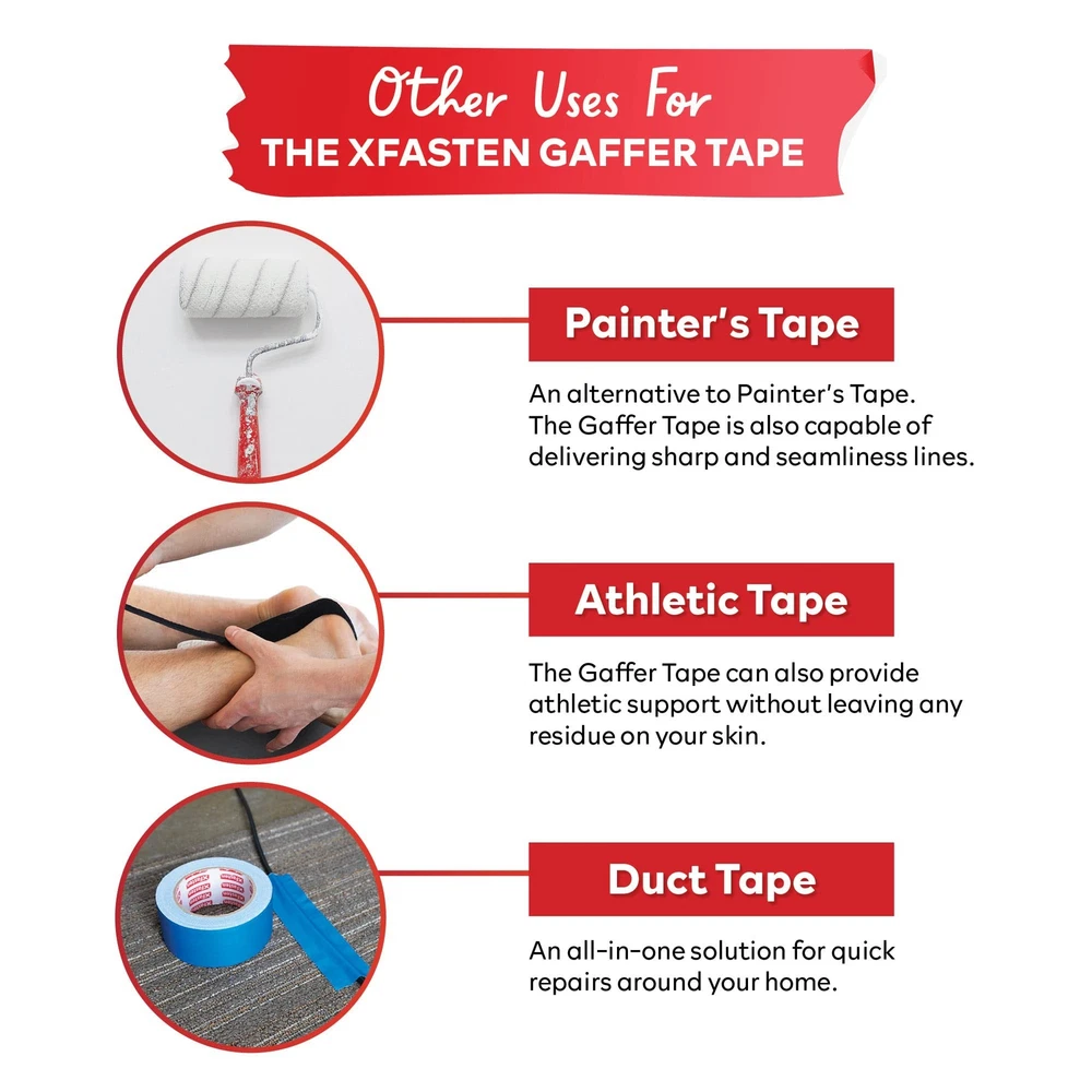 XFasten Gaffers Tape 2 Inch X 30 Yards, Blue, Multipurpose Pro Gaff Tape for ... Product Overview Size: 2 Inches x 30 Yards Color: Blue Read more Read more XFasten Gaffer Tape XFasten Gaffer Tape XFasten Gaffer Tape XFasten Gaffer Tape XFasten Gaffer Tape XFasten Gaffer Tape Size 2" x 30 Yards 2" x 60 Yards 3" x 30 Yards 2" x 30 Yards 3" x 30 Yards 2" x 30 Yards Color Black Black Black White White Yellow Material 95% Cotton, 5% Rayon 95% Cotton, 5% Rayon 95% Cotton, 5% Rayon 95% Cotton, 5% Rayon 95% Cotton, 5% Rayon 95% Cotton, 5% Rayon Uses TV, Theater, Studio, Automotive, Photography, Music, and other professional needs TV, Theater, Studio, Automotive, Photography, Music, and other professional needs TV, Theater, Studio, Automotive, Photography, Music, and other professional needs TV, Theater, Studio, Automotive, Photography, Music, and other professional needs TV, Theater, Studio, Automotive, Photography, Music, and other professional needs TV, Theater, Studio, Automotive, Photography, Music, and other professional needs XFasten Gaffer Tape XFasten Gaffer Tape Pro XFasten Flourescent Gaffer Tape ATack Gaffer Tape Pro Size 2" x 30 Yards 2" x 30 Yards 1" X 18 Foot 2" x 30 Yards Color Red Black Neon Green, Orange, Pink, Yellow, and Blue Black Material 95% Cotton, 5% Rayon Stealth Reinforced Textile Backing and Acid-Free Silicone Adhesive Cotton Fabric Stealth Reinforced Textile Backing and Acid-Free Silicone Adhesive Uses TV, Theater, Studio, Automotive, Photography, Music, and other professional needs TV, Theater, Studio, Automotive, Photography, Music, and other professional needs Ideal for decorating walls and floors for parties TV, Theater, Studio, Automotive, Photography, Music, and other professional needs Features BLUE GAFFERS TAPE WITH STRONG ADHESIVE. Marking your equipment is crucial, especially if you work with different production staff and multiple locations. Distinguish your equipment from the rest using this blue gaffer tape 2 inch. PREVENT ACCIDENTS DUE TO TANGLED CORDS. Safety is XFastens priority by bringing quality-tested products like this pro gaffer tape. Avoid accidents because of your unruly wirings on your working locations. NON-REFLECTIVE MATTE FINISH. This pro gaff tape is engineered for industry professionals to mark critical areas where high visibility is required. It also has a non-reflective feature, so it wont ruin the camera shots. MULTIPURPOSE GAFF TAPE. The XFasten gaff tape 2 inch can be used for more applications than you think! Use it as a stage marker, equipment tag, bundling of cables, or even fixing your yellow carpet in place, and a lot more. LEAVES NO RESIDUE. Pro gaff tapes are known to have strong adhesive but are gentle to the surface. You wont have to worry about sticky goo because this no residue tape got you covered! WATER-RESISTANT PRO GAFF TAPE. This gaffers tape 2 inch is not easily penetrated by water, so its safe to use in locations that might be affected by moisture or rain showers. IDEAL PARTNER FOR WHITE GAFFERS TAPE. White gaffers tape 2 inch is a staple tool for photographers and production people. Add this yellow matte tape for your other requirements like marking equipment low light locations. SURFACE-SAFE, EASY TO REMOVE. This gaffer tape is compatible with most surfaces like plastic, vinyl, wood, metal, cement, leather, and glass. Its also easy to remove and move places if necessary. RIPS INTO STRIPS. There is no need to prepare other tools like scissors when using this blue pro gaffers tape because you can easily rip it by hand and strip it to the length and width you desire. STICKS TO IRREGULAR SURFACES. The XFasten gaffer tape 2 inch is ideal for indoor and outdoor locations because it can conform to even irregular surfaces. Use this if you need to stick to circular or jagged surfaces. Details Is Discontinued By Manufacturer ‏ : ‎ No Product Dimensions ‏ : ‎ 4.53 x 1.97 x 1.97 inches; 11.36 Ounces Item model number ‏ : ‎ GT230 Date First Available ‏ : ‎ December 18, 2016 Manufacturer ‏ : ‎ XFasten Best Sellers Rank: #7,630 in Industrial & Scientific (See Top 100 in Industrial & Scientific) #17 in Gaffer Tape #17 in Gaffer Tape Customer Reviews: 4.4 out of 5 stars 2,484 ratings Quality Products Have peace of mind knowing that your order will arrive original factory sealed packaging. That means that you'll have the full force of the manufacturer's warranty to protect your purchase. Fast and Free Shipping You're already purchasing the item. Why pay additional for shipping, especially slow shipping? We get your order shipped out and delivered to your doorstep as quickly as possible. Commitment We are committed to making sure that you leave this transaction satisfied. That means having access to real people that get your questions and concerns answered quickly. Give us a shot and we will make sure that you will look to us again!