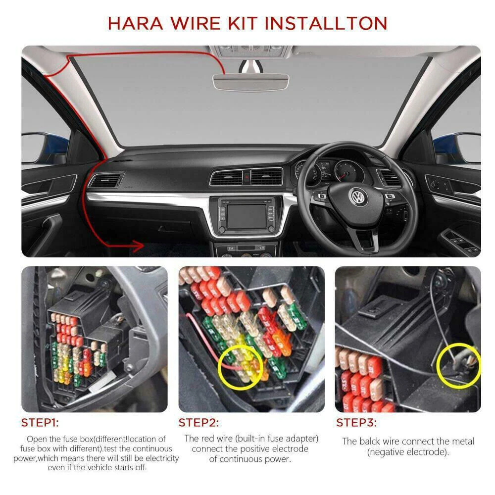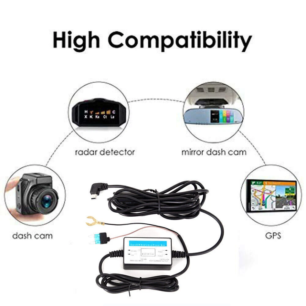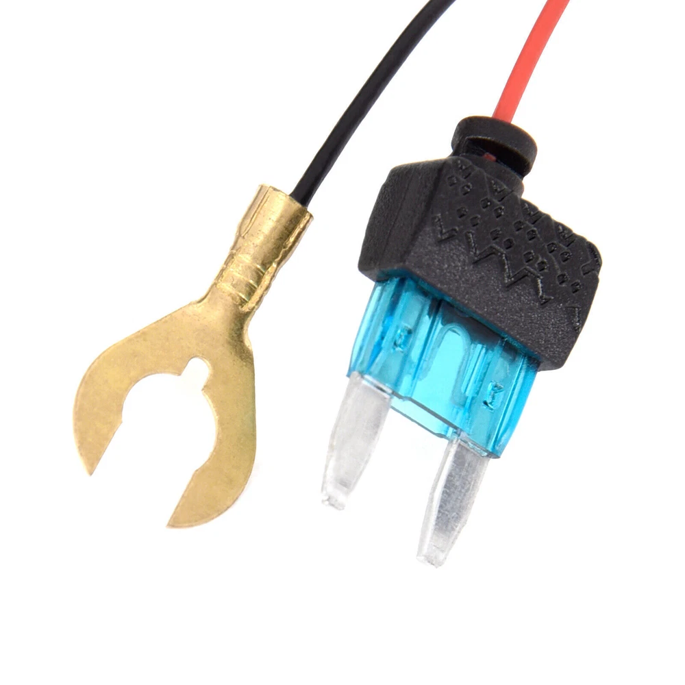 Extra Advantage Compatible with 12-24Vdc for car or truck installations. Perfect for 24/7 Parking Surveillance. Low voltage protection protects against battery dying. Works for almost all car micro USB device, such as dash cam、mirror cam、GPS navigator and radar detector No need for cable from car cigarette lighter socket, replace it with a permanent hidden cable Less static when you’re listening to the radio. Installation in minutes with little to no expertise required. 3.5 meter power cable included. The micro USB hardwire kit with built-in precise switching power supply module can transform 12V(24V) to 5V. The built-in safeguards protect your devices against overheating. Safety Notes Pertorm the installation with the ignition in the OFF position. Do not strip any live wires. Correct electnical polarity and grounding is required for safe and proper installation. Only connect to a negative ground DC supply circuit. Not for installation to positive ground circuits. Technical Details Connector: Micro USB Connector Input Voltage: DC 12V-24V Output Voltage: 5V Output Current: 2A Working Temperature:-40~ 160 Degree F Cable Length: 3.5M Low Voltage Protection: 11.4V for 12V vehicle; 23.5V for 24V vehicle Insert the 2 fuse in the correct position The supplied 5 Amp fuse MUST be placed in the uppermost socket, as shown above. In line with the red cable. The original fuse is to replaced in to the lower socket. Failure to do so will change the protection of the original circuit within the vehicle. Whilst this will not cause any damae to the vehicle,the lower 5 Amp fuse may above. Installation Instruction Installation - Step 1: Connect the supplied "fuse tap cable" to the vehicles fuse box. Installation - Step 2: Installing the "Car Power Cable". 2.1 Installation of the camera power cable needs careful planning for the cable run and the final position of the camera within the vehicle. 2.2 Starting from the camera end of the cable (with the mini USB) tuck the cable under the vehicle headlining, the "A" post trim and side panel trim until the cable exits towards the footwell. For detals instruction preocess please refer to our user manual in the package. If in any doubt, please ask a vehicle technician prior for help.