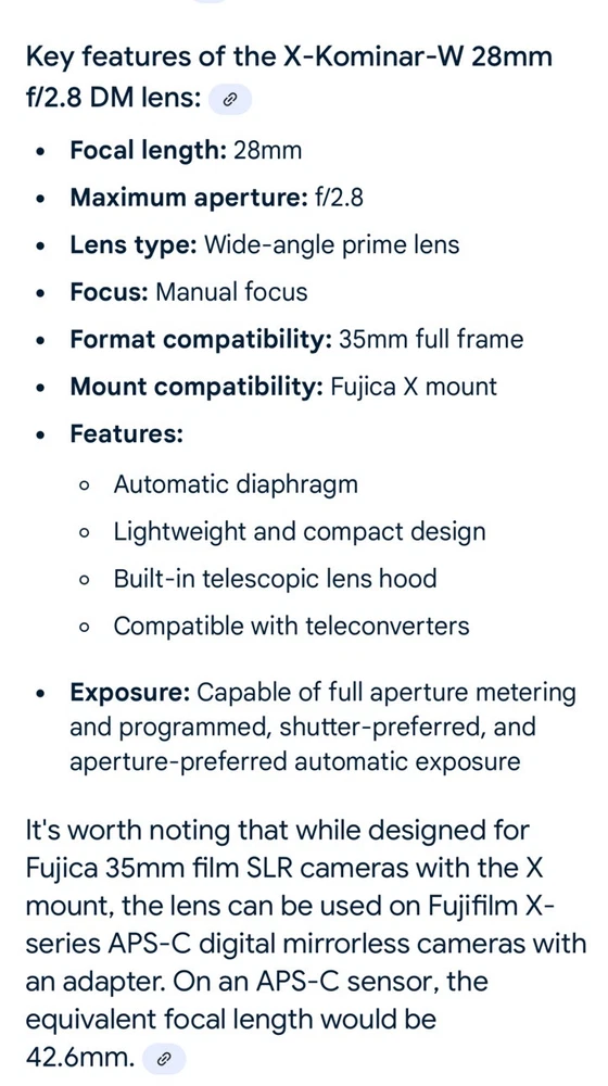 This is a vintage Nittoh Kogaku X-Kominar wide angle lens with a focal length of 28mm and a maximum aperture of f/2.8. It is compatible with Fujica Fujifilm cameras using a Fujifilm X mount. Manufactured in Japan in the 1980s, this manual focus lens is made of aluminum and has a model number of No. 112660. It includes a 49mm compatible filter size and lens front. No filter included. Rear cap only Lens appears clear with some typical small dust particles. Aperture opens but seems to close slowly.
