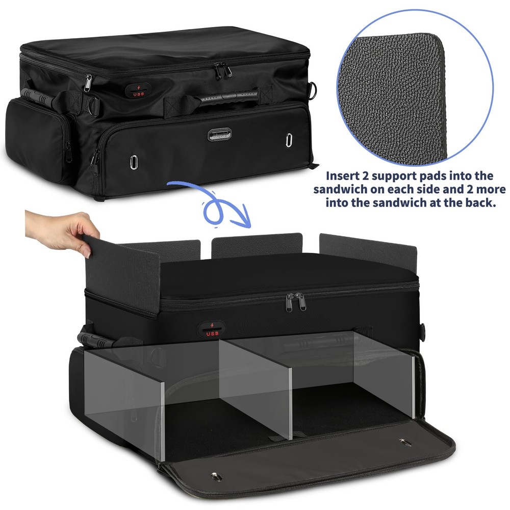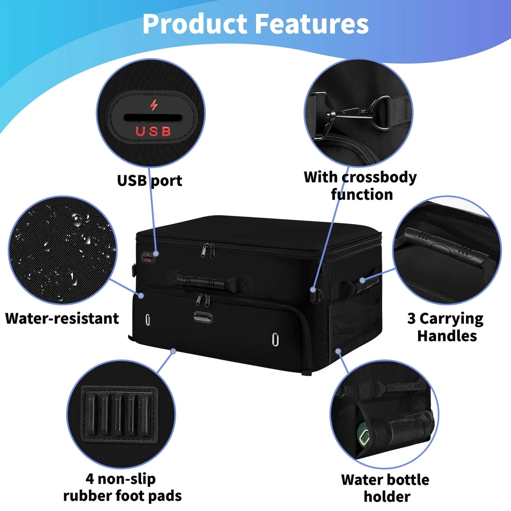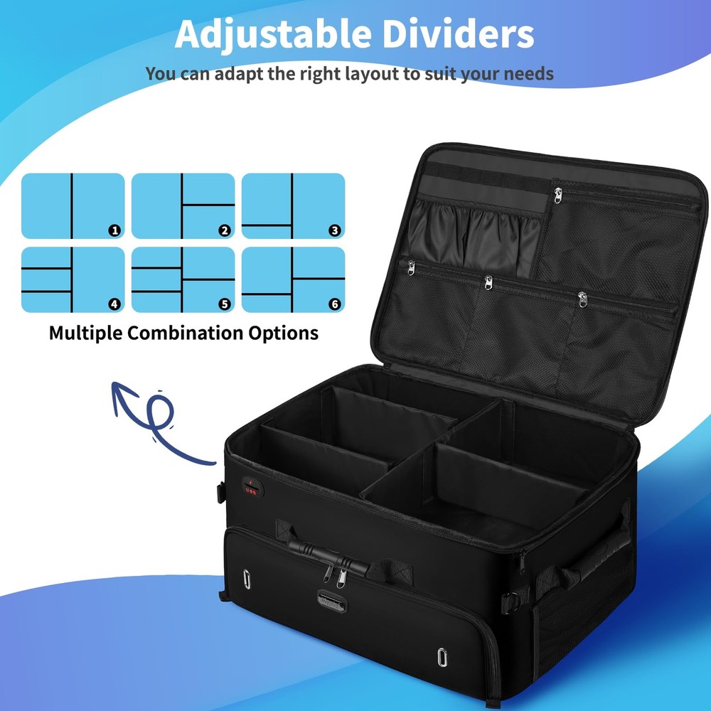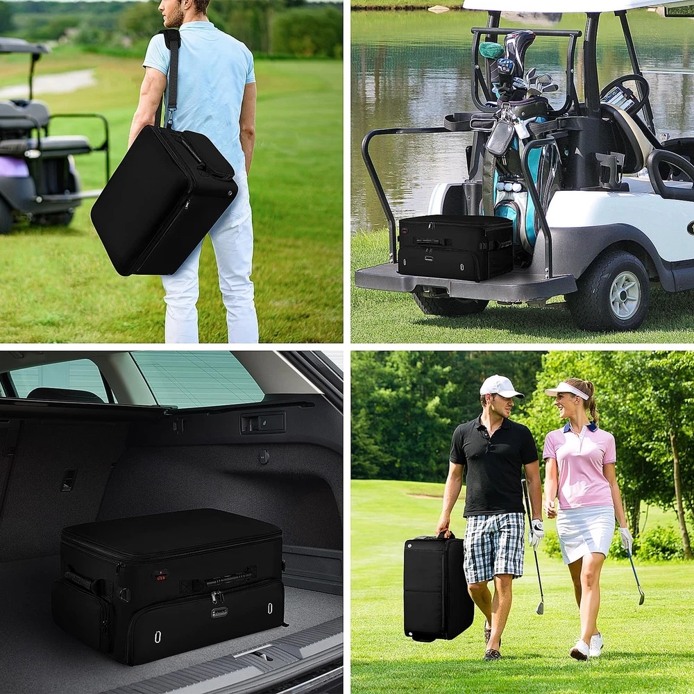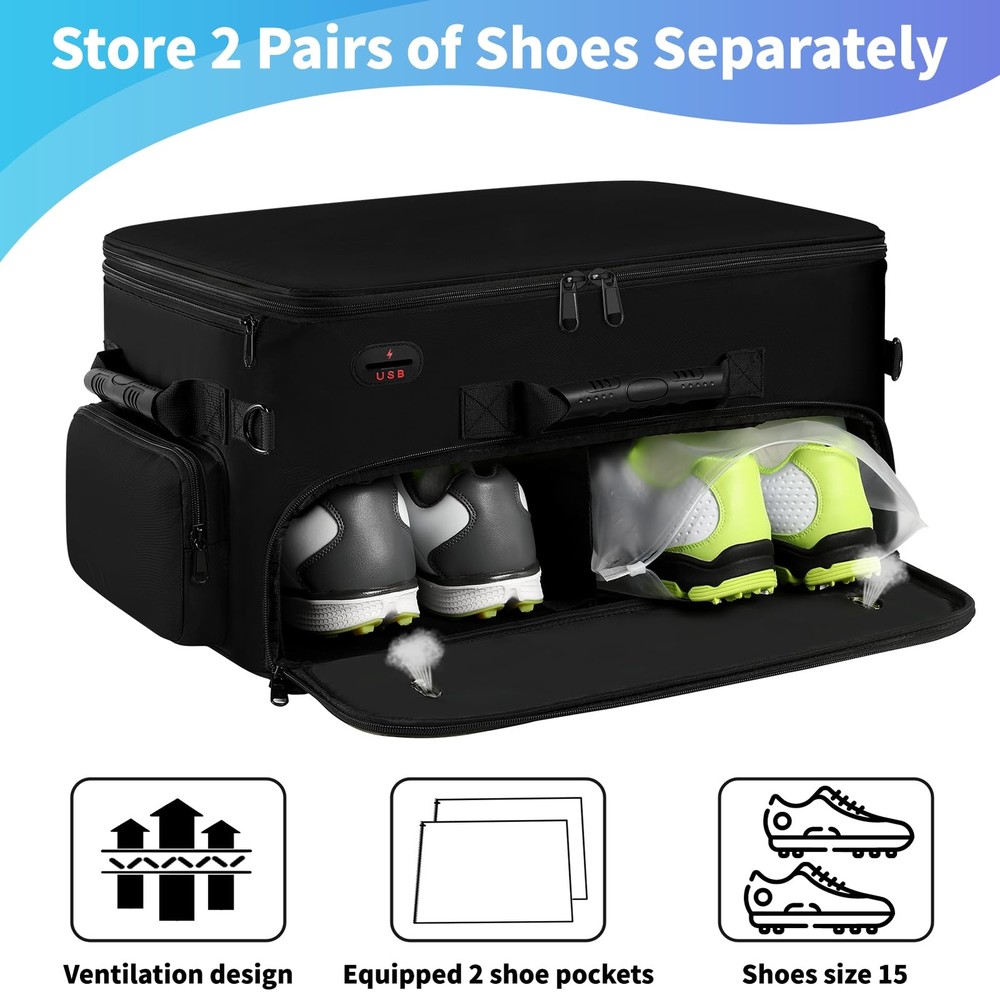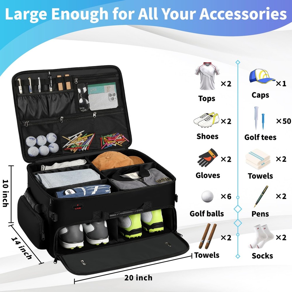 Golf Trunk Organizer 【MULTI-PURPOSE & BEST PRESENT】 This golf shoe bag men features a USB port, water-resistant, non-slip bottom, cross-body, 3 side carry handles, and a cup pocket for your daily needs! In addition to golf, it can be used for other purposes such as fitness, travel and car trips. Excellent golf present for men/women, golf present for him, golf enthusiasts on birthday, Father's Day, Mother's Day, Valentines day present for him golf, Thanksgiving Days, Xmas, and Easter. 【ENOUGH STORAGE SPACE】 The golf trunk organizer for car has 3 storage sections sections for keeping golf essentials together, including golf balls, golf tees, golf brushes, scorecards, gloves, socks, shoes(up to size 15), towels, shirts, pen, caps, etc. It also allows for storing other necessary items for travel or other outdoor activities. Perfect golf accessories for men. Fathers day present for men golfers. 【STRONG CONSTRUCTION】 The bottom of the golf bag organizer has an E-shaped panel that fits into the bottom shoe compartment and creates a stable frame on three sides and in the center that not only separates the shoe compartments, but also prevents the top from collapsing into the bottom. There are zippers on the sides and back of the bag that instantly stabilize the look of the golf shoe bag once the 4 dividers are placed into the zippers. 【TOP AREA ADJUSTABLE】 The golf accessory bag's top section can be divided into 5 compartments. You have the option of putting on or removing the 3 short dividers, making the compartment location fit your needs and keeping your golf gears neat and orderly in a reasonable layout. When you're not using it, this golf shoe bags can be folded down. 【WELL-DESIGNED FOR 2 SHOES】 golf trunk organizer has been upgraded in capacity to hold shoes of larger size compared to other bags. There is a separate compartment at the bottom for 2 pairs of shoes up to size 15, 2 ventilation holes on the front to keep the air circulating around the shoes, and 2 shoe covers included to prevent shoes from getting the bag dirty or wet, golf trunk organizer size: 20*14*10 inch(50.8*35.6*25.4 cm), Shoe covers size: 13.8*17.7 inch (35*45 cm)