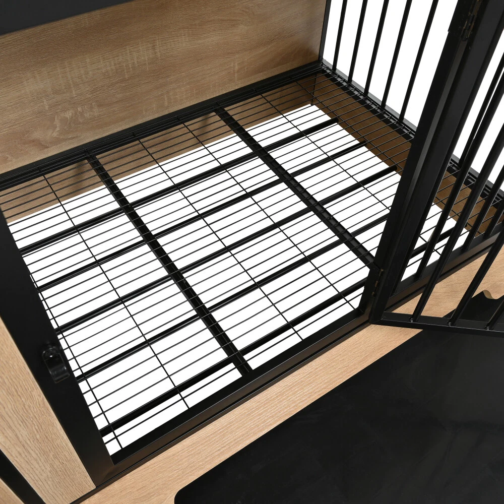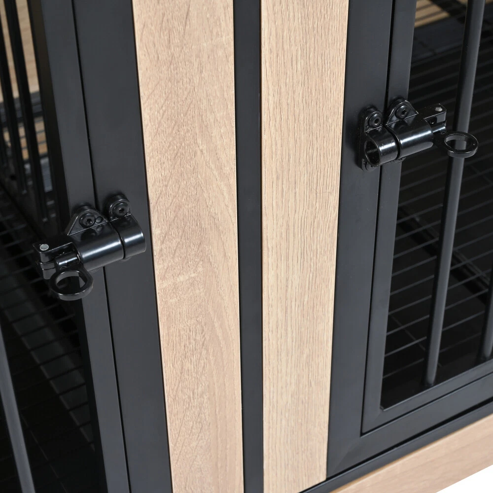 Double Dog Crate Furniture–XL Wooden Kennel with Tray,2-Room Cage for Large Dogs Features Extra Large Dog Kennel: It allows 2 large dogs to have a comfortable and spacious living space, avoiding anxiety and unease due to limited space. Removable Tray: The dog cage furniture has two hidden two trays at the bottom, easy for cleaning. Individual Living Space: There is a divider at the middle of the dog crate furniture, every space have its own door for the dogs. Durable & Bite-Resistant: All wooden boards and metal parts of the dog crate have been upgraded and thickened, have better load-bearing capacity and more durable. Reliable After-Sale Service: Your satisfaction and positive experience come first. Detailed instructions and necessary tools are all included in the package. Full furniture-style dog crate will come into 2 boxes. Description Dog Crate Furniture, Dog Crate Furniture with Two Compartment, Dog Cage Furniture, Dog Cage Furnitur Specifications: Color:Black/Wooden; Material: Metal and MDF ; Product Dimensions:74.8x 26.38 x32.28 inches; Storage: yes ; Weight :121.00LB ; Package Included:1x Dog Crate.