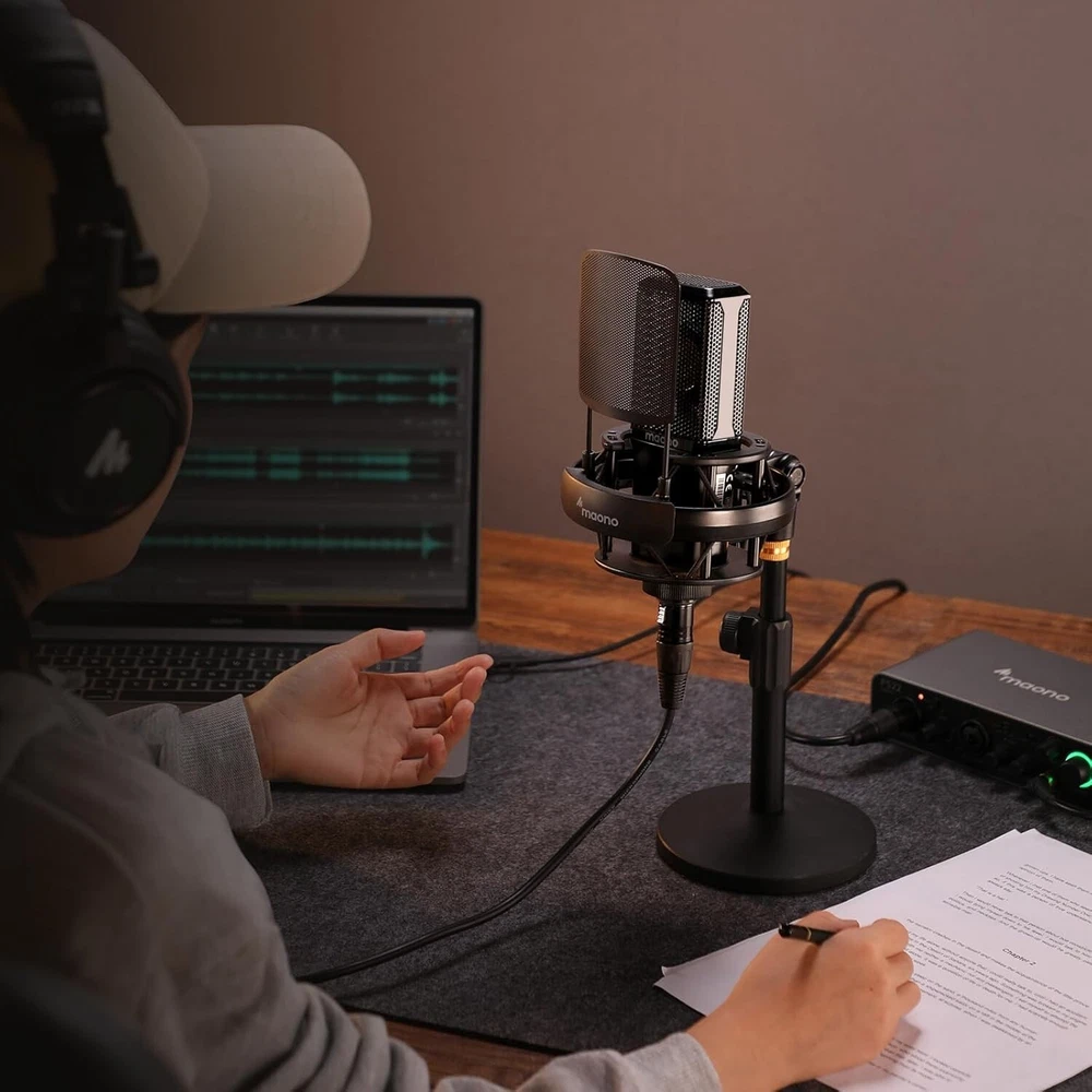 XLR Condenser Micro with 34mm Large Diaphragm, Professional Cardioid Studio Mic for Podcasting, Recording, Streaming, Vocals, Voice Over, Music, ASMR Studio Grade Sound: The XLR condenser micro features a custom-designed 34 mm large diaphragm gold condenser capsule and offers a dynamic range of 20Hz - 20kHz, low noise, ensures every recording is incredibly clean, high sensitivity and extremely high SPL handling that you will no trouble recording loud sound sources, from guitar cabinets to drums. The XLR mic optimised for Professional music creation, instrument singing, vocal, podcast recording with detailed, full and warm sound Cardioid Pattern: Cardioid pickup shows excellent off-axis sound suppression capability of reducing the sound pickup from the side and rear, thus eliminating background noise. Accurate capture of sound details, silky top end, detailed midrange, and warm bass make it ideal for recording a wide range of instruments as well as vocals, from drums and percussion to acoustic instruments and guitar cabs External Power Source Required: The Vocal condenser micro with premium XLR cable for plugging into an audio mixer, 48V phantom power or interface, so you can get recording right away. the studio micro with good shielding and balanced output for a more clear, rich and stable sound, makes the podcast audio immersive. If you want to connect the XLR condenser micro to the Windows laptop/iOS/PAD/mobile , please make sure you have your Phantom Power ready High Specification: The circuit design utilizes premium components from top-tier manufacturers and a tailor-made permalloy audio signal transformer to provide low self-noise and exceptional sound capturing, clearly restored recording sound. Ideal for vocalists, music instrument performers, podcasters, live streamers, broadcasts, ASMR, and studios Premium Metal Structure: The body of this XLR condenser micro is made with zinc alloy and treated with multi-layer coatings. Highly corrosion resistant, Simple and atmospheric design and protects the stability of the micro's mechanical structure, ensure the purer audio signal and delivery better sound quality. Upgrade Accessories: The included metal pop filter, shock mount and desktop stand can protect the micro all-around, it isolates the mic from physical vibration. Users can easily start their pro-level content creation with the accessories provided Package List: The kit comes with XLR condenser micro*1, metal desktop stand*1, shock mount*1, metal pop filter*1, XLR to XLR cable*1, User manual*1 The video showcases the product in video guides you through product video compares multiple video shows the product being unpacked.