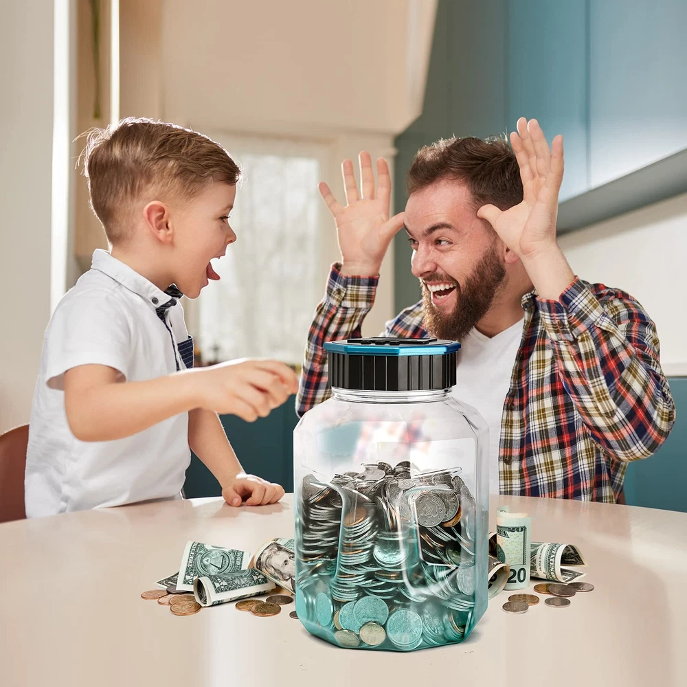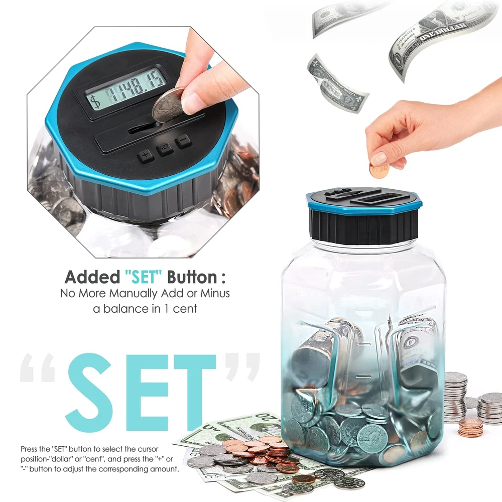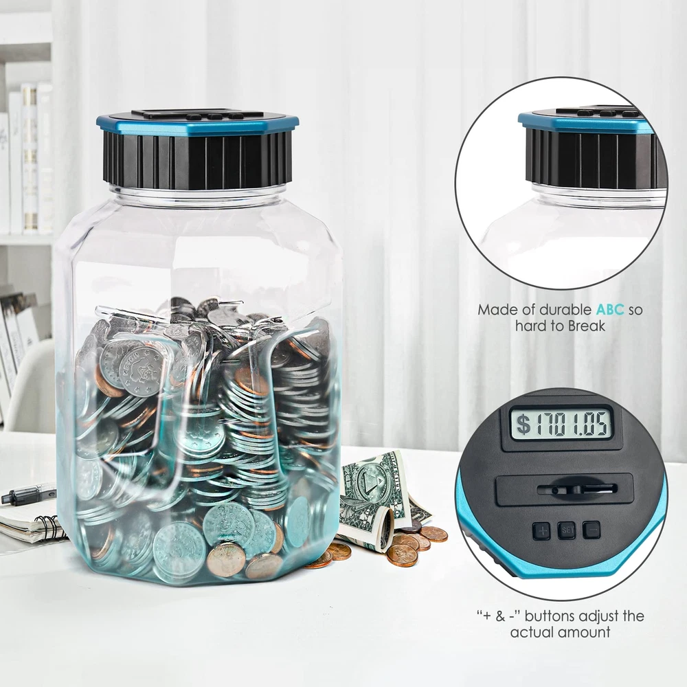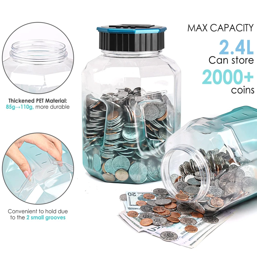 Designed For All US Coins: X-Large capacity up to 2.4L, digital counting money jar can storage 2000+ coins. Piggy bank for adults/kids, accepts all US coins and is powered by 2 AAA batteries(Not Included). Great coin bank money counting jar for adults kids with saving goals. Keeps Track of Savings: Digital piggy bank can automatically distinguish and calculate coins of all sizes with unique identification technology. Displayed amount adjustable with +&- buttons when you unscrew the lid and put the coins directly in the counting coin jar. Know The Amount At Any Time: Coin counter bank money counting jar with legible LCD screen allows you to see the amount of coins quickly and exactly. The digital coin counter with thickened PET material, much more sturdy than glass/ceramic piggy bank. Great Gift For All Ages: The Kids piggy bank is a nice gift for kids with savings goals. Would be a nice gift for a young person learning about the value of and how to save money. Coin savings bank, also a great addition for adults to manage change and away from the coin mess. FUN WAY TO SAVE CHANGE: Smart and active piggy bank. Very cool and nice, come and get this value coin money bank. You may amazed at how simple yet smart this product is. Get this saving jar, you can also get a small screwdriver which is needed. piggy bank with fun.