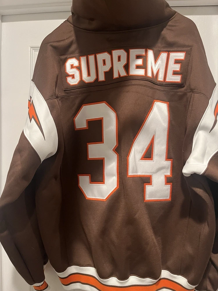 Elevate your streetwear game with this Supreme Football Zip Up Hooded Sweatshirt in Brown. This hoodie is perfect for any football enthusiast who wants to show off their love for the game in style. It features a full zip closure and a hood for added warmth and comfort. Made by Supreme, a leading brand in the fashion industry, this hoodie is available in sizes Small and Medium. It is crafted from high-quality materials and designed to last. Whether you're going to a game or just hanging out with friends, this hoodie is sure to make a statement.