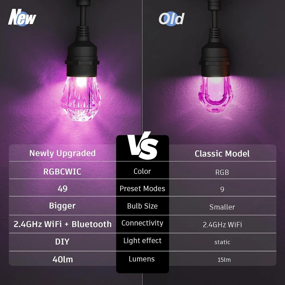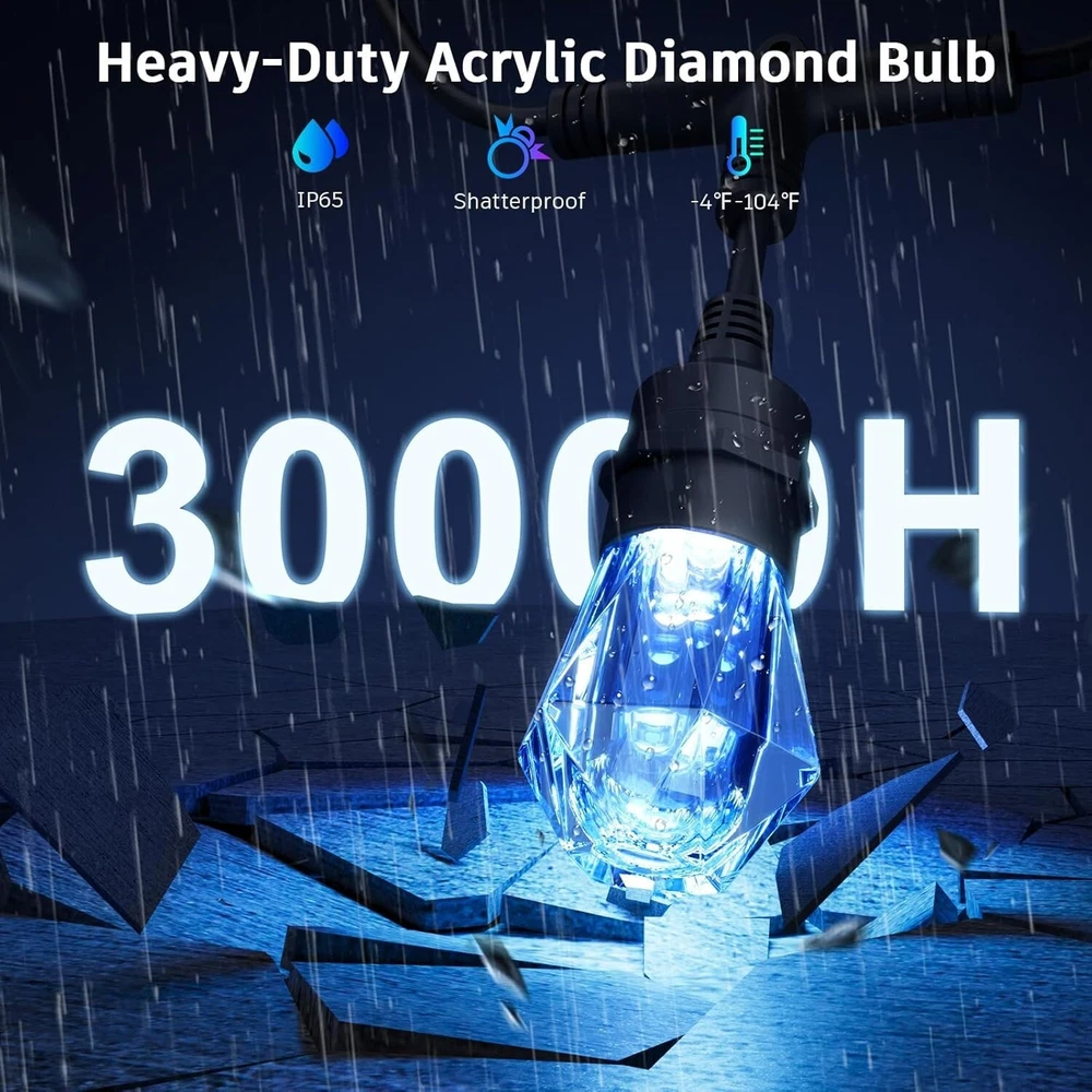 XMCOSY+ Outdoor String Lights Waterproof, 123ft LED Smart Patio Lights with 40 Shatterproof Dimmable Bulbs, APP & WiFi Control, Compatible with Alexa for Outside Party, Christmas About this item 【Creative DIY Mode】XMcosy outdoor string lights offer millions of colors to choose from, allowing full customization to match any mood or occasion. Use DIY options to create unique lighting scenes by adjusting colors and effects to suit your style. 【Dynamic RGBCW Light】 The IC-controlled string lights allow each LED bulb can be customized with different colors and adjustable brightness for personalized lighting. The string lights feature replaceable panels (spare LED COB X 2 included) 【Sync to Music】The smart lights can synchronize with music, turning any space into an energetic light show that moves to the beat. You can adjust the lighting effects and sync settings by the app. Perfect for any occasion where music and ambiance come together. 【Smart App & Voice Control】Control the lights using the app or voice commands through Google and Alexa. You can easily adjust brightness, set timers, and switch between various modes for hands-free, convenient operation. 【IP65 Waterproof & Shatterproof】The string lights are built to endure all weather with IP65 waterproofing and durable shatterproof acrylic,ensuring long-lasting performance even in tough environments. 【Connectable & Group Control】Connect up to 65 bulbs for extended coverage, creating a seamless and vibrant lighting display. Additional controllers can be added and controlled separately or together using "Group Control"
