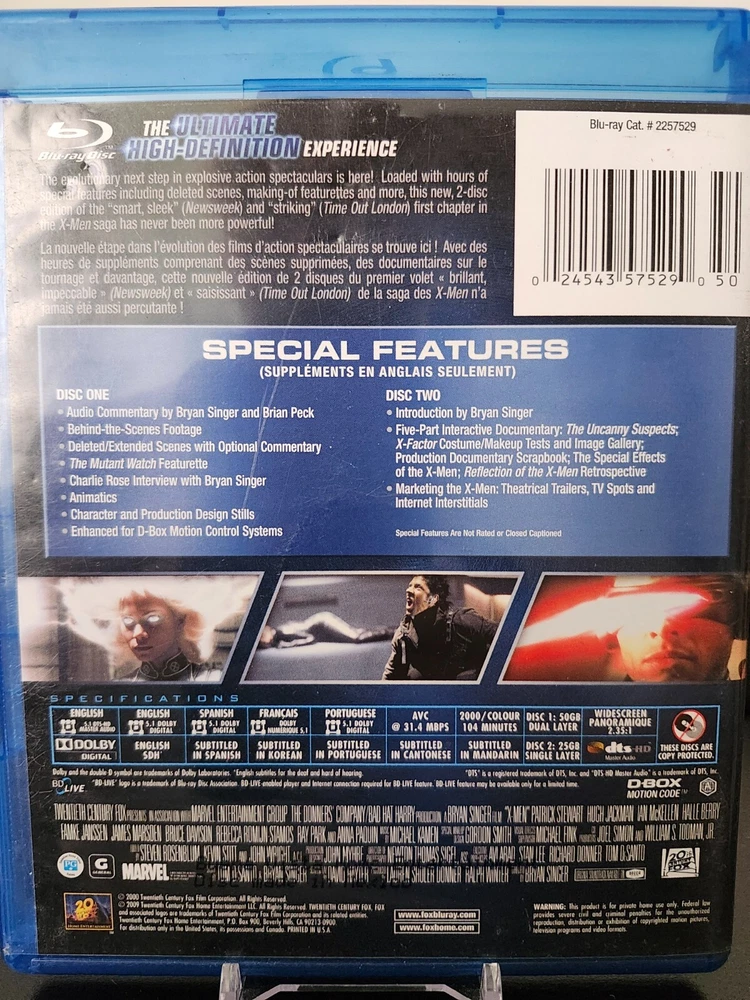 UPC: 0024543575290 Edition: Standard Edition Rating: PG-13 Actor: Patrick Stewart, Hugh Jackman, Ian McKellen Franchise: X-Men Director: Bryan Singer Release Year: 2009 Season: na Format: Blu-ray Genre: Sci-Fi & Fantasy Sub-Genre: Superhero Movie/TV Title: X-Men Language: French, English, Spanish, Portuguese Type: Movie gtin13: 0024543575290