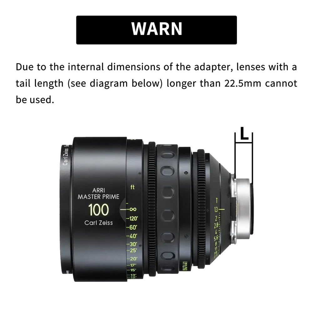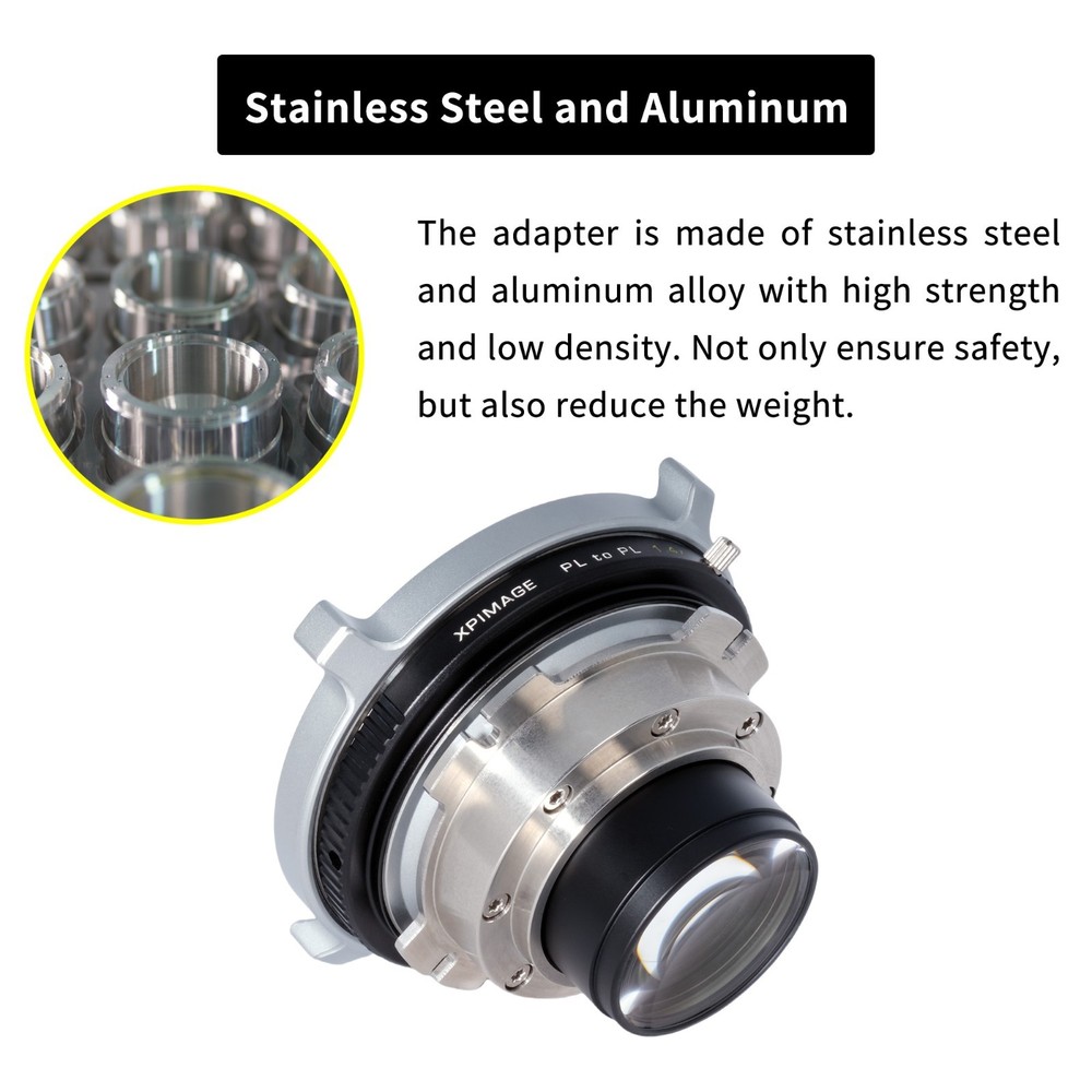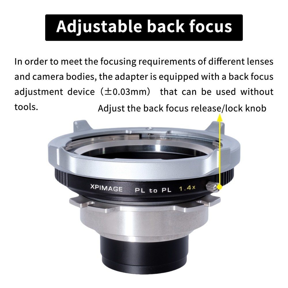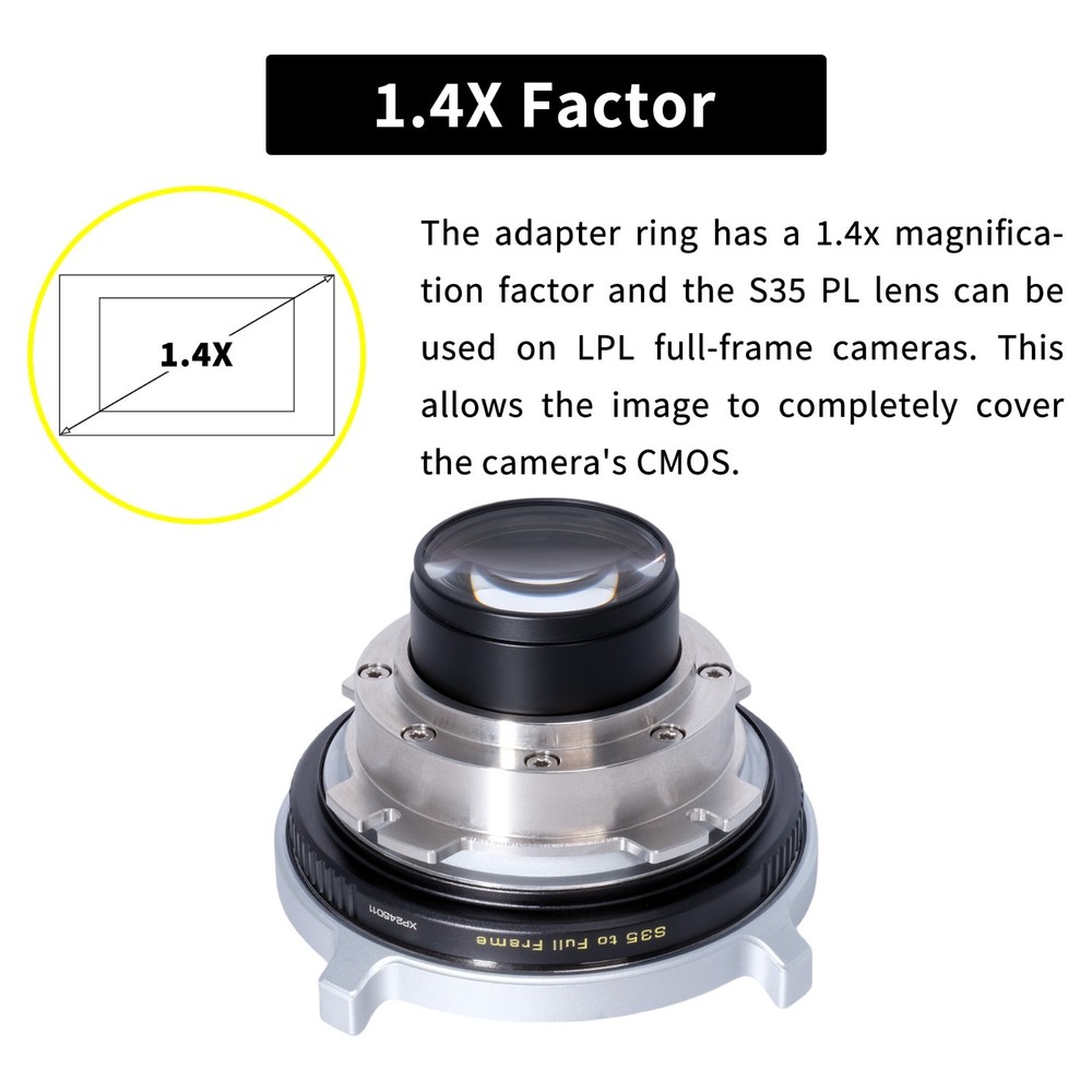 Lens: Compatible with S35 PL mount lenses Camera: Compatible with full-frame PL mount camcorders IMPORTANT NOTES: Lenses with tail length >22.5mm cannot be used. KEY FEATURES: 1.4x Full-Frame Expander – Enables S35 PL lenses to cover full-frame sensor with minimal image quality loss 1.4x Focal Length Increase – Only 1-2 T-stop loss at full aperture for filmmaking versatility Tool-Free Back Focus Adjustment – ±0.03mm adjustment range without tools Precision Infinity Focus – CNC machined and assembled for accurate focus at infinity Premium Metal Construction – Stainless steel and aluminum alloy for durability and light weight Anti-Reflective Coating – Matte black interior minimizes flare and ghosting Hard-Anodized Finish – Enhanced wear and corrosion resistance Unique Identification – Each adapter has a unique ID number For any questions regarding product use, please see the tutorial video or leave a message for help.