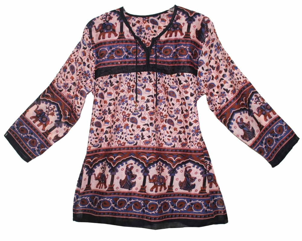 Description:- 100% Cotton Beautiful Blouse Ethnic And Vintage Look Pattern And Print Brand New For You (Not Real Vintage) 100% Cotton Maya Blouse/ Top/tunic/ Kurta With Strings Length = 28 Inch Bust = 40 Inch (Xs/s/m/l) Armhole = 10 Inch Sleeve Length = 18 Inch Free Size For Xs / S / M / L