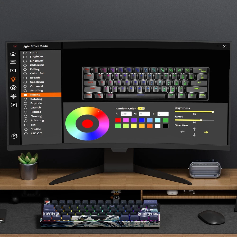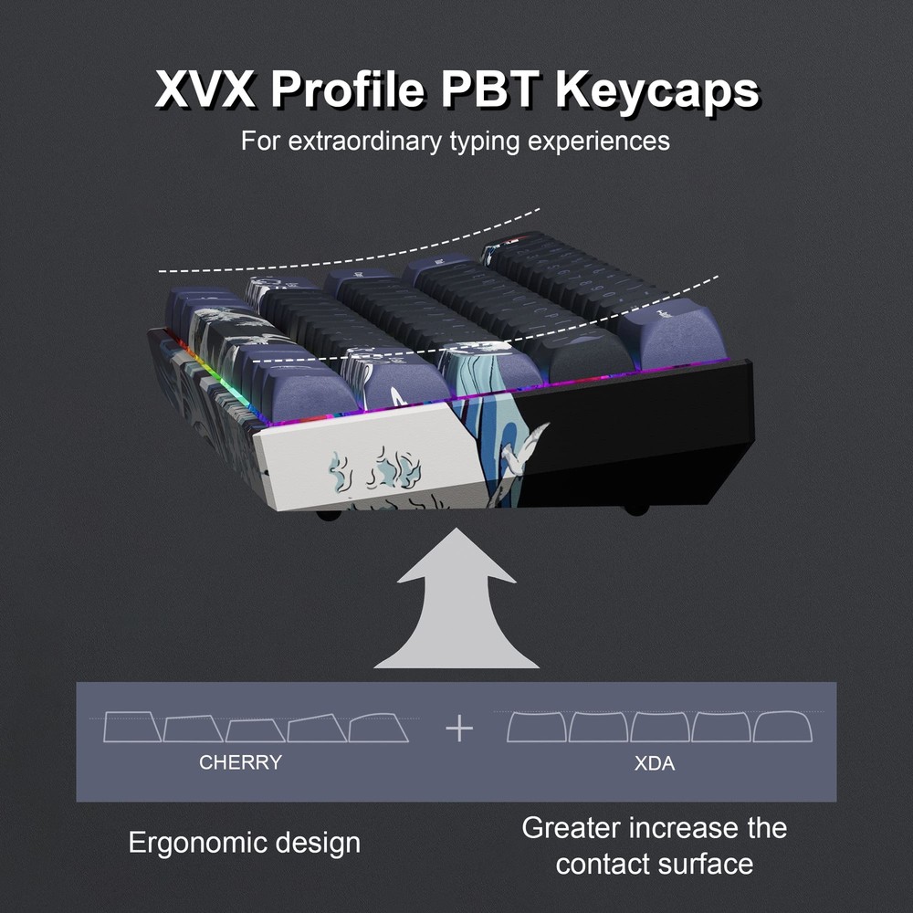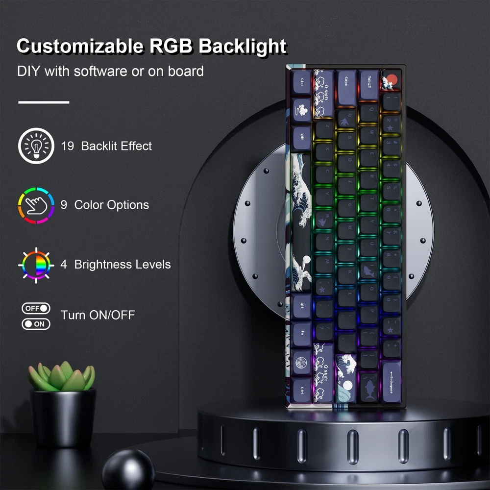 【Upgrades & Highlights】The custom keyboard supports hot-swap, providing more possibilities for customization. Comes with EVA sound absorbing foam and IXPE switch pad, which effectively reduces the hollow sound and provides more consistent typing feel. 【Great Wave Off Kanagawa Ergonomic Keyboard】This 60 percent keyboard is with unique Xvx Profile PBT keycap and themed shell, showing the coral sea pattern in 360 degrees, which have excellent touch experience and long serving time.The colorful design can bring a more pleasant mood to games or work. 【Triple Mode Connection Mini Keyboard】M61 PRO wireless keyboard supports bluetooth, 2.4 GHz and usb-c wired connection, including Bluetooth 5.0, 2.4GHz wireless mode, and USB C wired mode. This Bluetooth keyboard can connect up to 5 devices at the same time and is easily switched with the FN+ key combination. 【Compact 60% Keyboard】This 60% gaming keyboard has the perfect size and fits easily into most bags and backpacks. Additionally,this keboard can be used at anytime and anywhere, fits well with all environment, such as business, travel, gaming, office, home, school use and so forth. It is the best choice for gamers, employees and freelancers without doubt. 【Colorful Illuminated Keyboard】The keyboard itself provides with 19 RGB backlight modes,9 colors selection and 4 brightness levels for you to adjust,which can enhance your gameplay atmosphere and immersion at its maximum.19 RGB backlight modes allow you to work or play games in the dark. Of course, if you want to save electricity,turning off the lights is an available choice. 【Pro Software Customizable Keyboard】Using the certain software to design your own models and effects. Macros with different key bindings and shortcuts can greatly improve your work efficiency. ('Music Syncing' mode enables rhythmic lighting patterns from music played).
