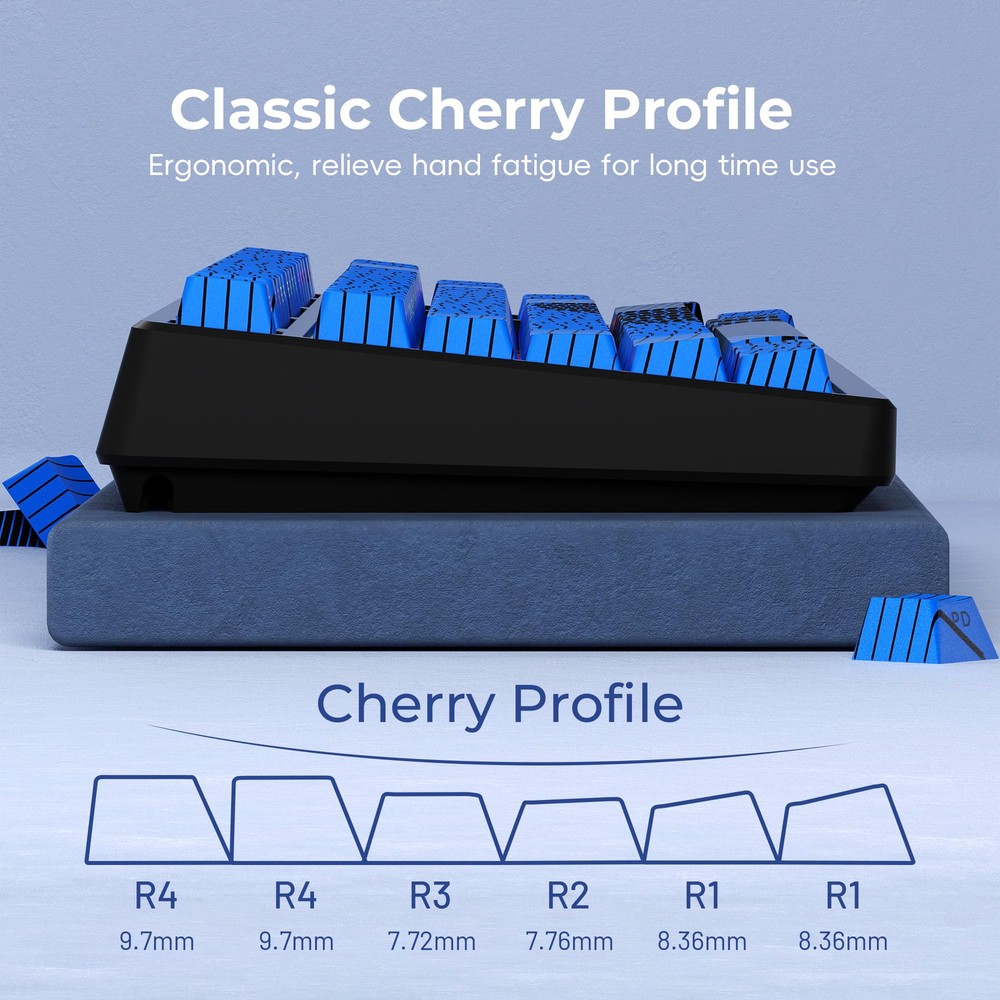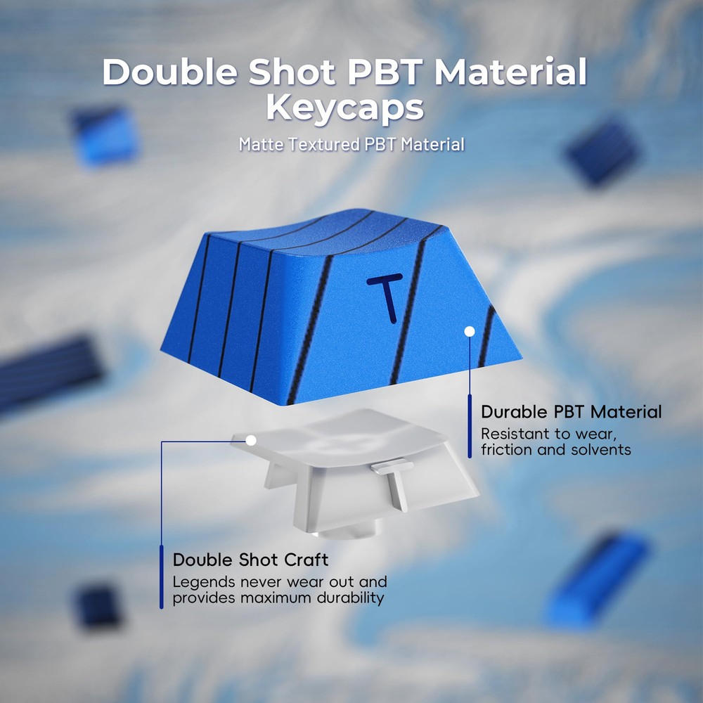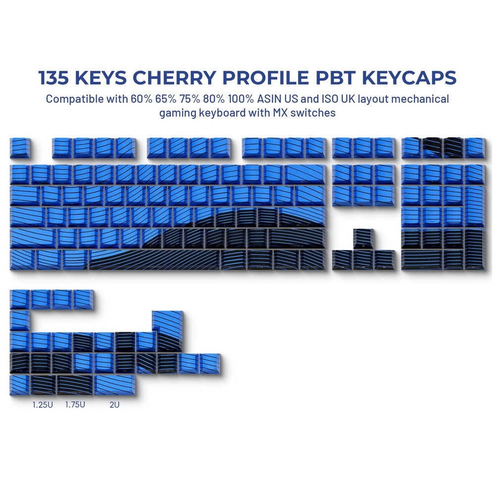 【New Topograph Style】Irresistible color clash! black and blue, as a classic and versatile color, the combination of black and blue can bring visual impact without losing elegance and vitality. Elevate your keyboard with premium 5-sided dye-sub PBT keycaps. 【Dye Sublimation Keycaps】Elevate your keyboard with premium 5-sided dye-sub PBT keycaps, advanced dye-sublimation technology allows the color to penetrate into the keycaps,making the color on the keycaps very clear and won’t fade for long time using. 【Double Shot Shine Through Keycaps】To ensure the integrity and legends visibility of your keyboard's exterior topograph, we use side-printed shine through legends. The double shot technique that is two layers(transparent inner layer and outer layer)are molded into one without printing so the keycaps legends never falls off and light tramsmission. 【PBT Material Keycaps】PBT or Polybutylene Terephthalate, It is matte with a slight frosted texture,that are resistant to wear,high temperature, and solvents. ensure a premium look and better user experience. 【Cherry Profile Keycap Set】The keyboard keycaps designed with the classic cherry profile, it is ergonomic,you won't get tired even if you use it for a long time. 【Ultra-Wide Compatibility】This 136 keys keycap set consists of 104 standard keys and 32 supplementary keys compatible with ASIN/ISO layout 60%/65%/70%/75%/80%100% mechanical keyboards with MX-stem(cross-shaped) swithes. 【What You Get】Including 136 keycaps and a keycap puller, packed in blister and carton. Not include keyboard, the keyboard is just for demo not included.