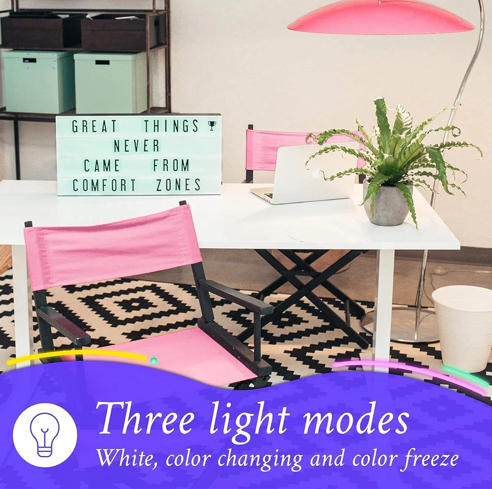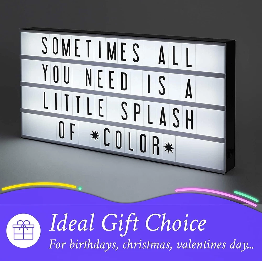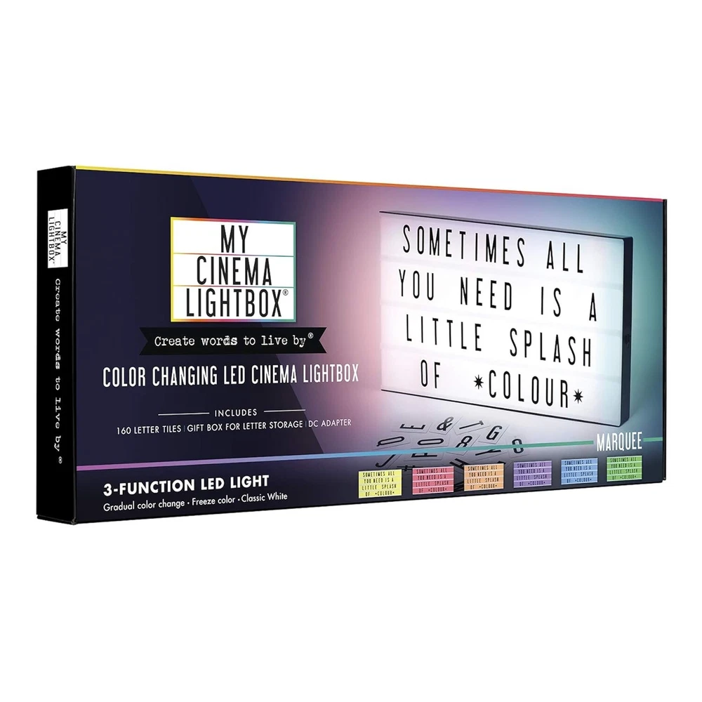 XXL Cinema Light Box, 24" x 12" - 3 Modes Light Up Letter Board Sign with 160 Letters, Numbers and Sign - White LED Light, RGB and Color Freeze Mode Light up Signs for Wall Decor is the original product of LED marquee light boxes. This light box with letters allows you to slide the letters into the front rails to create messages, quotes, and announcements. The Color-Changing Marquee light box is XXL in size: 24 x 12 it fits 17 letters across each row. An amazing cinematic lighted letterbox with changeable words the perfect light for party or vintage. Message board includes 160 letters, numbers, and symbol tiles, plus a letter storage box. The letter size is A4 (extra letter packs are available) and it fits the Original size . With 3 different modes: classic white, gradual color-changing, and freeze on any color. These High quality LEDs provide consistent light output with no spotting or dimming the LED light box sign. The lightboard comes with a battery power option (6xAA not included) or a DC power option (9v DC adapter included). With built in hanging holes and weights at 4lbs, an ideal gift for your loved ones