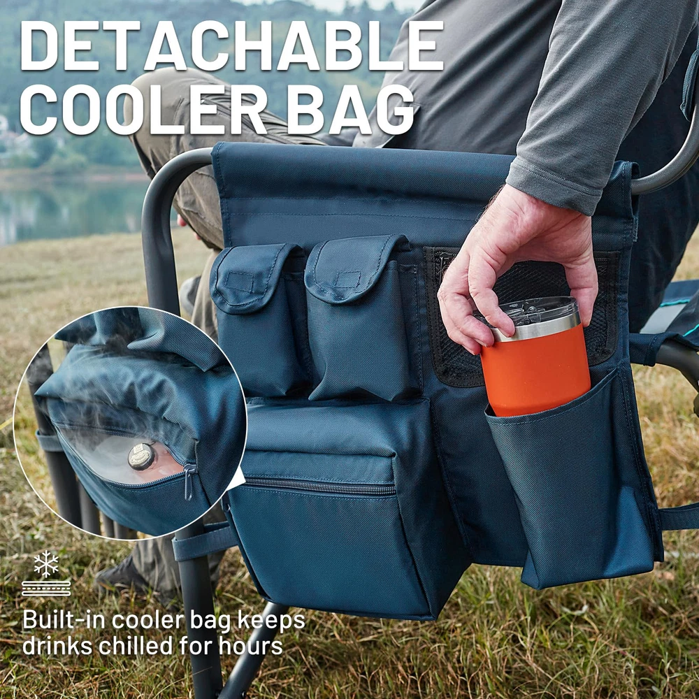 OVERSIZED DIMENSION: Please pay attention to our XXL size. Unfolded size is 32.7"W x 24"D x 36 3/5"H, folded size is 7" X 24 4/5" X 37 2/5"; product weight is 22lbs,this folding oversize camping chair features an extra-wide seat (28.4 inches) STURDY METAL FRAME: This heavy duty director chair can support up to 600lbs and has a 600D polyester embossed fabric and 25mm steel tube frame with powder coating MAXIMUM COMFORT: This comfy directors chair features foam padding full back and wide seat,with padded headrest and cushioned armrest,allows maximum comfort and great relaxation,including long time sitting SIDE TABLE & SIDE POCKET DESIGN: The collapsible side table on the right side keeps important items within reach and is perfect for your cell phone and beverages. Removable side pocket on the left side has a large pocket with insulated coating to help keep food or drinks cold or hot for hours. Mesh pocket under the seat for some other small items MULTIFUNCTIONAL USAGE: This oversized directors chair is suitable for camping, traveling, barbecue, picnic, and any other outdoor / indoor activities BELIEVE US: At , each product is meticulously crafted with care and supported by our dedication to ensuring customer contentment. Should any concerns arise, our assistance is readily available