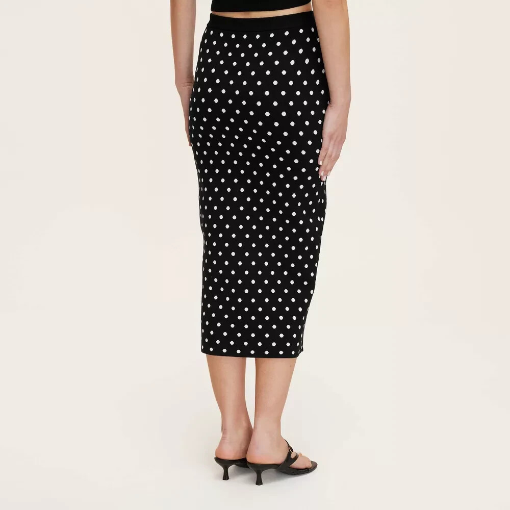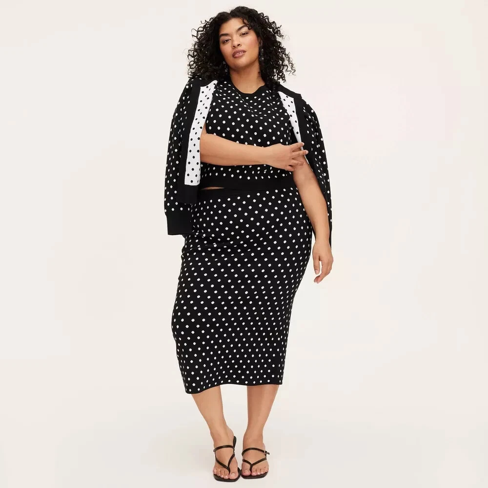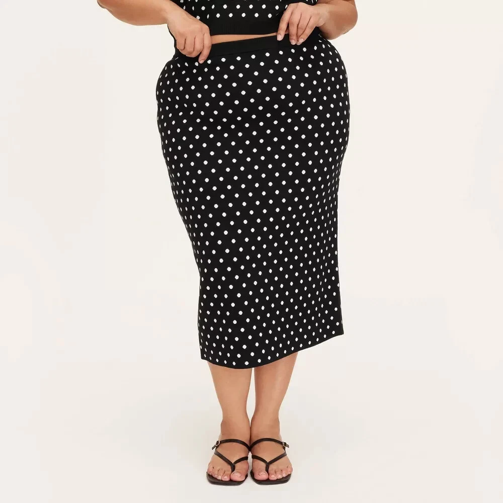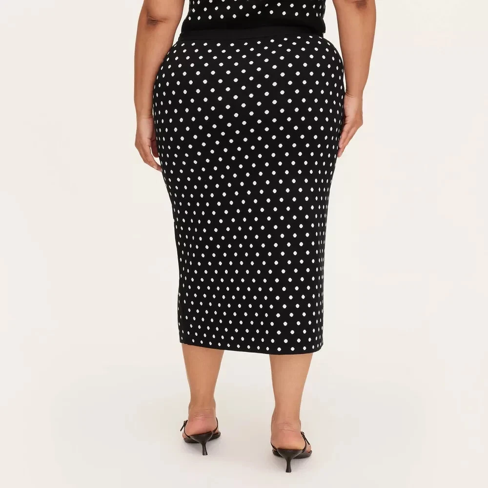 Fit & style Model wears size XS and is 5'10" - Model wears size 1X and is 5'9" Sweater midi skirt Mini polka dot pattern in black and white Jacquard-knit fabric Mid rise Elastic waistband Sizing: Womens Plus Material: 64% Viscose, 30% Recycled Polyester, 6% Nylon Fit: Regular Fit Closure Style: Full Waistband Elastic Rise: Mid Rise Fabric Name: Jacquard Knit Garment Length: Midi Total Garment Length: 28 Inches Garment Details: Full Waistband Elastic, No Pocket Fabric Weight Type: Lightweight Fabric Care and Cleaning: Machine Wash, Line Dry or Lay Flat to Dry Street Date : April 12, 2025