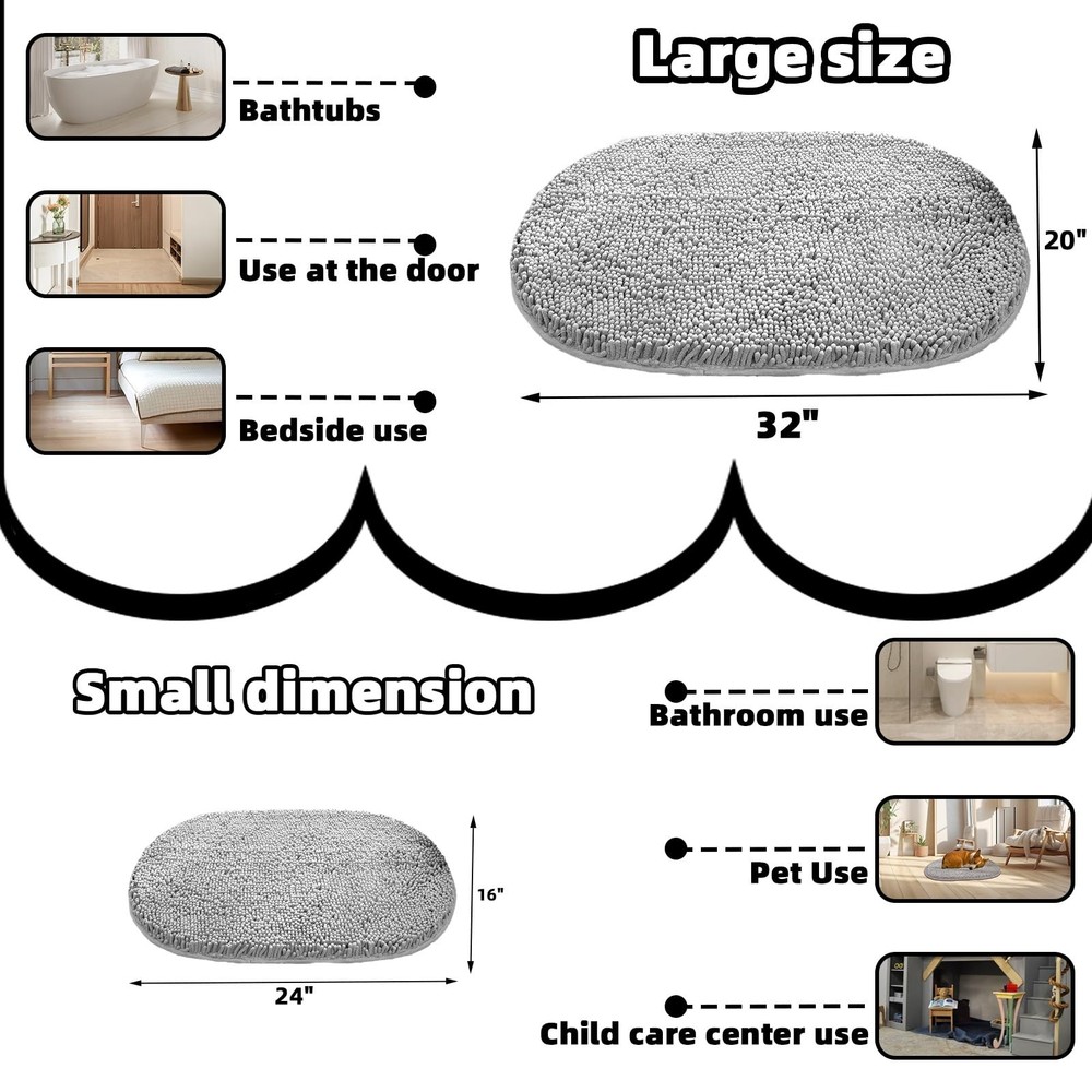 Introducing our oval chenille bathroom rugs, the ultimate addition to your bath decor! Crafted with durability and comfort in mind, our chenille rugs are made of high-quality chenille microfiber that provides a soft and fluffy feel for your feet. The anti-slip bottom keeps you safe while stepping out of the shower, making it an ideal choice for families with kids and seniors. Our oval chenille bath mat is easy to clean and quick-drying, making it convenient for daily use. It's also fade-resistant, ensuring long-lasting use while maintaining its vibrant colors. The simple yet fashionable design complements any bathroom decor style, while also offering a multi-purpose use. The chenille bath mats are perfect for placing in front of the sink, bathtub, shower, stairs, laundry room, pet house, pet rug, balcony or even at the doorway. Our absorbent chenille pet mat is not only stylish, but also skin-friendly – making it perfect for those with sensitive skin. We've also made sure that the soft chenille oval bath mat is free from shedding, ensuring a clean and mess-free bathroom. Overall, the coral bathroom rug is the perfect combination of comfort, durability, and style. Order your ultra soft microfiber shaggy oval rug pad today and elevate your bathroom experience to the next level! SUPER ABSORBENT: The Oval Chenille Bathroom Rug is designed to absorb water quickly, keeping your bathroom floor dry and slip-resistant. Almost tens of thousands of microfiber fleeces prevent water from dripping onto the floor, so you won't get water on your feet when you leave the bathtub. They quickly absorb water from your feet and the water won't stay on the surface of the bathroom pad. NON-SLIP BACKING: The oval foam rug features a non-slip backing from high-quality TPR that keeps it in place, preventing slips and falls in the bathroom. Do not place the oval bathroom rugs on a wet surface. Make sure the floor underneath the Chenille shower rug is dry to prevent slipping. ULTRA SOFT AND COMFORTABLE: Made with ultra-soft microfiber shaggy material, the high-pile chenille bath mat is incredibly comfortable underfoot, perfect for stepping out of the shower or tub. Our toilet mat has 1.18 inches of plush to keep you warm on cold floors and cushions your feet very effectively when you step on it. MACHINE WASHABLE AND QUICK DRY: The oval bath mat is easy to clean and can be machine washed and tumble dried on low. It dries quickly, making it ready for use in no time. The ultra-soft microfiber material remains durable and sleek even after many washes. VERSATILE USAGE: Our 16''×24''(40cm×60cm) and 20''×32''(50cm×80cm) chenille bath rugs comes in the perfect size and shape to fit anywhere, it is not only perfect for the bathroom floor, but also suitable for the bedroom, living room, kitchen, vanity, vacation home master bedroom, kids' bathroom, door entrances and other locations. This funky toilet rug makes a perfect gift for anyone looking to add some style and comfort to their bathroom. Its perfect blend of quality, design, and functionality makes it a must-have item.