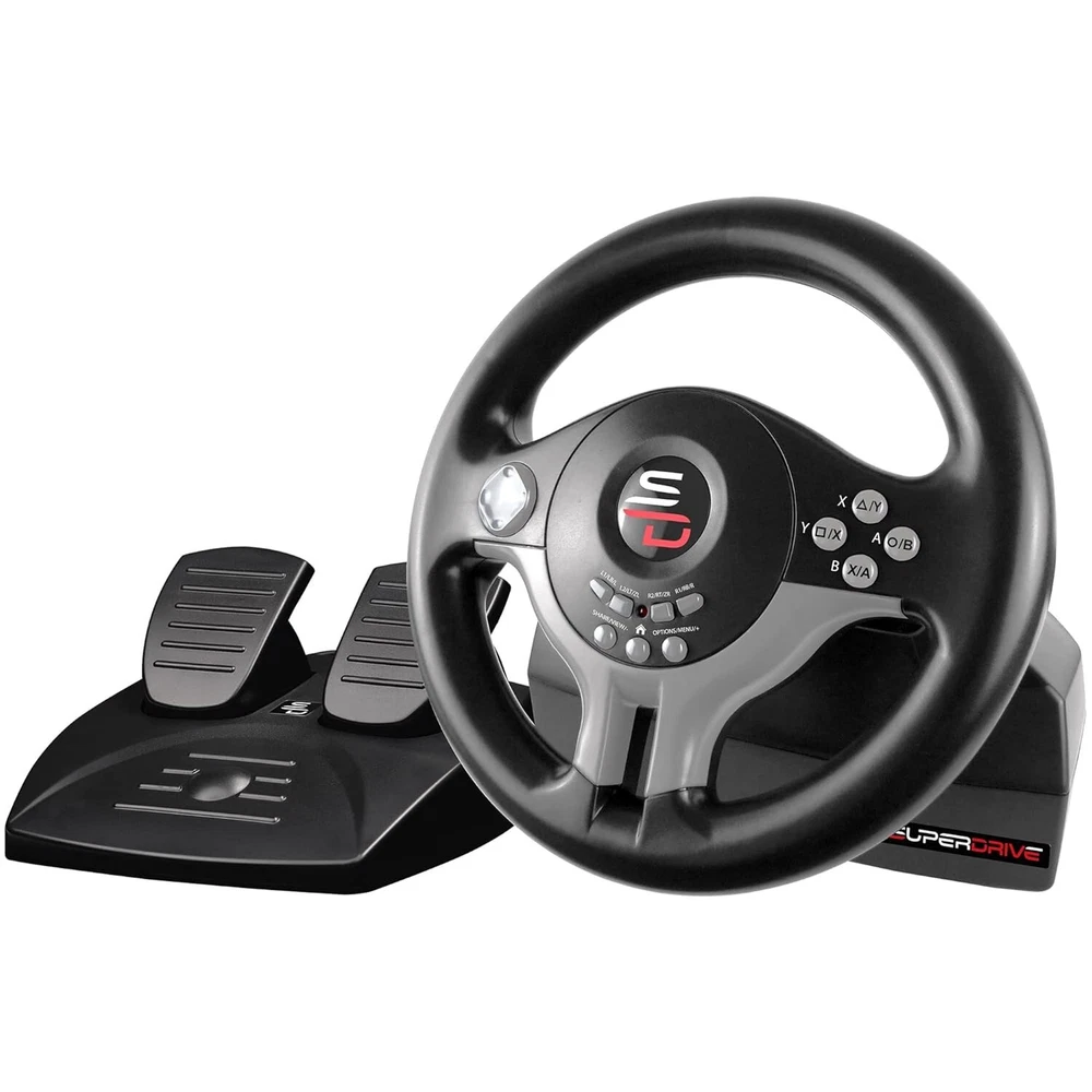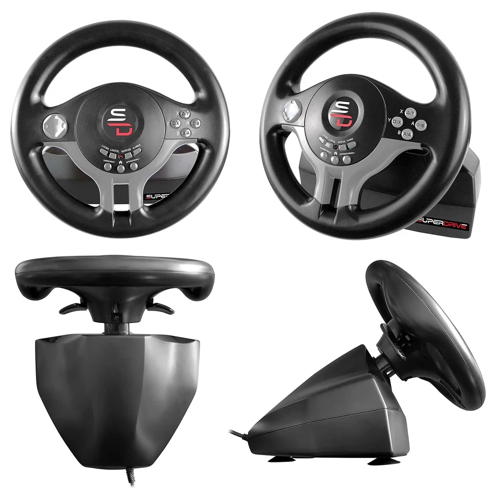 Multi-plateform compatible steering wheel for Switch, PS4, Xbox Serie X/S, Xbox one, PC and PS3. Wired steering wheel, with 180° rotation. Steering wheel with pedals (2) and paddles (+/1) for gear shifting. Sensitivity adjustment with 3 modes. Steering wheel with vibration. Thanks to its programming function, the Superdrive SV250 is compatible with all games on the market: Gran Turismo Sport - Forza motor sport 7 - Drive club - Project Cars - Forza Horizon - GTA V - Farming Simulator. Attaches with suction cups