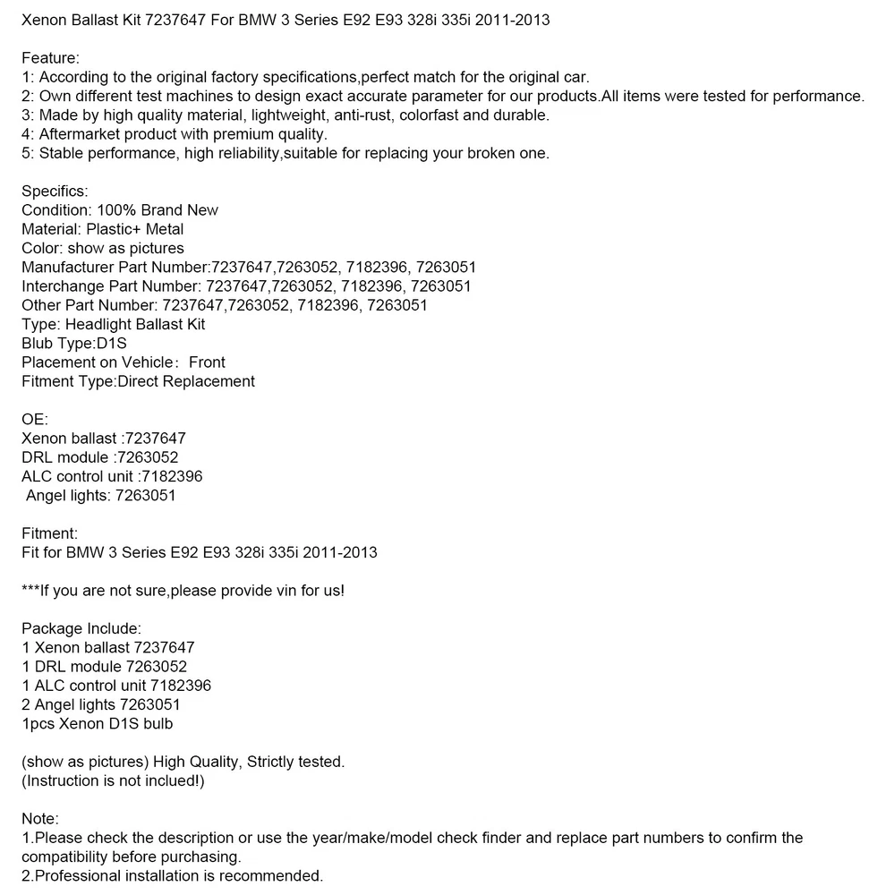 SAFE & SECURE SHOPPING 100% SATISFACTION GUARANTEED FAST SHIPPING Store Categories Store Categories Other eBay Motors Grille You may also like Right Tail Rear Light Assembly 9677205080 For Peugeot Partner Citroen Berlingo 224.65 USD Free shipping Mass Air Flow Meter Sensor 0281006146 For BMW E90 E91 E92 E93 N47 45.79 USD Free shipping NEW Automatic Transmission Valve Body Conductor Plate For Chrysler Dodge 5 Speed 118.99 USD Free shipping NEW 7'' Touch Screen Digitizer B61A611J0 Fit Mazda 3 GPS Alexa 17-18 with Frame 66.99 USD Free shipping Billet Power Steering Pump Bracket Kit Fit Chevy SBC305 327 350 Small Block AF6. 44.65 USD Free shipping Electric Power Window Master Switch BBM2-66-350B For Mazda 3 2010 2011 2012 2013 38.99 USD Free shipping Xenon Ballast Kit 7237647 Fit BMW 3 Series E92 E93 328i 335i 2011-2012 2013. Product Description Xenon Ballast Kit 7237647 For BMW 3 Series E92 E93 328i 335i 2011-2013 Feature: 1: According to the original factory specifications,perfect match for the original car. 2: Own different test machines to design exact accurate parameter for our products.All items were tested for performance. 3: Made by high quality material, lightweight, anti-rust, colorfast and durable. 4: Aftermarket product with premium quality. 5: Stable performance, high reliability,suitable for replacing your broken one. Specifics: Condition: 100% Brand New Material: Plastic+ Metal Color: show as pictures Manufacturer Part Number:7237647,7263052,7182396,7263051 Interchange Part Number: 7237647,7263052,7182396,7263051 Other Part Number: 7237647,7263052,7182396,7263051 Type: Headlight Ballast Kit Blub Type:D1S Placement on Vehicle:Front Fitment Type:Direct Replacement OE: Xenon ballast :7237647 DRL module :7263052 ALC control unit :7182396 Angel lights: 7263051 Fitment: Fit for BMW 3 Series E92 E93 328i 335i 2011-2013 ***If you are not sure,please provide vin for us! Package Include: 1 Xenon ballast 7237647 1 DRL module 7263052 1 ALC control unit 7182396 2 Angel lights 7263051 1pcs Xenon D1S bulb (show as pictures) High Quality, Strictly tested. (Instruction is not inclued!) Note: 1.Please check the description or use the year/make/model check finder and replace part numbers to confirm the compatibility before purchasing. 2.Professional installation is recommended. About Us Shipping Terms Contact Us About Us Bruce & Shark is a company Focus on Motorcycle parts more than 11 years. The design inspiration comes from the awe of the vast sea and worship of the fighting sharks, therefore Bruce & Shark takes a shark as brand logo. Since its inception, we have always put the "customer first" and "top quality" as our principle. We specialized in selling Motorcycle parts and providing customers with various types of high-quality products. Our brand Bruce & Shark has enjoyed good reputation in America, Europe, Japan, Canada and Africa, covering more than 30 countries. Our vision is to deliver high-quality Motorcycle parts products and sincere services to the world. Our main products are motorcycle mounted, fuel pump, stator, windshield, Seat Cover, motorcycle fairing. Welcome to our shop to choose products that are worth more for your Motorcycle! Please Add me to your list of favorite sellers and visit often. Thank you for your business. Shipping Shipping Terms International Buyers – Please Note: 1. Import duties, taxes and charges are not included in the item price or shipping charges. These charges are the buyer’s responsibility. 2. Please check with your country’s customs office to determine what these additional costs will be prior to bidding/buying. 3.Buyers' Information: We strive our best to provide you the most reliable, affordable way of shipping service. But sometimes international delivery is highly depended on the courier company and local customs/duties. If you do not receive your item on time, please sent us ebay message immediately for further assistance. Thank you for your understanding. Terms We stand behind everything that we sell and will do everything possible to assure you are satisfied. When you receive your purchase if you are not 100% satisfied, please sent me ebay message and we will do our best to make you happy. If you still want to return your purchase, simply ship the item(s) back to us and we will refund your original purchase price and the original shipping charge. Buyers are responsible for the postal cost of returning the items. We must be notified of the intent to return your item within 30 days of receiving the item. Items returned must be in the same condition that they were received. How to return 1,Please ask us for return address . 2,Shipping back the package . The RMA#(Return Merchant Authorization Number = Your ebay ID) must be clearly written on the return package ,Otherwise the package will be refused. 3,Sent us the return tracking number. 4,All returns will be inspected prior to a credit being issued. Contact Us Sent ebay message in English If you have any questions, our Customer Service staffs welcome you to sent me ebay message. We strive to answer all questions and resolve any problems as quickly as possible. Business Hours: HongKong Time GMT+8:00 Monday-Saturday 9:00-17:00 Copyright © 2022 Tongtool