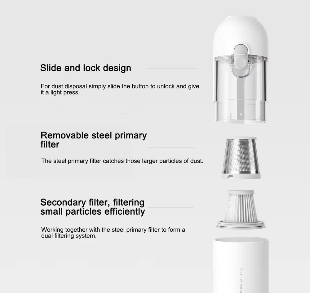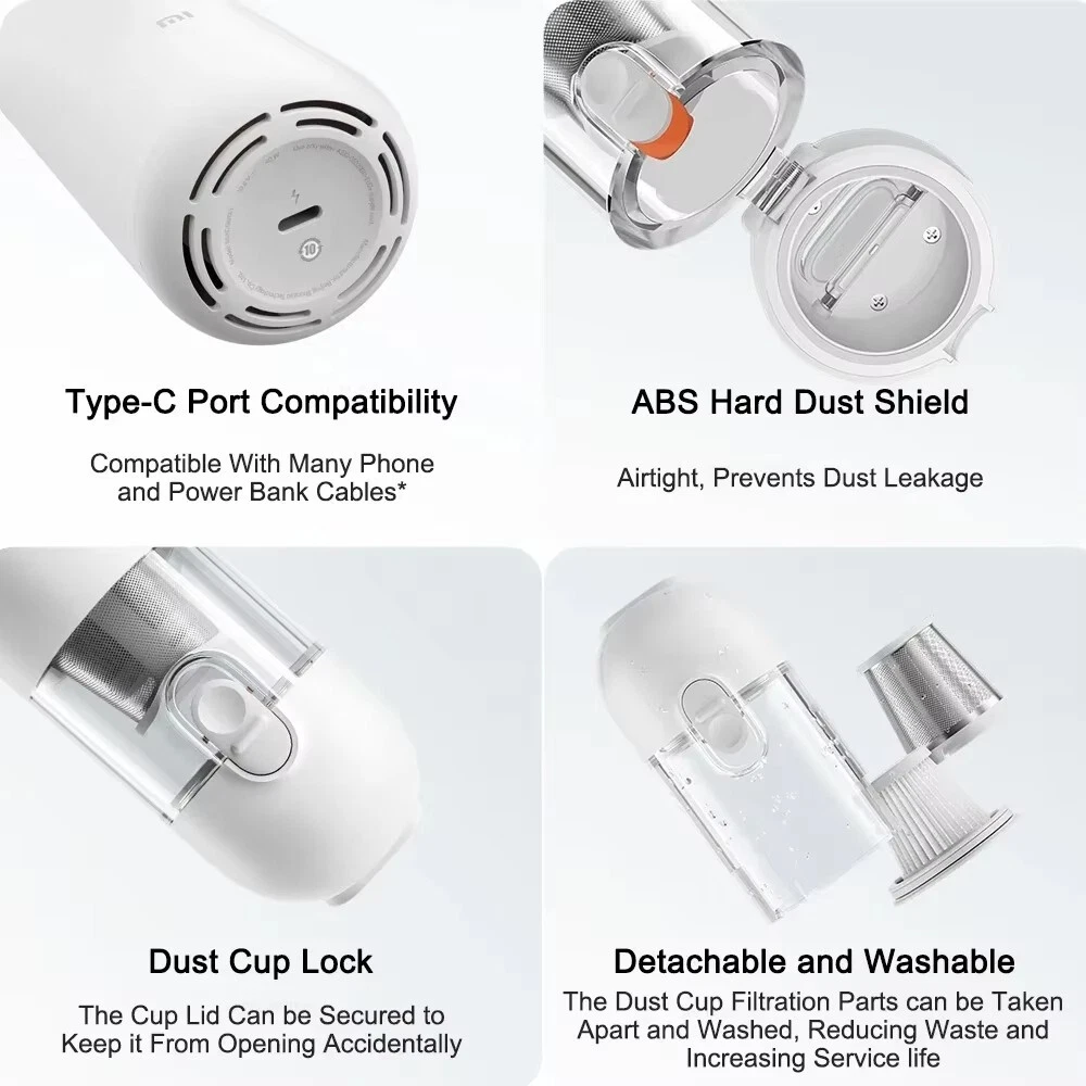 XIAOMI Mini Vacuum Cleaner – Compact, Wireless & Powerful Cleaning Solution Key Features: ✔ Ultra-Portable & Lightweight – Slimmer than a thermos and weighing just 0.5kg , making it easy to store and carry. ✔ Cordless Convenience – Rechargeable battery with 30-minute runtime for hassle-free cleaning anytime, anywhere. ✔ 13000Pa Powerful Suction – Equipped with an 88,000 rpm brushless motor and dual-vent technology for efficient dust removal. ✔ Multifunctional Nozzles – Perfect for home, office, and car cleaning , reaching tight spaces like keyboards, upholstery, and car interiors . ✔ One-Touch Dust Disposal – Empty the dustbin effortlessly with a single button press, keeping your hands clean. ✔ Type-C Fast Charging – Convenient compatibility with smartphone and power bank cables for quick recharging. ✔ Detachable & Washable Filters – Features a steel primary filter and secondary fine particle filter for optimal dust trapping and easy cleaning. Product Specifications: Suction Power : 13000Pa Motor Speed : 88,000 RPM Battery Life : Low Gear : 30 minutes High Gear : 9 minutes Charging Port : Type-C Weight : 0.5kg Filter System : Steel primary filter + secondary fine particle filter Usage : Ideal for home, office, and car cleaning Package Includes: ✔ 1 x Xiaomi Mini Vacuum Cleaner ✔ 1 x Multifunctional Nozzle Set ✔ 1 x Type-C Charging Cable ✔ 1 x User Manual 📌 Note: Do not leave the vacuum in direct sunlight or extreme heat (e.g., inside a car on hot days). Ensure regular cleaning of the filter to maintain optimal performance. 🧹 Compact, efficient, and easy to use – the perfect cleaning companion for modern lifestyles!