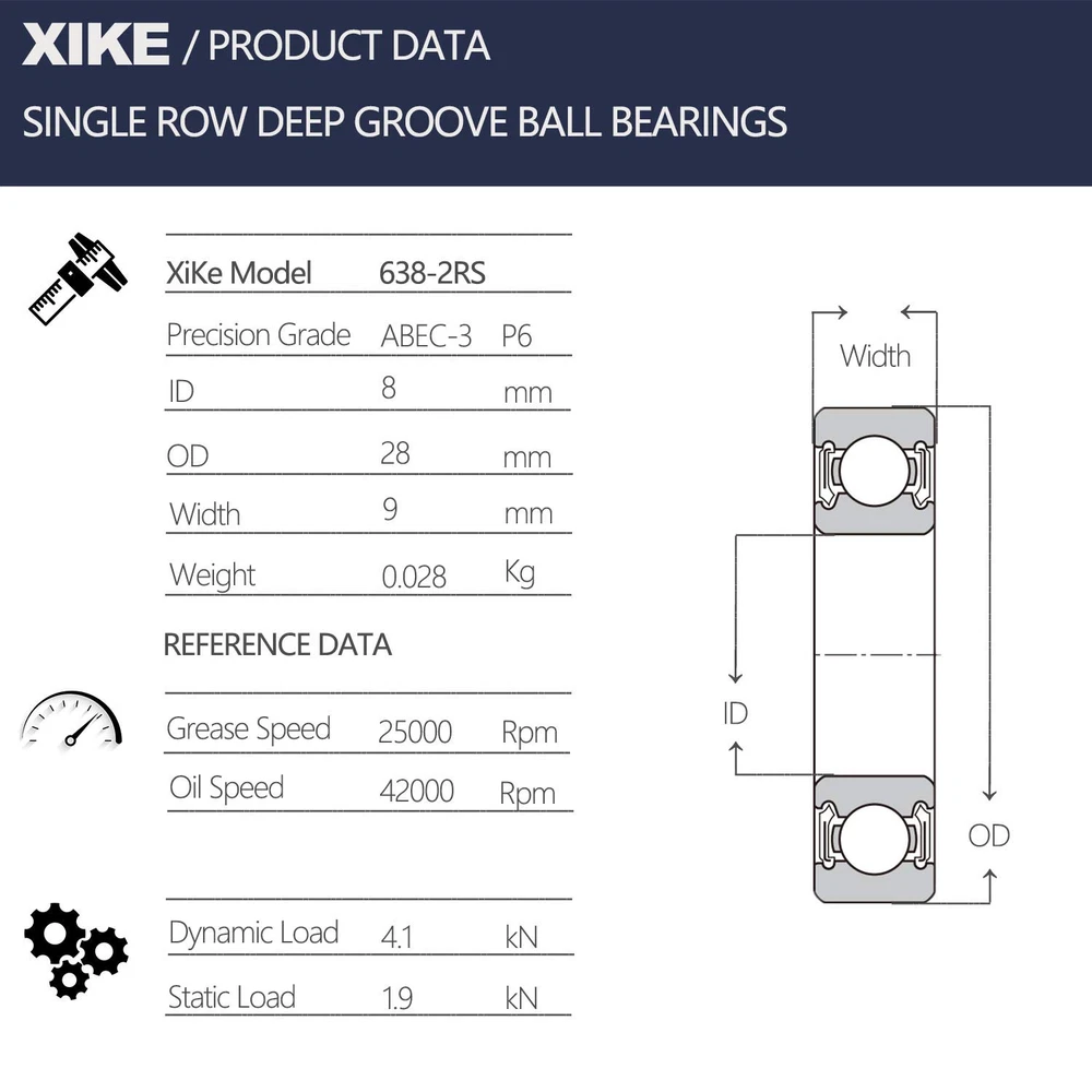 Store New Arrivals Add to Favorite View Feedback Contact Xike 10 Pcs 638-2RS Double Rubber Seal Bearings 8X28X9Mm, Pre-Lubricated and Stable Performance and Cost Effective, Deep Groove Ball Bearings. Description Item model number 2RS Brand XIKE Material Alloy Steel Item Weight 0.27 Kilograms Bearing Number 638 2RS Specification Met ABEC 3 Manufacturer XiKe Product Description XIKE Model B638-2RS Precision grade ABEC-3 / P6 Inside diameter 8mm /0.315 Outside diameter 28mm /1.1024 Thickness 9mm /0.3543 Weight 0.02863kg/0.05841lbs Seals type Double rubber sealed Grease Prelubrication Temperature range -20℃~+120℃ / -4℉~+250℉ Refer dynamic load 4550N /1003lbs Refer static load 1970N /434lbs Refer oil speed 34000RPM Refer grease speed 21800RPM Clearance Standard Materials AISI51200 chromium bearing steel Load distribution Radial and axial ABOUT US We offer the best prices around on high quality products. Our E-store includes media such as books, movies, music and games while offering electronics, toys, sporting apparel, clothing, tools, general home, garden items and more. SHIPPING We are always working hard to ensure your package arrives as soon as possible. Please understand that some factors like weather, high postal traffic, and the performance of shipping companies are outside of our control. We offer free shipping to the lower 48 states and ship within 5 business days of payment, usually sooner. We do not accept P.O. Boxes. Please provide a physical address. RETURNS We offer a 30-Day Return Policy on items which you are not completely satisfied with. You have the option for a full-refund or an exchange of the item. No returns are available on items shipped outside of the USA. PAYMENT We accept PayPal. CONTACT US This page content is yet to come Please ad us to your favorite seller and visit again later Thank You CUSTOMER SATISFACTION We try our very best to make sure every customer is completely satisfied. If there's a problem, message us! We're happy to help.