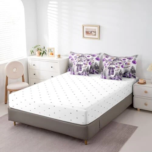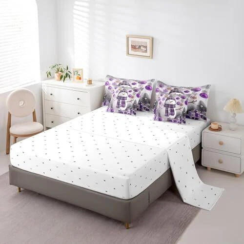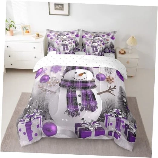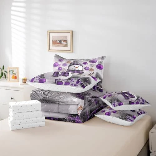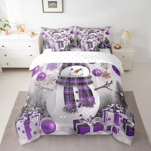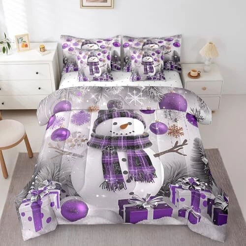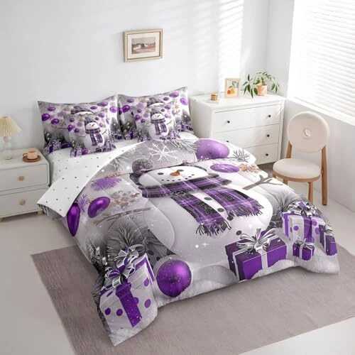 Xmas Bed in a Bag 7 Piece Size Snowman Winter Themed Bedding Set Queen Purple