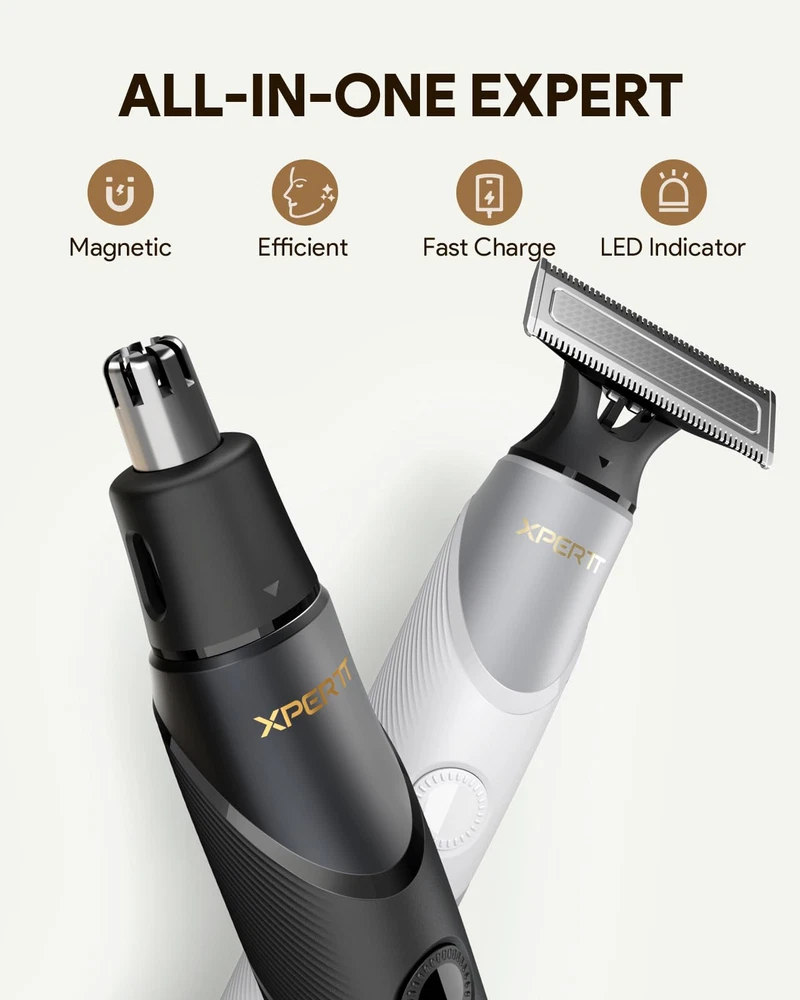 Multi-Purpose Beard Trimmer & Electric Razor: Magnetic replacement head, Easy to assemble, Body Trimmer and shaver, Trim in any direction with the click-on body comb (0.1/3 mm), adjustable guide combs, and skin guard for extra protection of sensitive areas 30-Minute Fast Charge & 90-Minute Long-Lasting Power Electric Shaver: With a Type-C charging cable, this razor charges quickly at home or on the go. Enjoy up to 90 minutes of shaving after a full charge, and use it while charging for uninterrupted grooming. Perfect for daily use and travel The Set Includes: 1x Xpert T Electric Raror, 1x Blade, 1x Nose hair trimmer, 1x 12in1 adjustable comb , 2x body guide coms, 1x protection cap, 1x Type-C charging cable (no power adapter) Dual-Sided Blade: Effortlessly shave in both directions for consistent skin contact and precise control. Trim and shave hard-to-reach areas with fewer strokes, while the ultra-durable blade ensures long-lasting performance Customer Service: If you have any other question about the product, please contact us in any time, we will reply you ASAP