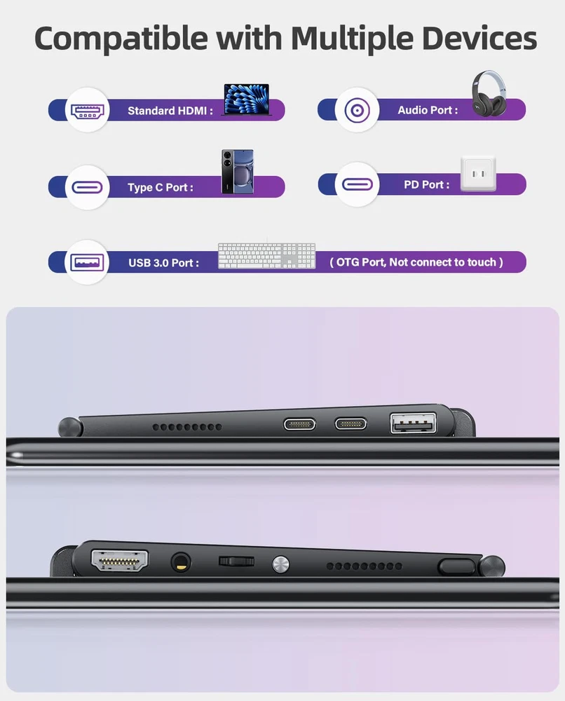 2024 Innovative Adjustable Kickstand: The First monitor achieving freeswitching between landscape and portrait mode in 0-110°adjustable viewing angle, fits your different working requirements perfectly; All ports integrated on the mini kickstand, makes all cables invisible automatically and connections more stable; Before using the monitor, please download and read the User Guide below 10-point Capacitive Touchscreen Monitor: with all system of PC, & Chrome; Adopted G+FF technology, support much more precise and sensitive touch, no extra driver needed, just connect the USB cable to your device to achieve the touch; NOTE: To realize the touch function, there must be a USB C to A or USB C to C cable connected to the USB C port on the monitor to your device directly; The touch function does not support right-click and long-press to activate the option operation Full-featured Port Only for : Built in Standard HDMI port that plug-in test over 5000 times and more 2000 times than mini HDMI port; USB 3.0 port that can connect to keyboard or directly and without any more adapter; Type C port that support usb-c cable to display & power First Portable Screen with 2000:1 Contrast Ratio: The 2000:1 high contrast ratio of the hardware will make the screen have better "shading performance", allowing you to see more dark and bright details, but will not overburden the bright parts; It is roughly equivalent to a natural HDR effect of "non-brightness and non-coding"; 100% sRGB High Color Gamut deliver you brighter, crisper, and more natural colors Entertainment Upgraded with Colorful Flowing Atmosphere Lights: First portable monitor built in Ambient Light and it has 10 working mode: Vivid, Colorful, White, Purple, Blue, Cyan, Green, Yellow, Orange, Red, put you in the world of gaming e-sports; Low-power Mode has also been added to this monitor, just choose what you need; We provide 3-year service and 24-hour ; Please rest assured that any issues will be promptly resolved within 8 hours