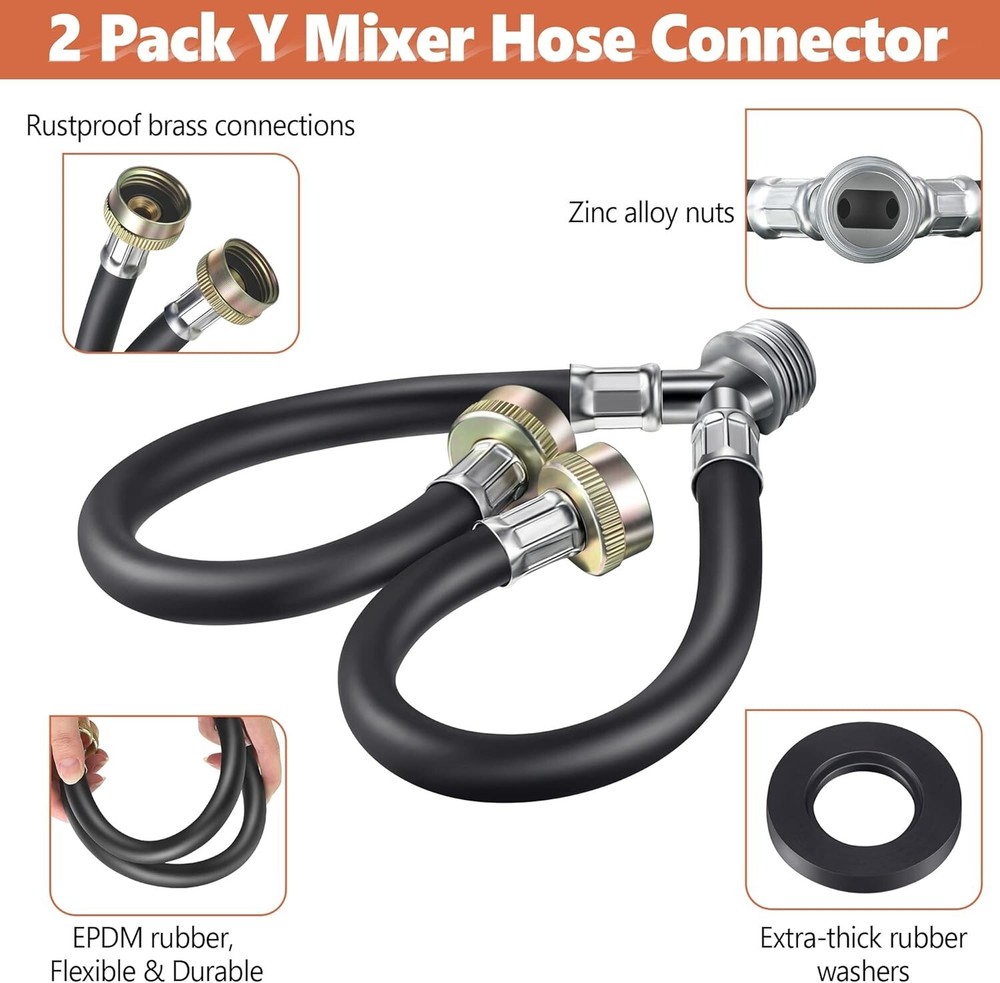Dimensiones del producto: 30 cm (12 pulgadas) de largo por cada pata en Y; rosca macho de manguera de 19 mm (MHT) y rosca hembra de manguera de 19 mm (FHT) con 2 arandelas de goma resistentes. Conexión sin fugas: Esta manguera en Y cuenta con un conector de latón en cada extremo hembra y un conector de aleación de zinc en el extremo macho. Los conectores de latón de calidad con juntas de goma en ambos extremos hembra garantizan una conexión hermética. La manguera mezcladora en Y está hecha de PVC, engrosada y a prueba de explosiones, no conduce la electricidad ni se oxida, lo que la protege del frío en invierno. Suministro de agua fría y caliente: Esta manguera de drenaje para lavadora conecta la entrada de agua fría y caliente de la lavadora con la salida de agua fría. Su interfaz dual permite alternar entre agua fría y caliente. La manguera de drenaje para lavadora está hecha de goma reforzada. Soporta una presión de trabajo de 300 PSI y una presión de ruptura de hasta 900 PSI. Usos versátiles: El conector universal flexible para manguera mezcladora en Y se utiliza ampliamente en lavadoras, vaporeras, conversiones de calentadores de agua, lavavajillas, equipos de jardinería, etc. Se conecta fácilmente a las líneas de suministro de agua domésticas, tanto exteriores como interiores. Contenido del paquete: Este paquete incluye 1 manguera en Y de 30 cm para lavadora y 1 junta de goma, apta para suministro de agua fría y caliente. Asegúrese de que los grifos de suministro estén cerrados antes de la instalación.
