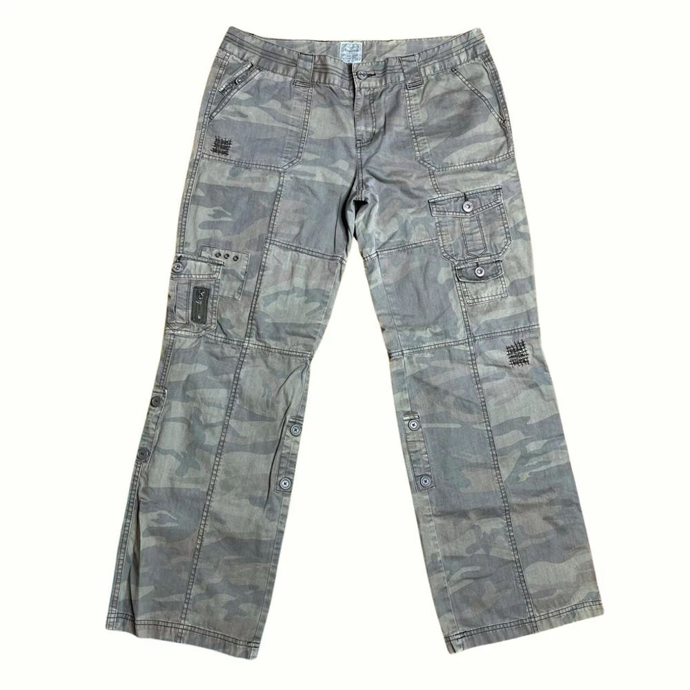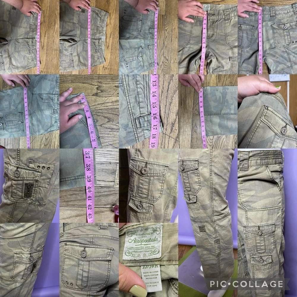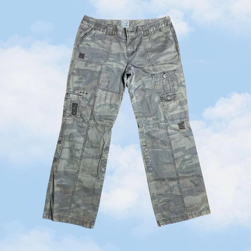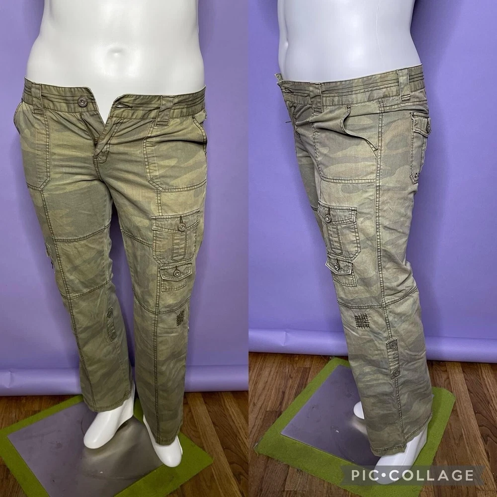 2000s camo print low-mid rise flare cargo pants!🧸 Has pockets & zippers all over the legs, the pants have a low-mid rise fit!💚 Brand; Aeropostale Tag size; Womens 13/14R WAIST; over 35in-36in (over 17.5in flat & 18in pulled tight) HIPS; 42in (21in laying flat) THIGH; 25in-26in (12.5in flat & 13in pulled) FRONT RISE; 9in BACK RISE; 12.5in LENGTH; 39.5in (measured from the side) INSEAM; 30in FLARE; 10in Light weight, the Fabric doesn’t have stretch! In worn & faded condition! Has scuffs, snags, pilling, discoloration & stains! Way more faded/less saturated in person! Not all flaws are photographed, I’m NOT responsible for the fit, (first photo is edited!) (TOO TIGHT ON MODEL DOES NOT FIT) Model’s Measurements: Height: 66" (5’6), Bust: 43", Waist: 36.5", Hips: 44.5 SOLD AS IS!