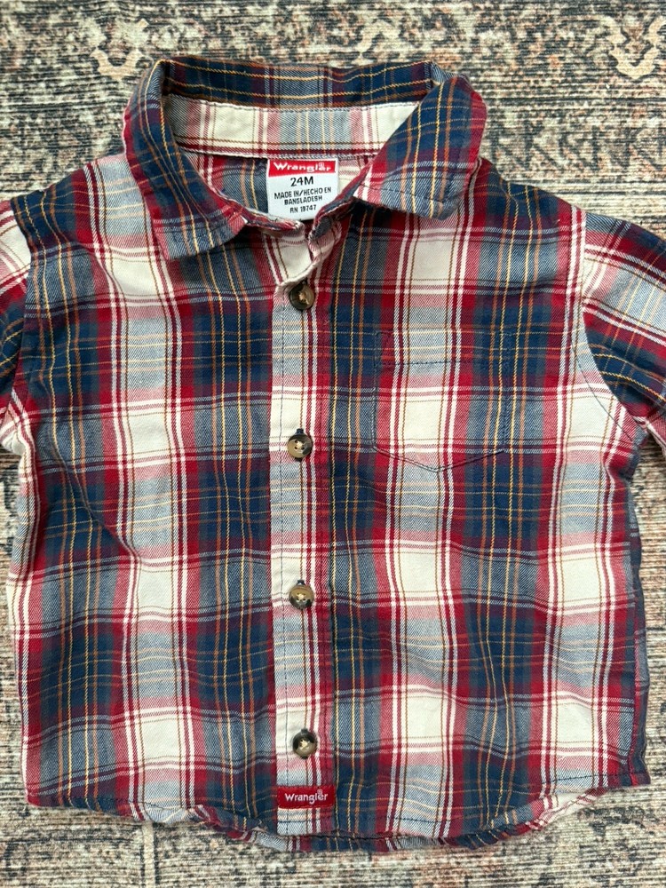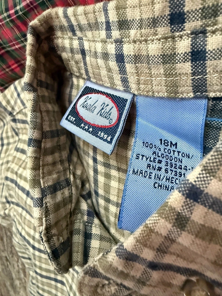 18m Ralph Lauren plaid button down 18m Koala kids plaid button down 24m Wrangler plaid (fits like an 18m) 2t Cherokee brown cargo style pants All in great condition.