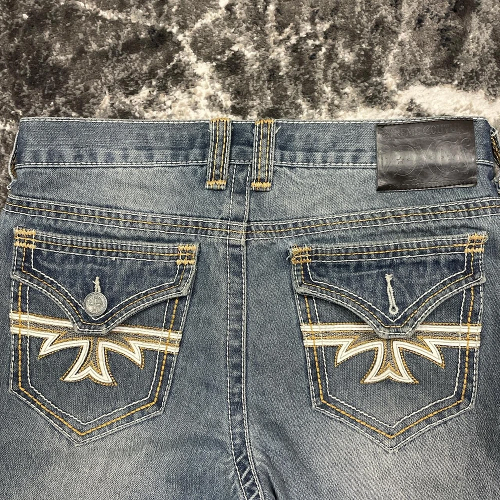 • Great condition, just a small hole in left pocket + missing button on back right pocket (pictured last and item discounted). Distressing on front is manufactured & intentional by designer • Waist: 32" Inseam: 32", Leg Opening: 9" • Items shipped everyday Monday through Saturday. Feel free to message if you have additional questions.
