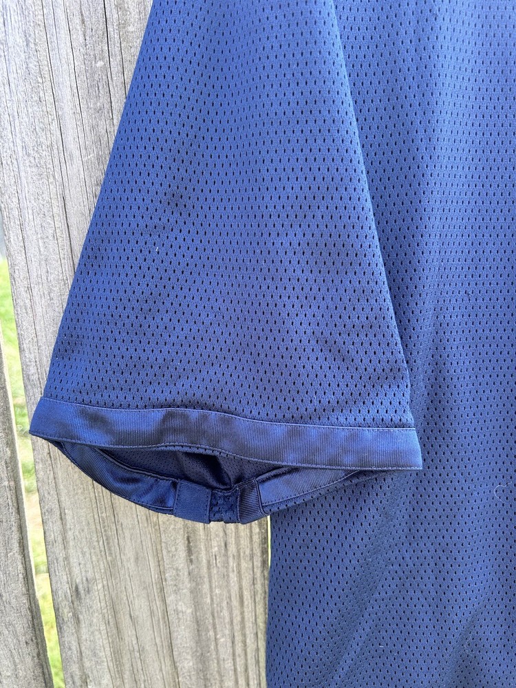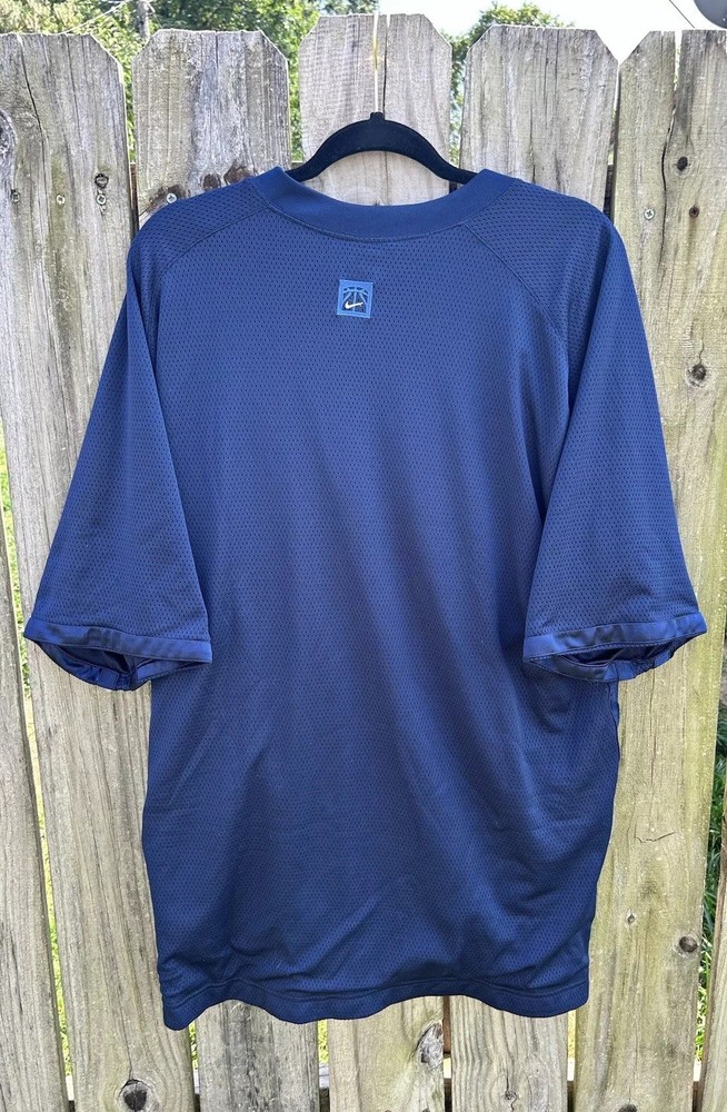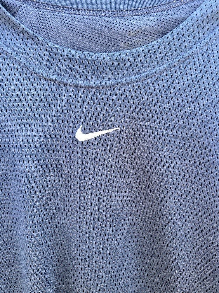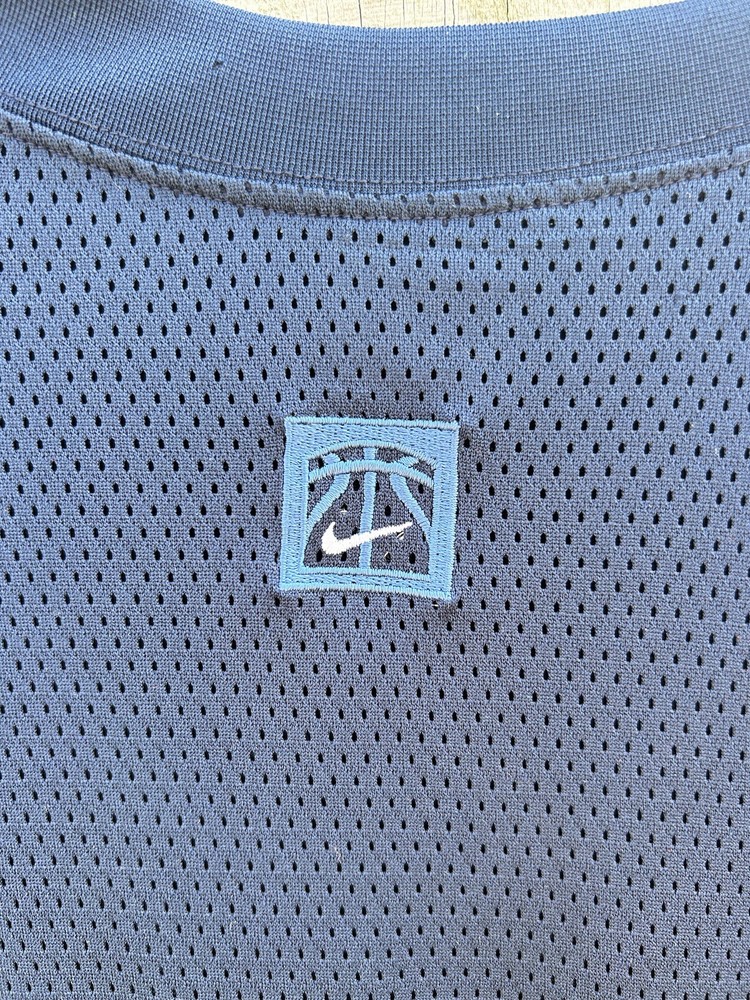 Nike Basketball Shirt Men’s Shirt Navy Athletic Jersey Center Swoosh Large Width: 24 in Length: 30 Please be aware that used, vintage, or older items may show a few signs of wear or slight fading due to age. Anything visible such as stains, rips or holes are a possibility if not shown initially. Measurements are taken from armpit to armpit and from the neck of the shirt to the bottom hem of the shirt. 78