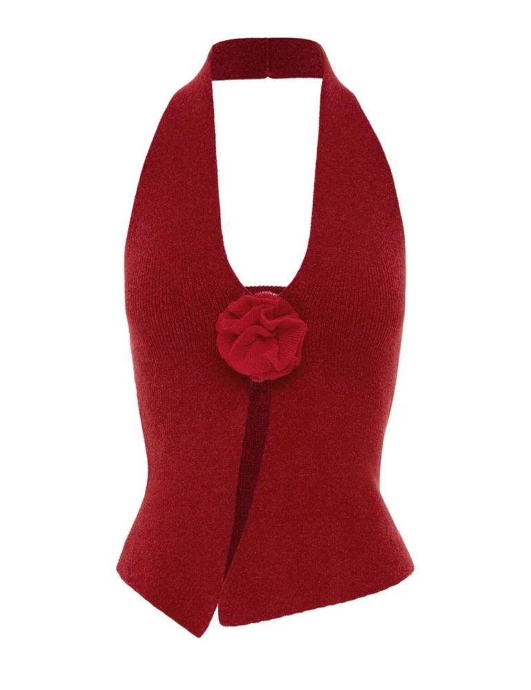 Gorgeous red top in halter neck style with an open back and a split front to reveal some skin like a crop top. Rose knitted in the centre for an extra pop to any look. Take your usual size or size down if you want a super fitted look. If you have any questions about this item please message us and receive a speedy response