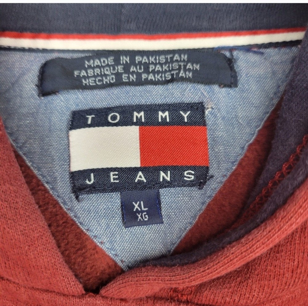 This Y2K 2003 Tommy Jeans Red Pullover Hoodie features a retro Tommy Hilfiger design with a logo accent, making it a vintage piece perfect for men in size XL. Made from a cotton blend knit fabric, it has long sleeves and a hood for added warmth during the winter, fall, or spring seasons. The pullover style offers a regular fit and embodies a classic Tommy Jeans look that is both stylish and comfortable for everyday wear. Made in Pakistan, this hoodie is a timeless addition to any wardrobe. Flat measurements Length 29" Chest 27"
