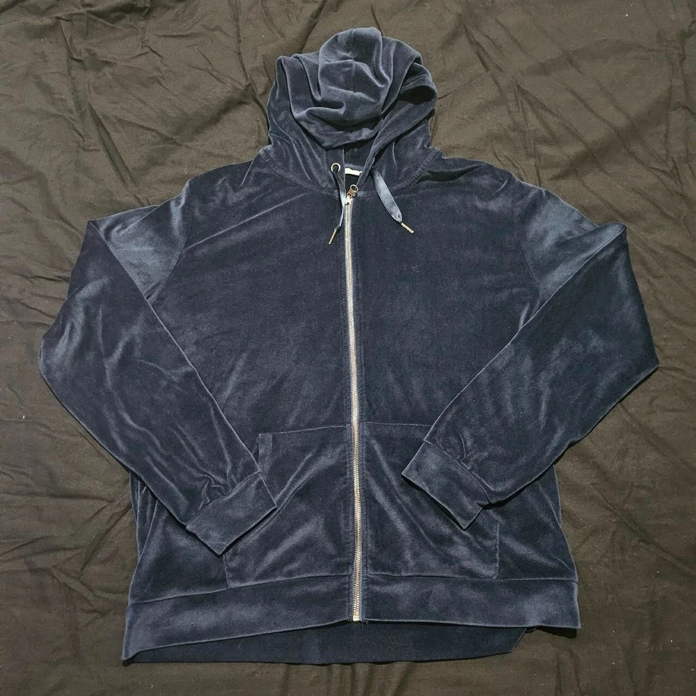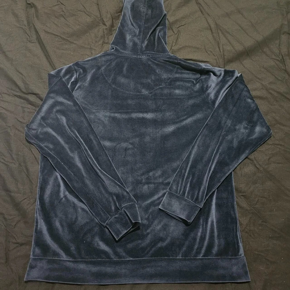 Y2K Velour Style Navy Blue Hoodie Stay cosy and stylish with this velour-style hoodie, perfect for casual days or layering up in colder weather. - Colour: Navy Blue - Size: 16 (Pit to Pit: 58 cm) - Silver zip front for easy wear - Ribbon hood tie for a cute and adjustable fit - Hardly worn, in excellent condition