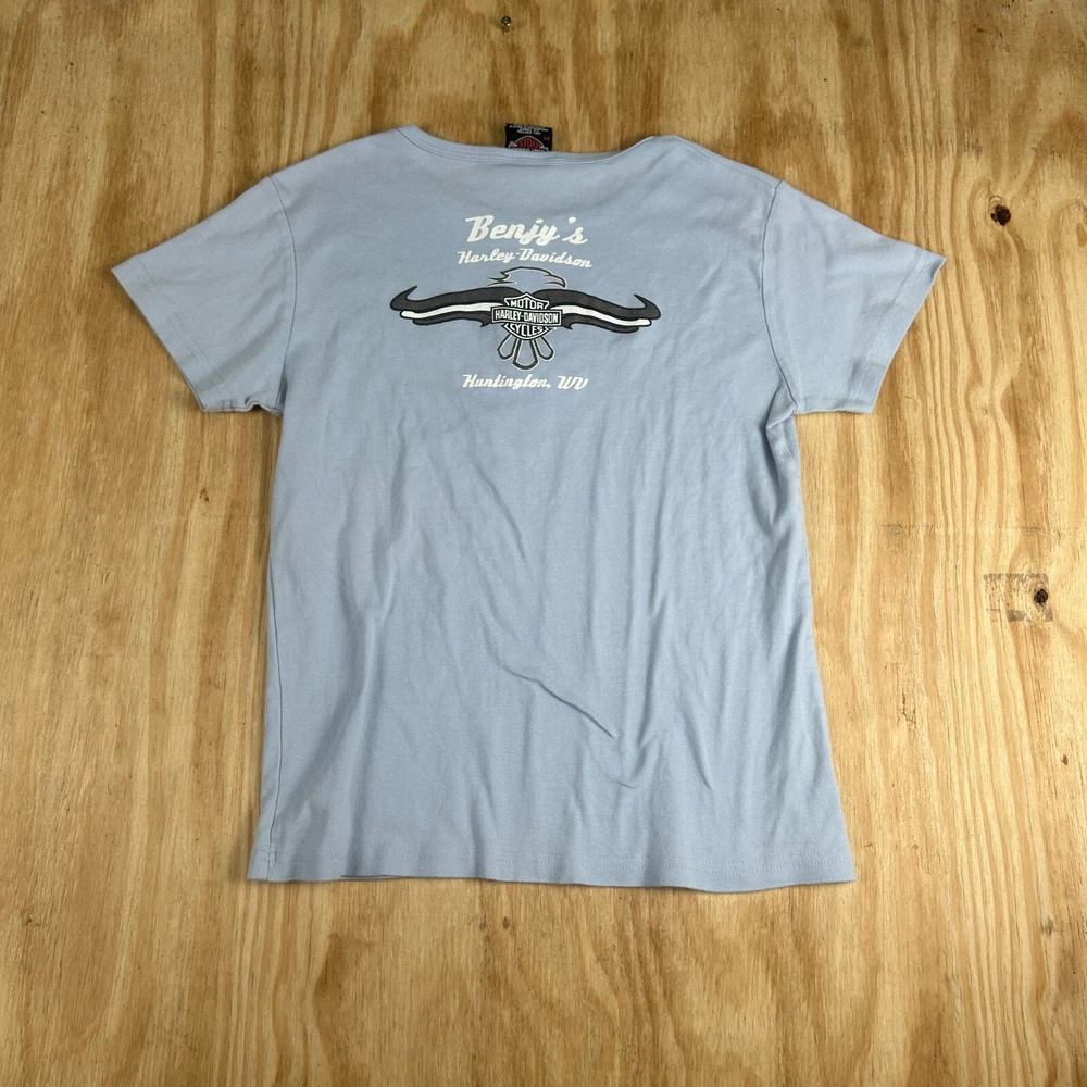 This Y2k Benjy's Harley Davidson T-Shirt is a must-have for any cat lover who loves the open road. The blue, crew neck tee features a cute cat graphic and is made of 100% cotton for easy care and breathability. It's perfect for casual wear or travel and can be worn during all seasons, including summer, fall, and spring. The T-Shirt is a regular fit and comes in women's size 2XL. It has short sleeves and a neckline that's perfect for displaying your favorite accessories. This unit is a single, machine-washable garment that's made in Mexico. Add it to your collection today and show off your love for cats and Harley-Davidson.