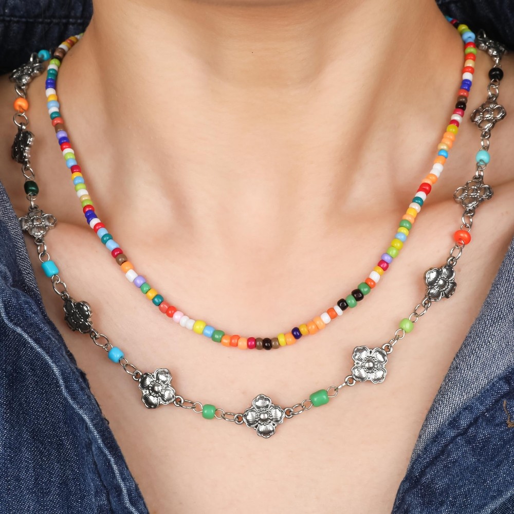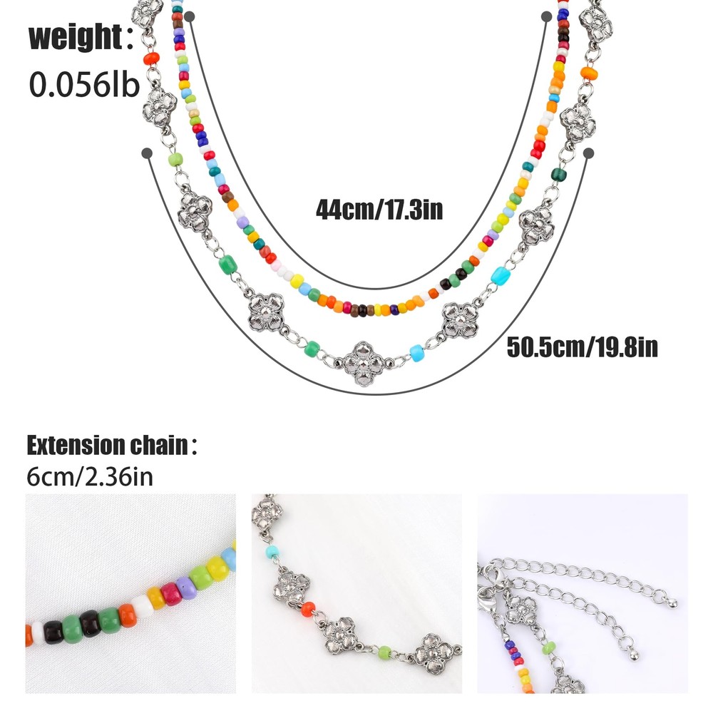 【Unique Dual Chain Design】Enhance your style with our beautifully crafted Y2k Flower Layered Choker Necklace, featuring a distinctive dual chain design. The shorter necklace is adorned with vibrant, colorful rice beads that add a pop of color and fun to your outfit, while the longer chain is elegantly decorated with delicate silver flower charms, creating a harmonious and eye-catching combination. 【High-Quality Materials】This flower layered choker necklace is made from durable alloy and high-quality rice beads, ensuring a robust and polished finish. The alloy provides strength and longevity, while the rice beads and silver flowers add a touch of elegance and sophistication to your look. Each element is carefully selected and crafted to ensure a premium accessory that stands the test of time. 【Versatile and Trendy】Perfect for any occasion, whether it's a casual day out or a formal event, this flower choker necklace adds a chic and trendy touch to any outfit. Its versatile design allows you to wear it as a standalone statement piece or layer it with other necklaces to create a stylish, bohemian-inspired look. The combination of colorful beads and silver flowers makes it suitable for a variety of fashion styles. 【Comfortable Fit】Designed with comfort in mind, the flower layered choker necklace features a short chain that sits gracefully around your neck, complemented by a longer chain that adds a stylish layered effect. The lightweight materials ensure that you can wear it all day without any discomfort, making it a perfect accessory for daily wear or special occasions. 【Perfect Gift】Looking for a thoughtful and stylish gift? This Flower Choker Necklace is an ideal choice for birthdays, anniversaries, holidays, or any special occasion. It comes beautifully packaged and ready to be presented to a loved one, making it a meaningful and elegant addition to any jewelry collection. Show someone special how much you care with this unique and beautiful flower layered choker necklace.