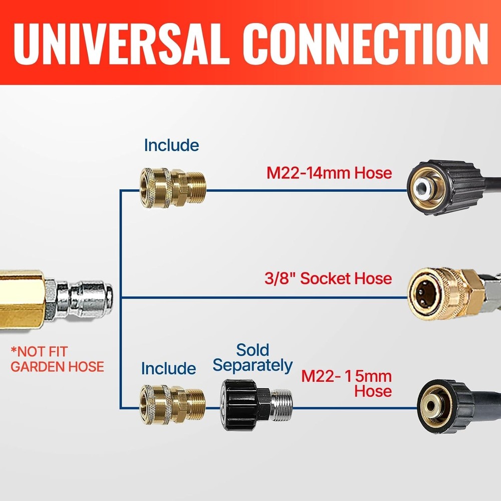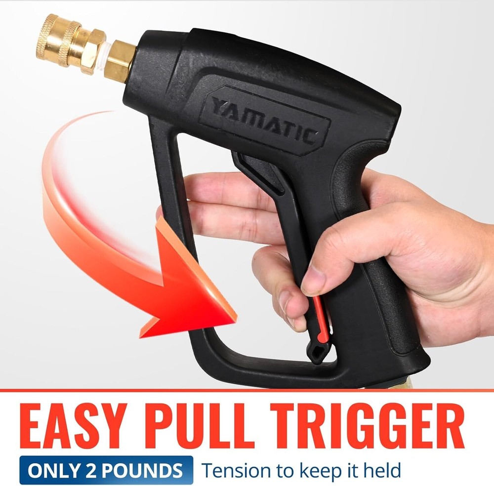YAMATIC Short Pressure Washer Gun with Swivel Brass 3/8" Quick Connector, Power Washer Handle with Easy Pull Trigger Replacement for Ryobi, Simpson, Craftsman, DeWalt, 4000 PSI [360-Degree Swivel Design] Enjoy the benefits of a swivel inlet rotates 360 degrees, preventing power washer hose tangles all the time. This feature makes pressure washing more efficient, allowing you to clean from top to bottom without wrestling with the pressure washer hose. PLEASE NOTE: Not fit garden hose, water hose. [Quality Craftsmanship] The pressure washer gun comes with SOLID BRASS inlet with steel 3/8" plug and lock tite, ensuring durability, leak resistance. 1/4" brass quick connector including teflon tape to prevent leak, easy disconnect. The internal trigger is also crafted with superior quality stainless steel, steel pole connector, and ceramic trigger for low vibration and long working life. [Maneuverable Design] The lightweight pull-trigger and shockproof handle design allows you to hold the pressure washer handle for extended periods without fatigue. The snub nose design makes it easy to maneuver with just one hand. The short gun design is convenient for use with a foam cannon, providing control and ease of handling. [Complete Set for Efficiency] The power washer gun includes a 3/8" swivel quick connector, M22-14mm male coupler, and 5 spray nozzle tips, providing a complete set for foam cannon to creat thick foam,suitable for commercial, home, or professional use. It is compatible with SIMPSON, Briggs & Stratton, CRAFTSMAN, Ryobi, Troy Bilt, Champion, Honda, Excell, and various high-pressure washer brands, and works great in different cleaning applications, such as cars, roofs, windows, and sidewalks. [Value Service] Please feel free to message us if you have any item or technical problems with this short power washer gun, we provide 7X24 hours of customer service. Welcome to check other pressure washer accessories at YAMATIC Power Center Store.