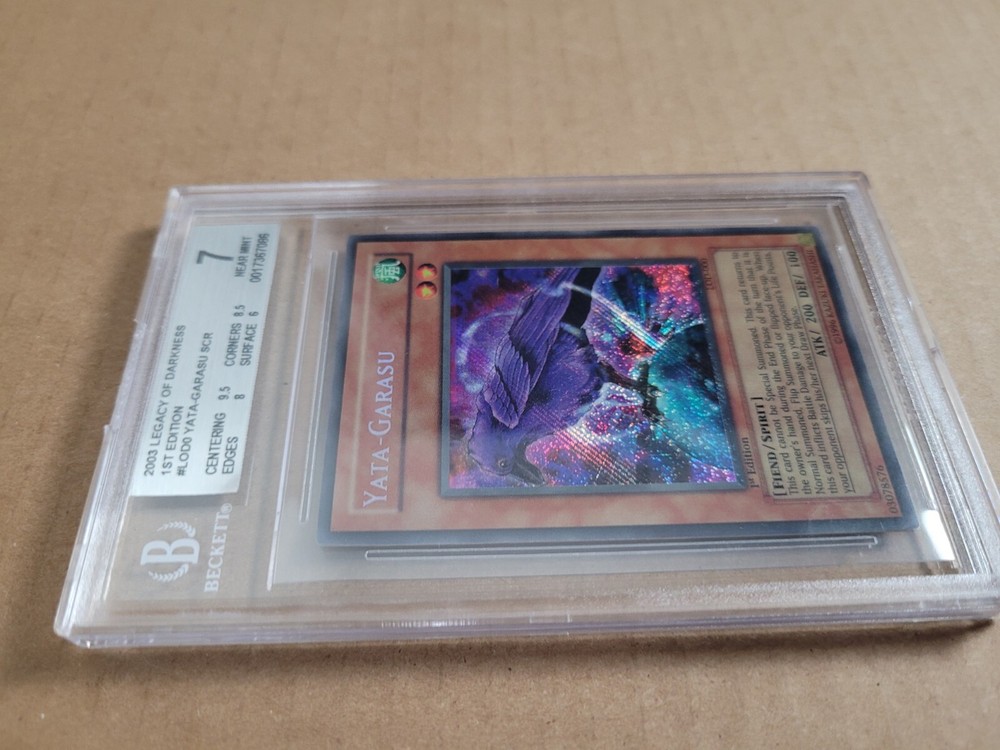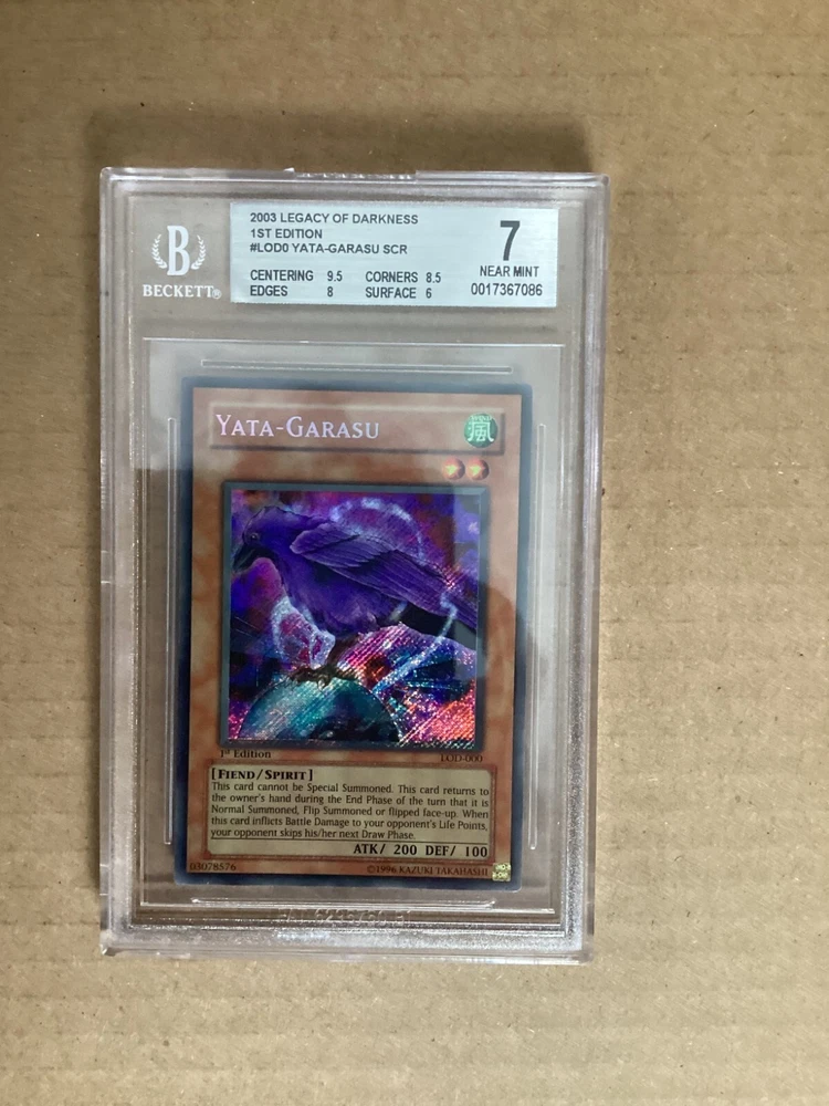Step into the world of strategic duels with the Yata-Garasu card from the Legacy of Darkness set, a must-have for any Yu-Gi-Oh! TCG enthusiast. This card, numbered LOD-000, features the iconic imagery and intricate detail that Konami is known for, making it a standout piece in any collection. The Yata-Garasu card is a Secret Rare gem from the 2003 series, presented in English with the classic Japanese card size. It's not just a collectible but a pivotal piece for players looking to enhance their gameplay experience. Enhance your deck with this timeless card and leave an impression on the table. Gorgeous full foil bleed, a true gem for any collection. It truly sparkles from edge to edge. Centering: 9.5 Corners: 8.5 Edges: 8 Surface: 6