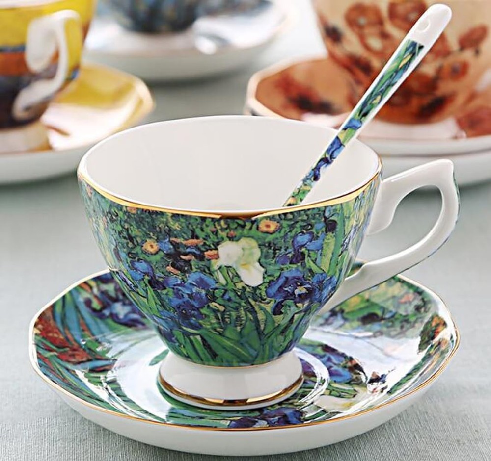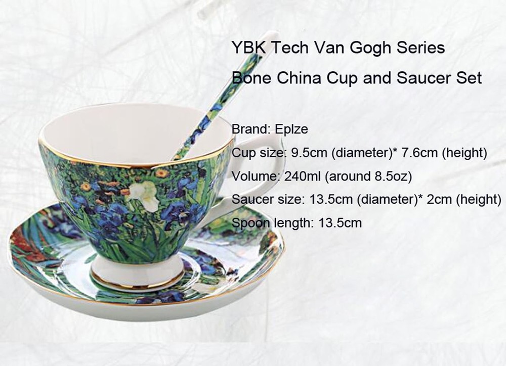 Introduction : The bone china porcelain cup and saucer set is exquisitely designed. With good workmanship, it’s of very good quality. The Van Gogh oil painting patterns look quite retro, classic and elegant. It comes with a carton gift box. Perfect gift for mum, parents, friends, leaders as well as those who like tasting different kinds of tea. Features: * Thin but luxury, smooth surface makes it different from ordinary porcelain. * It’s conform to the bone china national standard, environmentally friendly. * Simple and stylish, royal and classy. *It catches the light quite nicely. * The saucers are rounded, quite practical to use. Specifications : Volume: 200ml (around 7oz) cup size: 9cm (diameter)*7.2cm (height) Saucer diameter: 13.4cm Tips: * You’d better wash it by hand as it’s quite delicate, NOT for microwave use * Due to the light settings, the actual color may differ a bit from what you see in the photos, but generally the same. Package includes: 1* Cup 1* Saucer 1* Spoon YBK Tech strives to provide the quality items and good service for you. Please feel free to contact us by email or Amazon message if you have any questions or need any help, we will answer and help within 24 hours. ^_^ The cup& saucer set is of good quality, with smooth surface, it looks very elegant and exquisite. Soft lines and noble temperament, gold rim trim, good for table and kitchen decoration. Fine bone china, world famous oil painting patterns, good workmanship. Brand: , Capacity: 200ml (7oz). Comes with sturdy carton gift package, including a cup, saucer and spoon