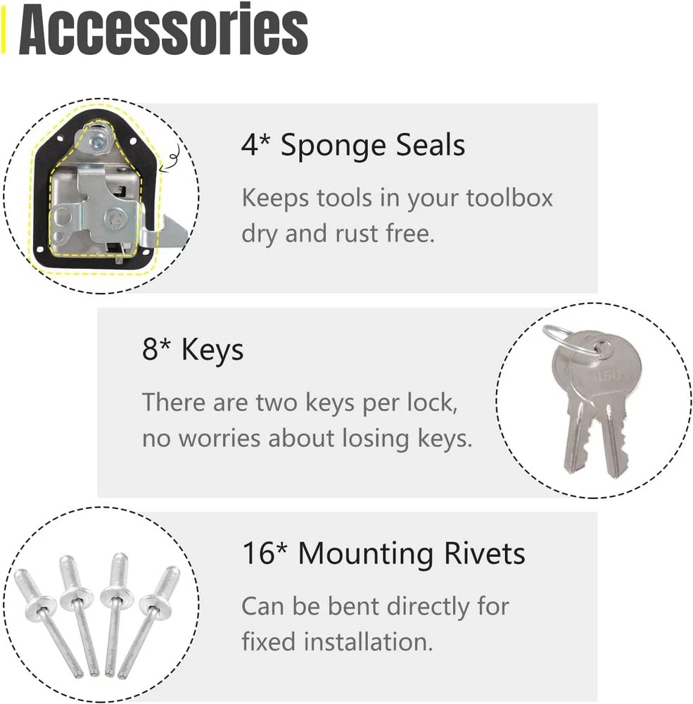 Store New Arrivals Add to Favorite View Feedback Contact YESHMA 2Pcs Truck Tool Box Latch Toolbox Paddle Lock Replacement Handle Stainless Steel with Keys & Rivets for Truck Trailer UTV ATV Toolbox Description Item model number 6d958c6d-51a2-4f57-b1bd-b0c02eedf8ad Style Modern Number of Pieces 2 Color Silver Included Components 2pcs tool box latches, 2pcs gaskets, 4pcs keys, 8 mounting rivets Brand YESHMA Material Stainless Steel, Rubber Control Method App Batteries Required? No Item Weight 1.28 pounds Size 2 Pieces Lock Type Key Lock Recommended Uses For Product Securing and accessing tool boxes in trucks, trailers, UTVs, ATVs, and electrical cabinets Batteries Included? No Special Features Waterproof Manufacturer YESHMA Special Feature Waterproof Package Dimensions 4.8 x 4.57 x 4.49 inches Controller Type Hand Control [WIDE APPLICATIONS] Truck toolbox locks replace electrical cabinets, mobile toolboxes, power distribution cabinets, control cabinets and vehicle toolbox locks. Can be mounted on caravan, truck, trailer, UTV, ATV, UWS toolbox. [High Quality] The truck toolbox lock is made of high-quality 304 stainless steel, which is waterproof and rust-proof, strong and durable to keep your items safe in transit. [Safety and sealing] The keyhole will automatically close to achieve the function of waterproof and dustproof. Features a rubber seal to keep moisture out of the toolbox, ensuring your tools stay dry and rust-free. [Easy to install and use] Equipped with blind rivets, it can be bent and fixed directly. Install and easily replace old latches in minutes. After unlocking, it can be opened by gently pulling it. [Note] Universal to replace most truck tool box locks, but please confirm size before purchasing. If there is any quality problem with the product, please contact us to solve it. Product Description YESHMA 2Pcs Truck Tool Box Latch Toolbox Paddle Lock Replacement Handle Stainless Steel with Keys & Rivets Overall size: 4.4" x 3.22". Use as Toolbox Latch: Replace electrical cabinets, mobile toolboxes, power distribution cabinets, control cabinets and vehicle toolbox locks. Package Includes: 2pcs tool box latches, 2pcs gaskets, 4pcs keys, 8 mounting rivets. Note: Please confirm size before purchasing Keys & Keyholes-Auto close Mounting rivets & Reserved Holes-Easy to install Sponge Gaskets-Keeps tools dry and rust free Handle & Deadbolt-Safe and smooth 304 Stainless Steel-Sturdy and durable Replace Toolbox Lock-Universal for the right size ABOUT US We offer the best prices around on high quality products. Our E-store includes media such as books, movies, music and games while offering electronics, toys, sporting apparel, clothing, tools, general home, garden items and more. SHIPPING We are always working hard to ensure your package arrives as soon as possible. Please understand that some factors like weather, high postal traffic, and the performance of shipping companies are outside of our control. We offer free shipping to the lower 48 states and ship within 2 business days of payment, usually sooner. We do not accept P.O. Boxes. Please provide a physical address. RETURNS We offer a 30-Day Return Policy on items which you are not completely satisfied with. You have the option for a full-refund or an exchange of the item. No returns are available on items shipped outside of the USA. PAYMENT We accept PayPal. CONTACT US This page content is yet to come Please ad us to your favorite seller and visit again later Thank You CUSTOMER SATISFACTION We try our very best to make sure every customer is completely satisfied. If there's a problem, message us! We're happy to help.