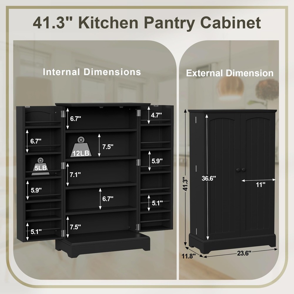 Elegant and Environmentally: Our kitchen storage cabinet combines elegance and practicality.Crafted from premium fiberboard with a black finish.It is worth mentioning that the paint we use is environmentally friendly, so you don't have to worry about toxic or irritating odors. Tailored Organization: 6 adjustable shelves accommodate items of various sizes. Convenient knobs, magnetic door locks and select metal hinges make it easy to open and close the cabinet doors. Versatile Style: This multi-functional cabinet can provide additional storage space in the bedroom, bathroom, kitchen or hallway, etc., beautiful and functional,its clean lines and adaptable design complement various furniture styles. Sturdy Build: Made from MDF, the freestanding cabinet is durable. The wide base ensures stability for safe use. In addition, you can fix the floor cabinet with anti-tipping device to the wall to prevent it from tipping over. Ample Storage: With 5 interior shelves and 12 side shelves, it offers multi-level storage. Frame bars on side shelves prevent toppling.The cabinet's dimensions in 12"D x 24"W x 42"H