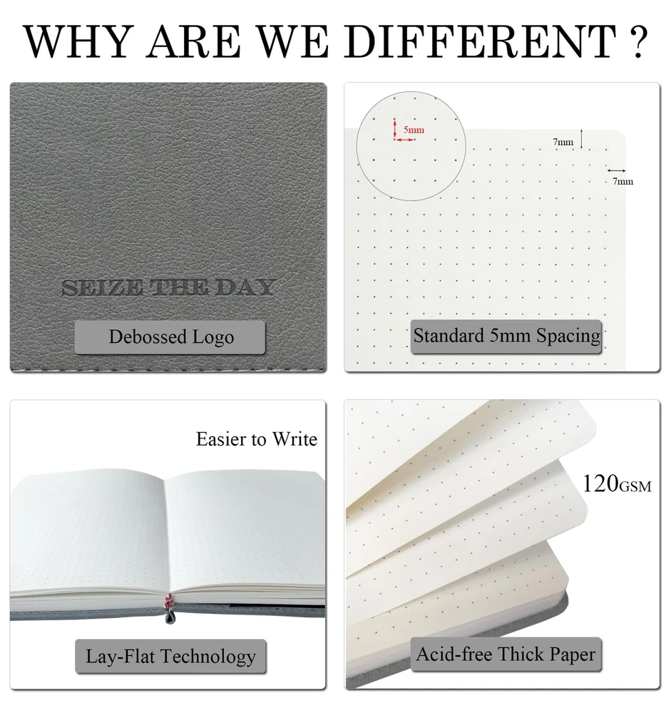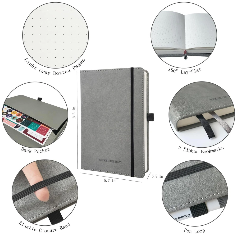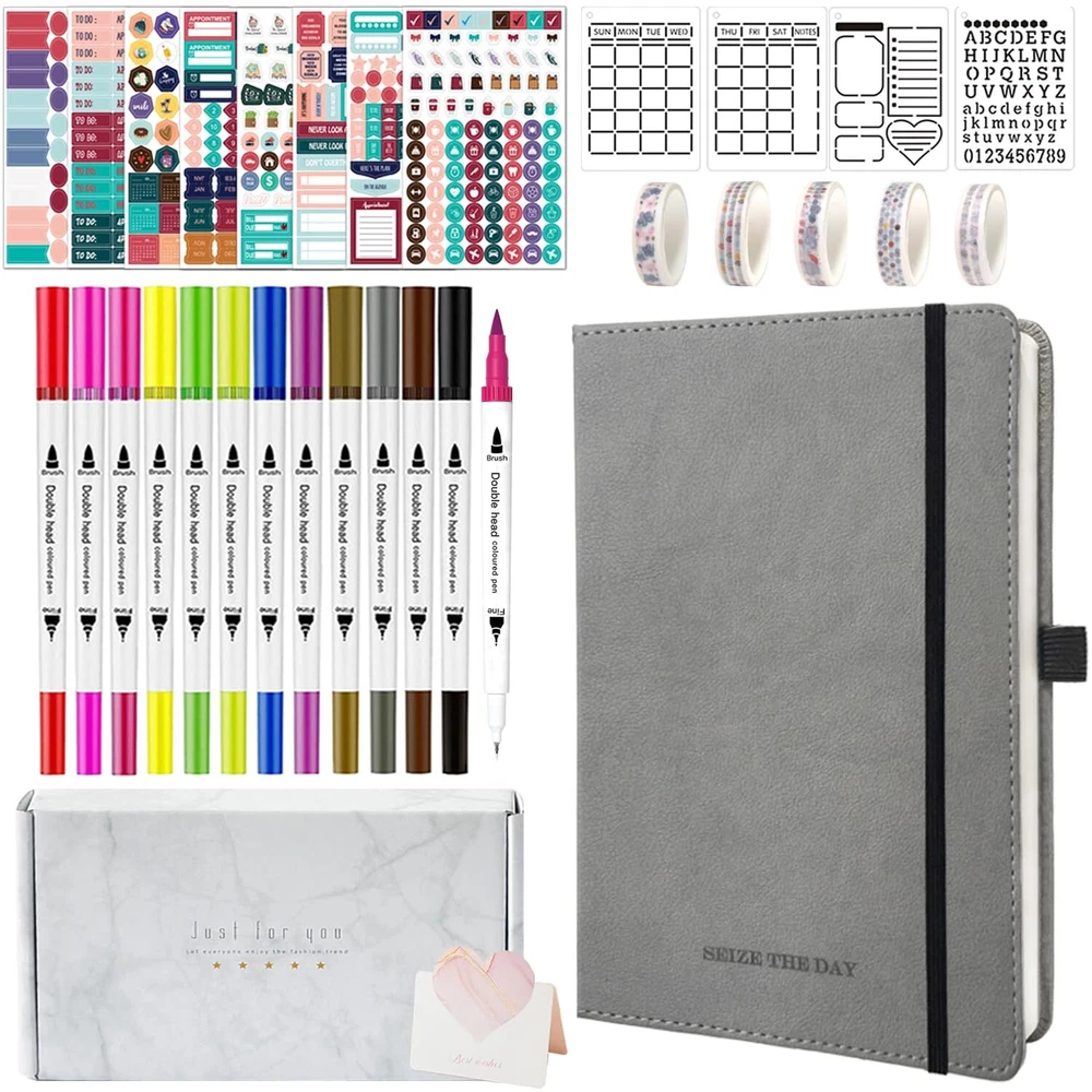 【Bullet Dotted Journal Set with Abundant Accessories】All-in-one planner notebook set with 1 A5 hardcover bullet dotted journal notebook, 12 dual tip colored pens, 8 planner sticker sheets, 4 reusable journal stencil sheets, 5 washi tapes, 2 stencil rulers, 1 gift card, 1 gift box. With this ultimate journaling set, you can design the journal of your dreams in no time! 【Premium 120GSM Thick Paper Dot Journal Notebook】This A5 journal (5.7in*8.3in*0.9in) features a vegan leather cover, 200 pages, 120GSM acid-free thick off-white paper, NO BLEED. Each page contains 925 dotted grids with X25 * Y37 dots, 5mm spacing and medium visibility. The lay-flat design is comfortable for writing and drawing, with round corners, pen holder, elastic band, 2 ribbon bookmarks and expandable inner pocket for storing important things. 【12 Dual Tip Colored Pens】These 12 dual tip colored pens are water-based and non-toxic, safe for kids. Dual tip design will add more journaling fun, the 0.4 mm fine tip for precise highlighting and details, and the flexible 1 - 2 mm brush tip for easy coloring and blending. Easy-to-hold and write smoothly, work very well, perfect for bujo journal writing and drawing. 【Amazing Stencils, Stickers and Washi Tapes】This dot journal kit contains a variety of journaling supplies, incl. 8 planner sticker sheets, 4 durable journal stencil sheets, 2 practical stencil rulers and 5 decorative washi tapes. They are especially designed to help you quickly layout your pages, and easily make your journal pages into beautiful yet functional layouts, great for daily organizing and journaling. 【Versatile Use】This dotted journal starter kit is thoughtfully designed with love and care, perfect for beginners and journal lovers. You can use these journal kits to organize your daily to-dos, track your habits, plan your goals, and express your creativity! Moreover, the bullet dotted journal kit with gift box and gift card would be a great gift for your family and friends.