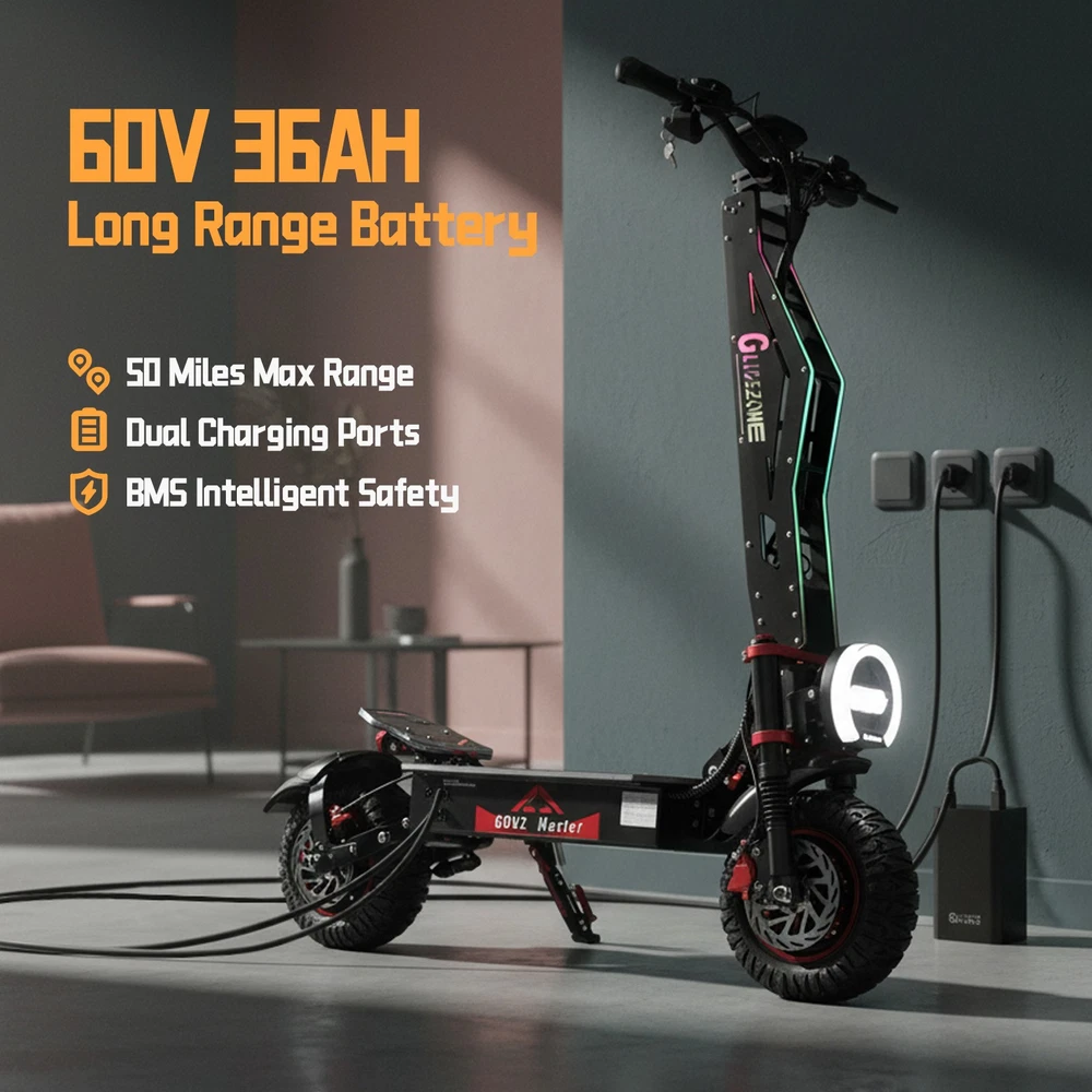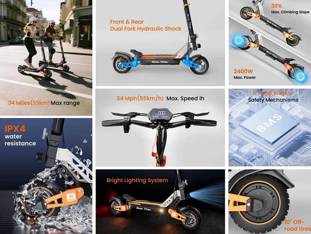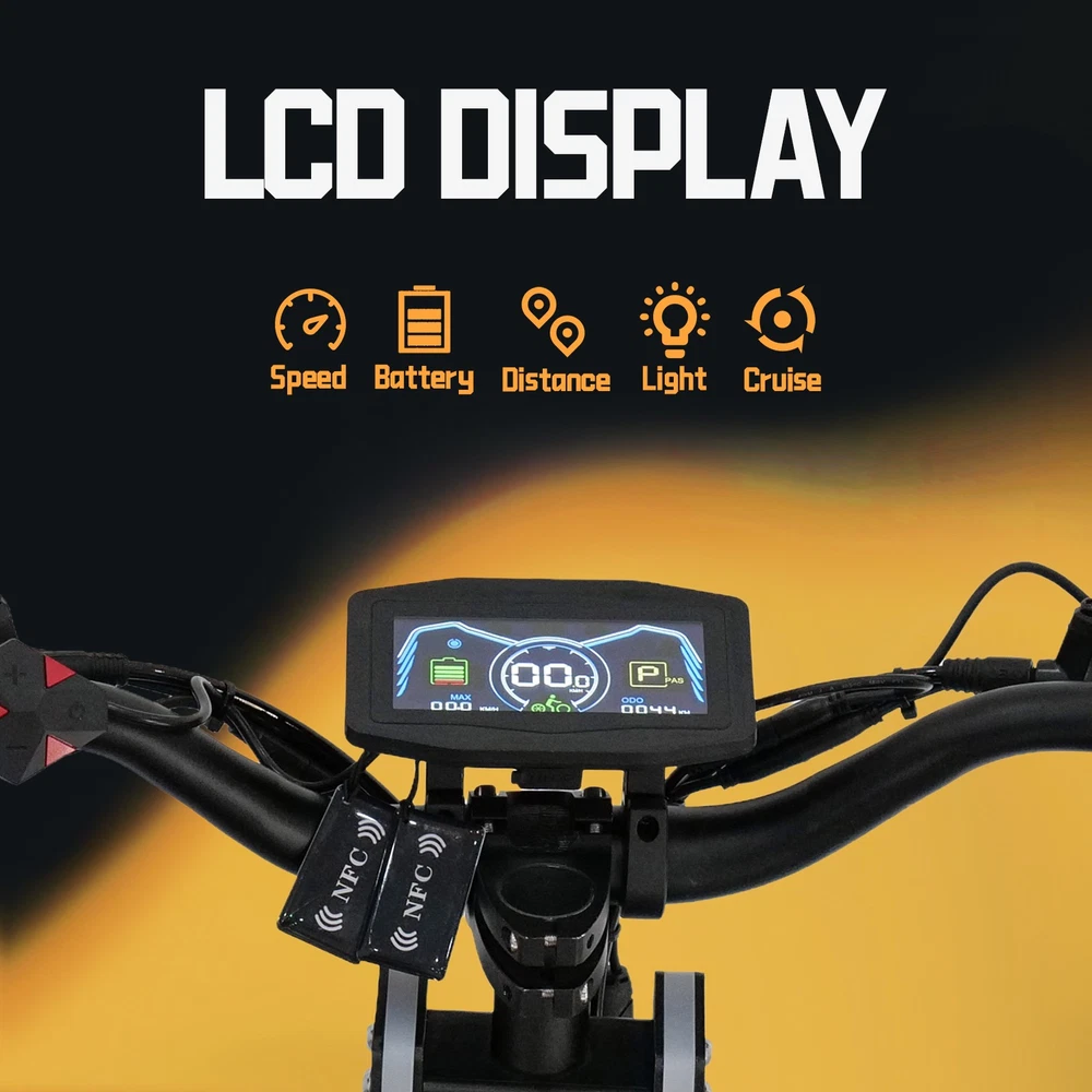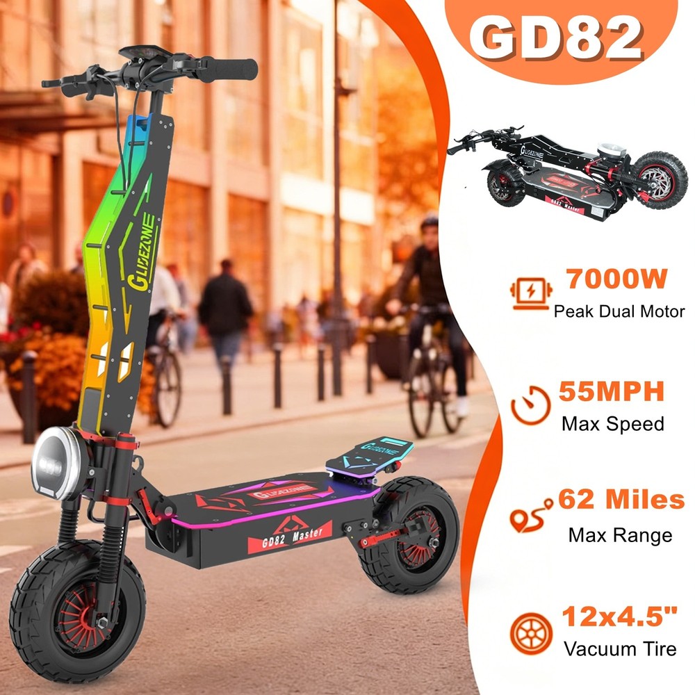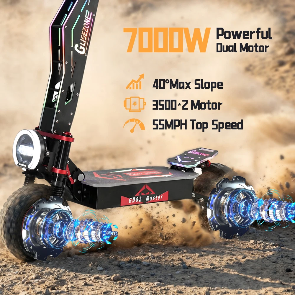 Please note: There are 2 electric scooter models available: Option 1 – GD82 7000W dual motors, 55MPH max speed, 62 miles max range, 60V/36AH battery, 330lbs max load. Equipped with NFC unlock and cruise control. Option 2 – T2 Max 1000W single motor, 28MPH max speed, 34 miles max range, 48V/15.6AH battery, 264lbs max load. Option 1 – GD82 pictures: Option 2 – T2 Max pictures: Free gift kid scooter features pictures: