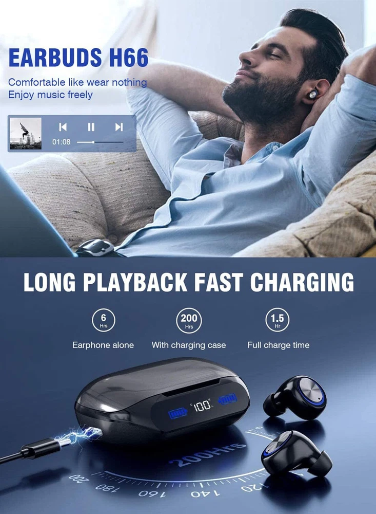【200 hours of ultra-long continuous operation & high-end LED battery remaining display】With our independently developed innovative power-saving technology and high-performance battery, our Wireless Earbuds Bluetooth can be played continuously for about 6-7 hours or more on a single charge. Plus, it comes with an integrated 2000mAh charging and storage case, allowing you to enjoy up to 200 hours of music playback. The high-end LED battery remaining display keeps you informed about the battery status, ensuring you never run out of power. 【Quick Charging: Our Wireless Earbuds Bluetooth are equipped with the best TypeC fast charging cable on the market. With a transmission speed about 2 times faster than traditional Micro USB, you can fully charge the earbuds in about 1 hour. Enjoy uninterrupted listening experiences without long waiting times. 【Bluetooth5.3 technology stable connection and instant pairing】Thanks to our advanced Bluetooth5.3 chip, our Wireless Earbuds Bluetooth offer improved battery life and connection stability. Experience a stable connection with low power consumption, low latency, and faster transmission speed. Achieve a delay rate close to "zero" for seamless audio and video synchronization. After the initial setup, the earbuds will automatically connect to your device whenever you take them out of the charging box, making it easy even for beginners to use. 【CVC8.0 Noise Cancelling and HiFi Stereo Sound Effect】 Our built-in microphone adopts advanced CVC8.0 noise cancelling technology, reducing environmental noise and echo for crystal-clear voice calls. Enjoy immersive sound quality during calls and music playback with our high-quality audio chips, preserving the original sound of the music and delivering clear high-fidelity and powerful bass stereo sound. 【IP7 Waterproof, Wide Compatibility, In-ear design for Europeans and Americans】Our Wireless Earbuds Bluetooth feature a built-in nano waterproof coating and a 7-level waterproof design, providing protection against water damage. They are perfect for various outdoor activities such as running, hiking, and jogging, even on rainy days. These earbuds are compatible with most Bluetooth-enabled devices like mobile phones, tablets, laptops, and computers. 【suitable for both left and right ears, 16.1 grams ultra-light】Designed with Europeans and Americans in mind, they offer a comfortable in-ear fit and weigh only 16.1 grams, ensuring long-lasting comfort and reducing ear fatigue. The included ear hooks made of rubber material provide excellent softness and secure fit, ensuring they stay in place during any activity.
