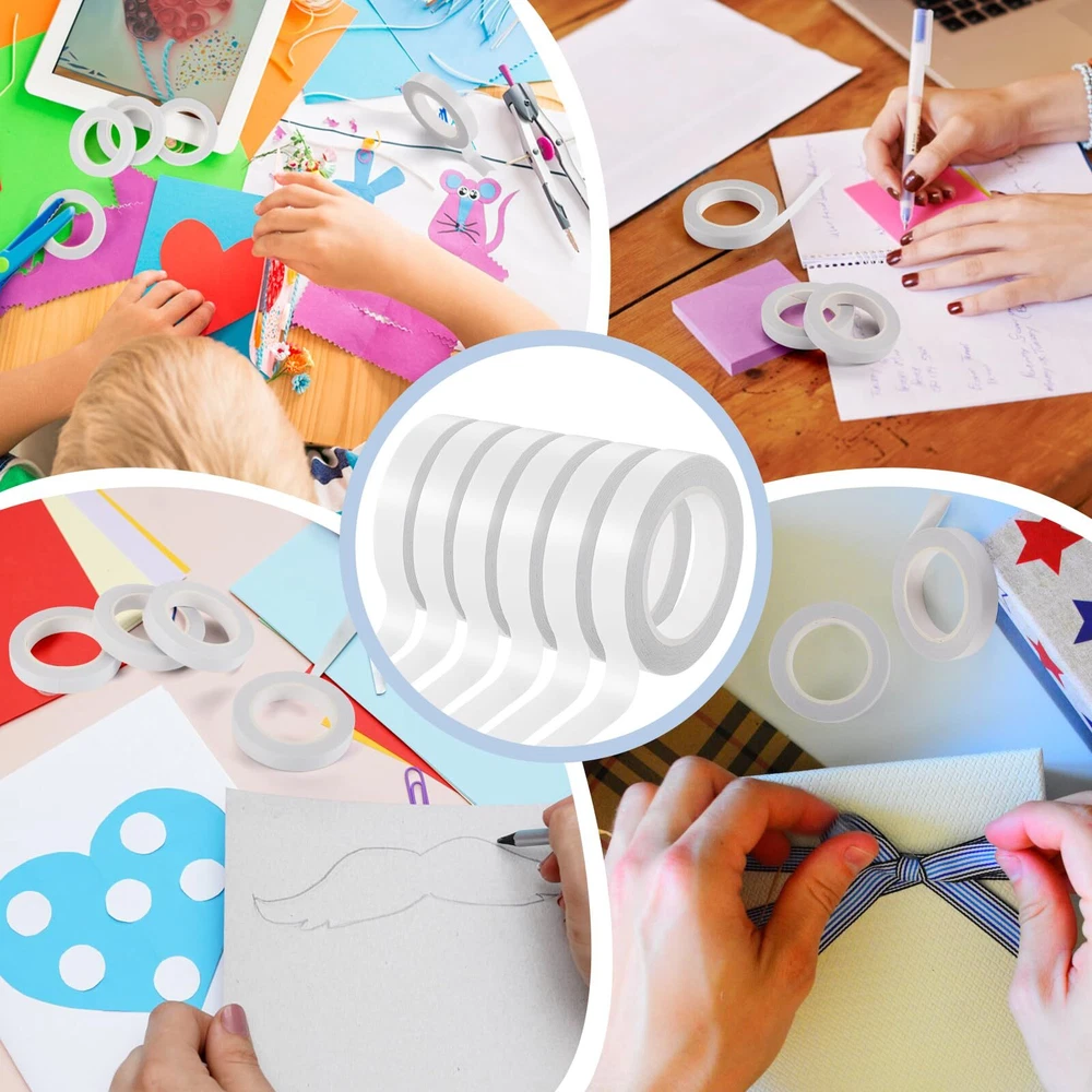 PRODUCT DETAILS Quantity: 6pcs Color: White Product material: PTFE Gross weight: 3.73oz Net weight: 3.13 oz Product size: 7.08 x 4.7 x 0.47in Package size: 7.08x 4.7 x 0.47 in This craft tape is a double stick tape, Made of high-quality thin paper and strong adhesive. thin double sided tape, strong double sided tape, it has strong viscosity and can easily fix two objects together. Double side tape for crafts can be easily teared by hand. The service life is longer than ordinary tape. Heat resistant, glue is not easily lost in hot weather. This double-sided tape for crafts has a wide range of applications, Double sided tape can be widely used in family life and school. Double sided adhesive tape for crafts, scrapbooks, boxes, ribbons, documents, origami, decorations, stamps, wallpapers, paper, card making, gifts and gift box packaging. This white double-sided tape is an essential glue tape for DIY. This strong double sided tape can be applied to most surfaces, such as wood, paper, fabrics, glass, metal, paint, PVC, marble, clothing, fabrics, walls, and plastics, making it very suitable for bonding various similar and different materials together. It is a double-sided tape with a wide range of uses. You will receive 6 rolls of white strong double-sided tape, scrapbook tape, 2/5 inches X26.25 feet, long enough to meet your adhesive and work process needs, easy to use, and can easily tear off double-sided tape by hand without the need for scissors. After removal, there will be no sticky residue left. For better adhesion, please keep the surface of the object clean and smooth before applying double-sided tape, the glue tape can be completed.