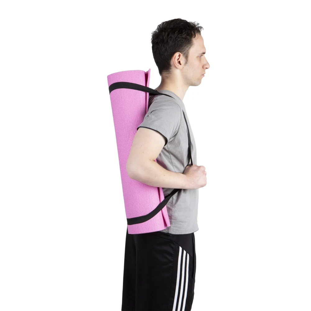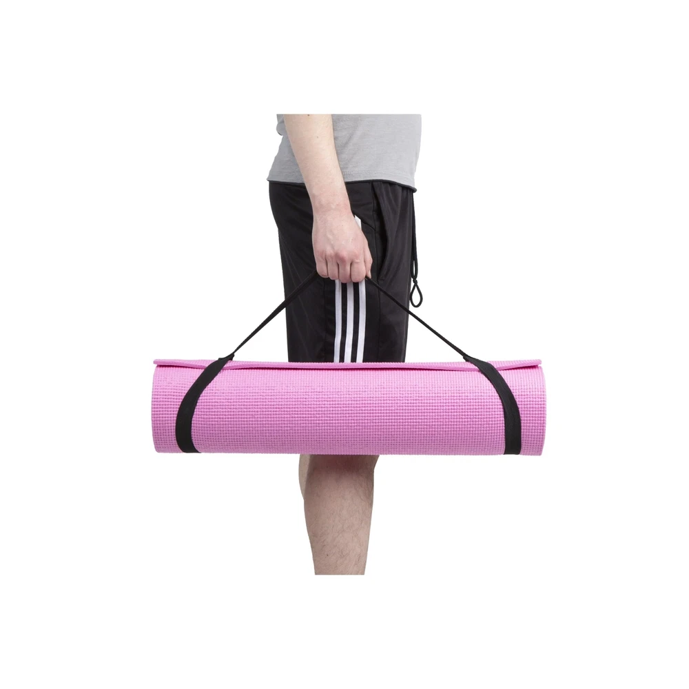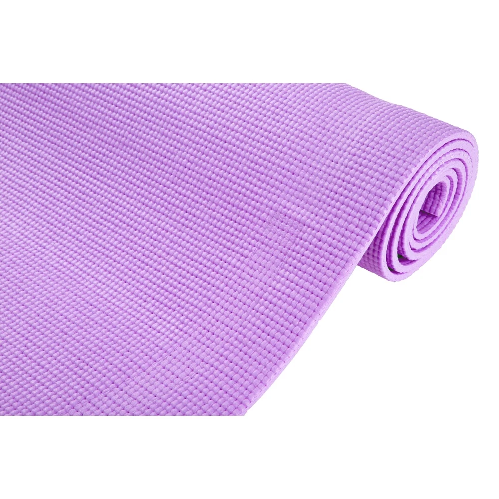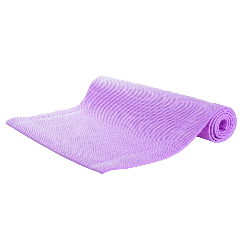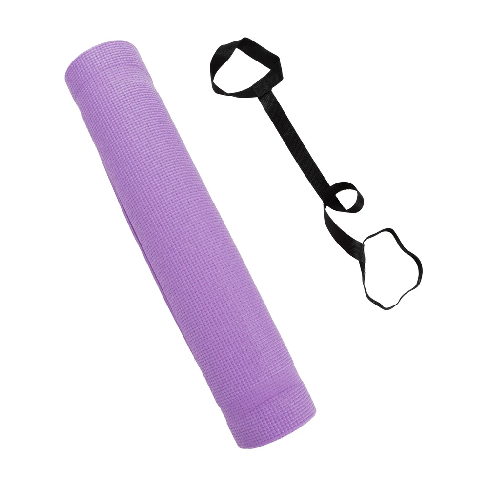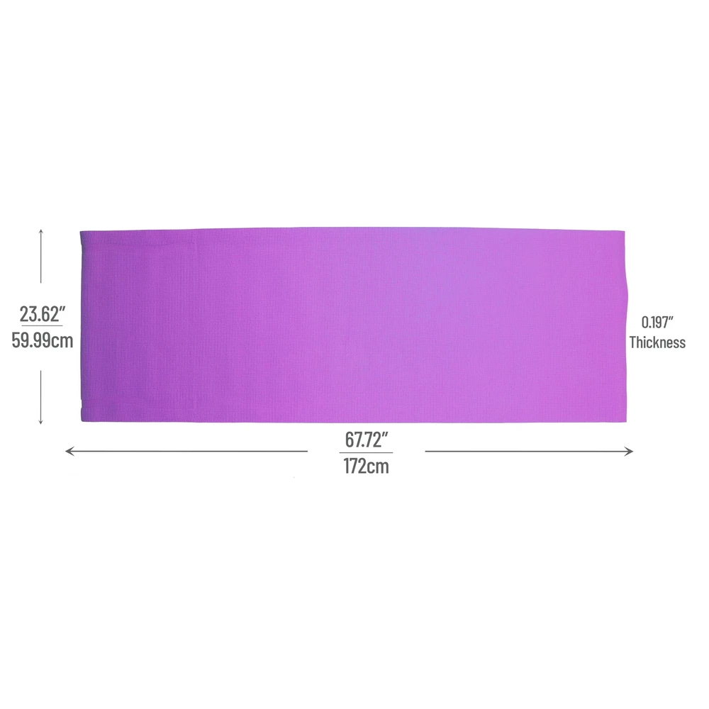 1/4” Thick All-Purpose Mat With high density foam material, the 1/4” premium mat comfortably cushions spine, hips, knees, and elbows on hard floor. Thicker than most other PVC mats on the market, The Yoga Mat will serve its purpose and provide maximum comfort and cushion for your workout routine. An Anti-Tear Yoga Exercise Mat With integrated anti-tearing net and high quality material, you may use this mat for all types of yoga poses and exercise routines without the worry of damaging the cushioned floor mat. Made with attention to details so that you can focus on your workout routine and get that body into tip-top shape. Extremely Easy To Clean The All-Purpose Exercise Mat is super easy to clean and maintain. The moisture resistant technology and superior quality material make the mat easy to wash with mild soap and water. Can be wiped down wipes like Lysol / Clorox or any other type of disinfectant wipe Carrying Handle Included Equipped with a carrying strap for your convenience. Easily bring your yoga exercise mat to the gym, pilates class, the park, or your friends house for a friendly workout session. When yoga mat is not in use, you can conveniently roll up the mat and store it in a utility closet for easy storing. Specifications Color: Purple Material: PVC Assembly Required? No assembly is required. Dimensions: 68” L x 24” W x 0. 3” H The Perfect Size for Your Workout Routine - 68" Long and 24" wide ensures comfort for all types of exercise. With high density material, the 1/4" thick premium mat comfortably cushions spine, hips, knees, and elbows on hard floors while keeping you balanced. Multi-Purpose Mat - A premium mat that is great for all types of fitness and exercise routines including yoga, pilates, and any floor exercise where additional cushion and support is needed. Double Sided Non-Slip - Equipped with dual side non slip surface which is perfect for gym junkies who really are passionate about their workouts. All-purpose premium exercise yoga mat comes with an excellent slip resistant advantage to prevent injuries. Superb Resilience - Our exercise fitness mat allows you to keep your balance during any exercise styles. Moisture resistant technology makes the mat perfect for heavy sweaters and can be easily washed with mild soap and water. Dimensions: 68 (L) x 24 (W) x 0. 3 (H) Includes Free Carrying Strap - Easily travel with your yoga mat to the gym or pilates class with the included carrying strap. The easy strapping and light weight feature are added to this mat at no extra cost for easy transport and storage. Non-Toxic Premium Material - Constructed of PVA material that is a much healthier choice for you and the environment. PVC is waterproof friendly and holds shape really well. Easy to wash making it ideal for indoor or outdoor exercises. Textured Surface Mat - Our yoga mat has a textured surface for enhanced traction at the gym or in your home. For the heavy sweaters, this is perfect because your moisture will not be a factor when using the gym mat. Lightweight But Durable - Designed to withstand everyday use for tons of usage. Our yoga mat is both light weight but strong. Integrated with anti-tearing net and high quality material so you can use this mat for most yoga poses and exercise activities. Extra Thick - The thick layer cushions your feet when standing and stretching. It supports your body throughout all types of exercising routines and especially during restorative yogi poses.