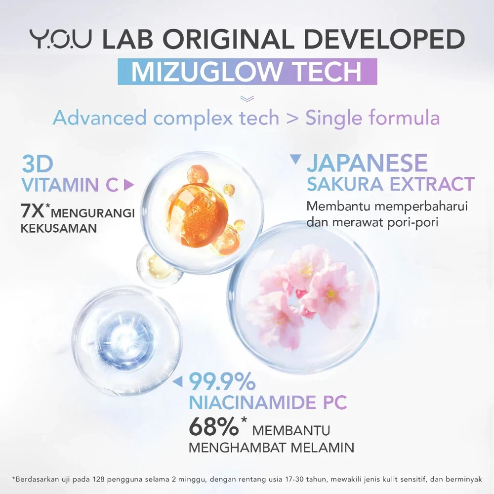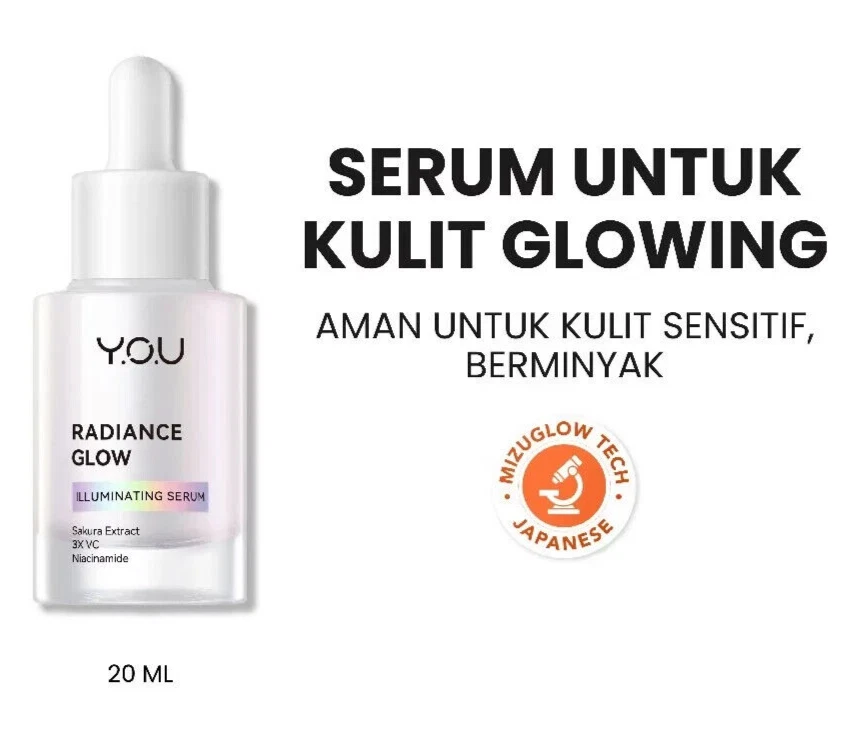 Radiance Glow Illuminating Serum, a brightening serum with a light texture and is not sticky on the skin formulated with 3X Vitamin C, Niacinamide, Sakura Extract, and Bisabolol. Benefits: - Reduces the appearance of dull skin, for bright, radiant skin - Brightens the skin without causing a stinging sensation on the skin (safer content for sensitive skin) - Soothes the skin Main Ingredients: 1. 3X Vitamin C: Contains 3 types of Vitamin C (Ascorbyl Tetraisopalmitate, Magnesium Ascorbyl Phosphate, and 3-O-Ethyl Ascorbic Acid) which help brighten the skin and act as antioxidants 2. Niacinamide: Treats hyperpigmentation and reduces the appearance of pores 3. Sakura Extract: Brightens the skin 4. Bisabolol: Helps soothe the skin Skin type: Sensitive skin Net: 20ml