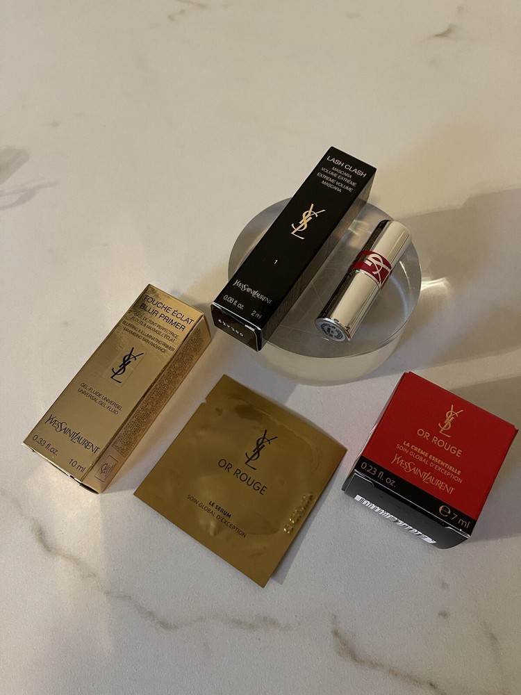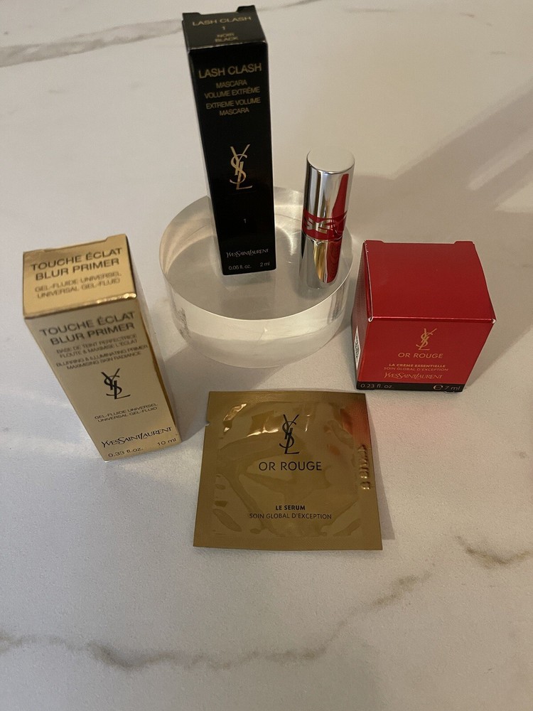 YSL 5 Pc Gift Set Yves Saint Laurent With Makeup Pouch NEW! -Yves Saint Laurent YSL Touche Eclat Blur Primer 0.33 fl.oz. 10ml. Mini Brand Yves Saint Laurent Product Benefits Brightening Item Form Serum Skin Type All Package Information Bottle Finish Type Natural .33 oz. Mini Suitable for all skin types Smooths and blurs imperfections, and enhances the radiance of your favorite foundation. -LE SERUM 0.03 fl .oz .1ml. -Lip moisturizer small size . -Yves Saint Laurent Or Rouge Crème Riche; WHAT IT IS: A crème made in France to help maximize rich hydration; it is essential for dramatic skin renewal on dryer skin WHAT IT DOES: Crème Riche moisturizing cream is formulated to replenish moisture and defend against fine lines and wrinkles INGREDIENT HIGHLIGHTS: The powerful pistils of the saffron flower help revive skin cell energy HOW TO USE: Warm the formula for a few seconds between your fingers, then press gently into the skin. Size ;0.23fl.oz .7ml -Yves Saint Laurent Lash Clash Extreme Volume Mascara; RESEARCH RESULTS: In a self-assessment test of 100 women: 96% said product wears for up to 24 hours 93% said brush catches all lashes 90% said brush spreads formula evenly Ophthalmologist tested and suitable for sensitive eyes and contact lens wearers. Size ;0.06 fl .0z. 2ml